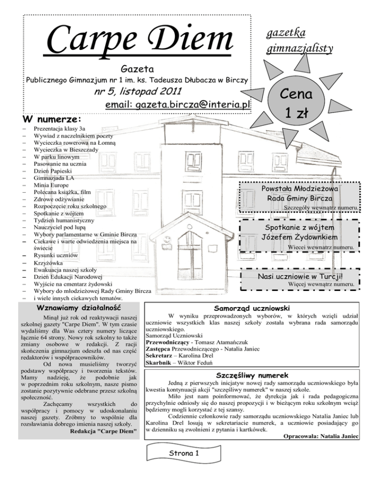 Carpe Diem gazetka gimnazjalisty Gazeta Publicznego Gimnazjum nr 1 im. ks. Tadeusza Dłubacza w Birczy nr 5, listopad 2011 email: [email protected] W numerze: Prezentacja klasy 3a Wywiad z naczelnikiem poczty Wycieczka rowerowa na Łomną Wycieczka w Bieszczady W parku linowym Pasowanie na ucznia Dzień Papieski Gimnazjada LA Minia Europe Polecana książka, film Zdrowe odżywianie Rozpoczęcie roku szkolnego Spotkanie z wójtem Tydzień humanistyczny Nauczyciel pod lupą Wybory parlamentarne w Gminie Bircza Ciekawe i warte odwiedzenia miejsca na świecie Rysunki uczniów Krzyżówka Ewakuacja naszej szkoły Dzień Edukacji Narodowej Wyjście na cmentarz żydowski Wybory do młodzieżowej Rady Gminy Bircza i wiele innych ciekawych tematów. Cena 1 zł Powstała Młodzieżowa Rada Gminy Bircza Szczegóły wewnątrz numeru. Spotkanie z wójtem Józefem Żydownkiem Więcej wewnątrz numeru. Nasi uczniowie w Turcji! Więcej wewnątrz numeru. Wznawiamy działalność Samorząd uczniowski Minął już rok od reaktywacji naszej szkolnej gazety "Carpe Diem". W tym czasie wydaliśmy dla Was cztery numery liczące łącznie 64 strony. Nowy rok szkolny to także zmiany osobowe w redakcji. Z racji skończenia gimnazjum odeszła od nas część redaktorów i współpracowników. Od nowa musieliśmy tworzyć podstawy współpracy i tworzenia tekstów. Mamy nadzieję, że podobnie jak w poprzednim roku szkolnym, nasze pismo zostanie pozytywnie odebrane przesz szkolną społeczność. Zachęcamy wszystkich do współpracy i pomocy w udoskonalaniu naszej gazety. Zróbmy to wspólnie dla rozsławiania dobrego imienia naszej szkoły. Redakcja "Carpe Diem" W wyniku przeprowadzonych wyborów, w których wzięli udział uczniowie wszystkich klas naszej szkoły została wybrana rada samorządu uczniowskiego. Samorząd Uczniowski Przewodniczący - Tomasz Atamańczuk Zastępca Przewodniczącego - Natalia Janiec Sekretarz – Karolina Drel Skarbnik – Wiktor Feduń Szczęśliwy numerek Jedną z pierwszych inicjatyw nowej rady samorządu uczniowskiego była kwestia kontynuacji akcji "szczęśliwy numerek" w naszej szkole. Miło jest nam poinformować, że dyrekcja jak i rada pedagogiczna przychylnie odniosły się do naszej propozycji i w bieżącym roku szkolnym wciąż będziemy mogli korzystać z tej szansy. Codziennie członkowie rady samorządu uczniowskiego Natalia Janiec lub Karolina Drel losują w sekretariacie numerek, a uczniowie posiadający go w dzienniku są zwolnieni z pytania i kartkówek. Opracowała: Natalia Janiec Strona 1 Dziesięciolecie nadania imienia. Święto patrona. Pasowanie na uczniów. 29 września odbyło się pasowanie pierwszoklasistów na uczniów naszego gimnazjum. Pasowanie połączone było ze świętem patrona ks. prał. płk Tadeusza Dłubacza oraz dziesięcioleciem nadania jego imienia Publicznemu Gimnazjum nr 1 w Birczy. O godzinie 10:20 uczniowie klas pierwszych wyjechali na uroczystość do miejscowości Łomna. Tam odprawiona została msza święta w Letnim Ośrodku Caritas Ordynariatu Polowego WP. Honorowymi gośćmi było rodzeństwo ks. T. Dłubacza, od którego dostaliśmy tablice pamiątkową z napisem „Tyle się Boga ludziom daje ile się w sercu ma”. Uczniowie oraz absolwenci naszego gimnazjum wraz z panem Grzegorzem Kwaśnickim przygotowali akademię i oprawę muzyczną mszy. Po akademii odbyło się pasowanie. Przedstawiciele klas pierwszych złożyli ślubowanie na sztandar. Następnie wszyscy podeszli do obelisku, gdzie zapalili znicze i położyli kwiaty. Po zakończonych uroczystościach uczniowie udali się na ognisko. Natomiast goście zostali zaproszeni na poczęstunek. Cała uroczystość przebiegała w atmosferze podniosłego i radosnego święta. Opracowała: Aleksandra Rutkowska Nasza młodzież w Bieszczadach Uczniowie naszego gimnazjum wraz z opiekunami Emilią Pawlus, Teresą Feduń i Katarzyną Oręczak wzięli udział w kolejnym już XXXIV wojewódzkim zlocie młodzieży PTSM w Bieszczadach w dniach 28.09-01.10.2011 r. W środę przed godziną 8:00 wszyscy uczestnicy rajdu zebrali się przed budynkiem szkoły, skąd wyjechaliśmy do Schroniska Młodzieżowego w Lutowiskach. Tam mieliśmy okazję zapoznać się z grupą z ZS w Krempnej, a także z naszym przewodnikiem, który oprowadzał nas po pięknych Bieszczadach. Nie czekając długo udaliśmy się do Bieszczadzkiego Parku Krajobrazowego, gdzie mogliśmy podziwiać piękno bieszczadzkiej przyrody. Udało się nam także zdobyć pasmo górskie takim jakim jest Otryt (896 m). W czasie drogi było bardzo wesoło, choć chwilami było naprawdę ciężko. Wszyscy wróciliśmy do schroniska około godz. 19:00. Po bardzo wyczerpującym dniu udaliśmy się do swoich łóżek, by nabrać sił przed kolejnym dniem. Następnego dnia po śniadaniu, udaliśmy się autobusem do Pszczeliny, skąd wyruszyliśmy na Tarnicę (1346 m), mimo zmęczenia, każdemu z nas podobały się piękne widoki, których z pewnością nigdy nie zapomnimy. W kolejnym etapie wędrówki udaliśmy się na drugi pod względem wysokości szczyt polskich Bieszczad-Krzemień (1335 m), po czym wróciliśmy do schroniska. Mimo, że dzień był bardzo wyczerpujący, to przekonałyśmy nasze opiekunki, aby zorganizować dyskotekę. W piątek wszyscy spakowaliśmy się i wyjechaliśmy do Leska, tam po zakwaterowaniu w pokojach udaliśmy się wraz z panią Emilią Pawlus na spacer, podczas którego mogliśmy zwiedzić miasto. Około godziny 17:00 rozpoczęły się konkursy, w których udział wzięli uczniowie naszej szkoły m.in. w konkursie prezentującym naszą gminę i środowisko szkolne, gdzie zajęliśmy I miejsce. W ostatni dzień zlotu, zostały podsumowane wszystkie konkursy oraz odbyło się wręczenie nagród. Dziękujemy bardzo pani Emilii Pawlus za zorganizowanie rajdu oraz naszym opiekunkom, które sprawowały nad nami opiekę. Jesteśmy zadowoleni, że mogliśmy wziąć udział w tak wspaniałym wydarzeniu, bo było nap