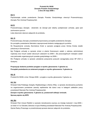 Protokół Nr 56/08 Zarządu Powiatu Gostyńskiego z dnia 29 maja 2008 r. Ad 1) Pięćdziesiąte szóste posiedzenie Zarządu Powiatu Gostyńskiego otworzył Przewodniczący Zarządu Pan Andrzej Pospieszyński. Ad 2) Przewodniczący Zarządu stwierdził, że Zarząd jest władny podejmować uchwały, gdyż jest zachowane quorum. Lista obecności stanowi załącznik do protokołu. Ad. 3) Przewodniczący Zarządu przedstawił proponowany porządek posiedzenia Zarządu. Do porządku posiedzenia Sekretarz zaproponował dodanie następujących punktów: 5l) Rozpatrzenie wniosku Burmistrza Krobi w sprawie przejęcia przez Gminę Krobia działki położonej w Domachowie, 6g) Podjęcie uchwały w sprawie zmian w planie finansowym zadań z zakresu administracji rządowej oraz innych zadań zleconych ustawami na 2008 r. dla poszczególnych rodzajów zadań oraz jednostek organizacyjnych powiatu gostyńskiego na 2008 r. 6h) Podjęcie uchwały w sprawie udzielenia poręczenia pożyczki zaciągniętej przez SP ZOZ w Gostyniu. Propozycje dodania punktów przyjęto w wyniku głosowania: 5 głosów za. Porządek posiedzenia ze zmianami przyjęto w wyniku głosowania: 5 głosów za. Ad. 4) Protokół Nr 55/08 z dnia 15maja 2008 r. przyjęto w wyniku głosowania: 5 głosów za. Ad. 5a) Wniosek Koła Polskiego Związku Wędkarskiego w Borku Wlkp. w sprawie ufundowania pucharów na organizowane powiatowe zawody wędkarskie dla dzieci oraz w kategorii zakładów pracy przedstawił Starosta Pan Andrzej Pospieszyński. Zarząd w wyniku głosowania: 5 głosów za, postanowił odłożyć wniosek. Sprawą zajmie się BPR. Ad. 5b) Wniosek Pani Urszuli Redlich w sprawie nienaliczania czynszu za miesiąc kwiecień i maj 2008 r. za lokal nr 5 w Ośrodku Zdrowia w Łęce Wielkiej przedstawił Starosta Pan Andrzej Pospieszyński. Opinia Radcy Prawnego w przedmiotowej sprawie stanowi załącznik do protokołu. Sekretarz wyjaśnił, że nadal obowiązuje uchwała Nr XXXIV/217/01 Rady Powiatu Gostyńskiego z dnia 30 sierpnia 2001 r. w sprawie szczegółowych zasad trybu umarzania, odraczania lub rozkładania na raty spłat należności pieniężnych jednostek organizacyjnych powiatu gostyńskiego, do których nie stosuje się przepisów ustawy – Ordynacja podatkowa. Zgodnie z tą uchwałą nie ma podstaw do umorzenia należności. W związku z powyższym Zarząd w wyniku głosowania: 5 głosów za, rozpatrzył wniosek negatywnie. Sprawą zajmie się WZI.AD. Ad. 5c) Wniosek Szkoły Podstawowej im. Edmunda Bojanowskiego w Wycisłowie w sprawie sfinansowania zakupu nagród dla uczestników imprezy OLIMP 2008 przedstawił Członek Zarządu Pan Jerzy Ptak. Opinia BPR stanowi załącznik do protokołu. Zarząd w wyniku głosowania: 5 głosów za, rozpatrzył wniosek negatywnie z powodu braku środków. Ponadto w związku z tym, że uczestnicy jak i organizatorzy to przedstawiciele szkół podstawowych, które nie są jednostkami organizacyjnymi powiatu Zarząd proponuje zwrócić się z wnioskiem o dofinansowanie do gminy Borek. Odpowiedź przygotuje BPR. Ad. 5d) Wniosek jednostek organizacyjnych powiatu gostyńskiego mających swoją siedzibę w budynku przy ul. Poznańskiej 200 w Gostyniu w sprawie zagospodarowania terenu oraz wyznaczenia miejsc parkingowych dla pracowników jednostek i klientów przedstawił Sekretarz Pan Leszek Maliński. Opinia Naczelnika WZI stanowi załącznik do protokołu. Wyznaczenie miejsc parkingowych jest możliwe w miejscu gdzie obecnie są parkowane pojazdy oraz wyznaczenie dodatkowych 10 miejsc parkingowych z tyłu budynku poprzez oznaczenie miejsc farbą akrylową. Z uwagi na brak środków w budżecie Naczelnik WZI proponuje wykonanie prac przy udziale Powiatowego Zarządu Dróg w Gostyniu. Zarząd w wyniku głosowania: 5 głosów za, postanowił aby sprawą zajął się Wydział Zarządzania i Inwestycji i opracował plan zagospodarowania przedmiotowego terenu oraz wyliczył przybliżone koszty inwestycji i przedstawił propozycje ujęcia przedmiotowej inwestycji w budżecie na lata kolejne. Sprawą zajmie się WZI. Ad. 5e) 2 Wniosek Narodowego Funduszu Zdrowia Oddział Wojewódzki w Poznaniu delegatura w Lesznie w sprawie wskazania pomieszczenia do obsługi ubezpieczonych w zakresie rejestracji usług medycznych przedstawił Starosta Pan Andrzej Pospieszyński. Opinia WZI.AD stanowi załącznik do protokołu. Z opinii Wydziału wynika, że rozeznanie przeprowadzono z panem Maciejem Nowakiem pracownikiem szpitala, który poinformował, że obecnie szpital nie dysponuje wolnymi pomieszczeniami, które mógłby udostępnić na tego typu działalność. Ponadto Starostwo w chwili obecnej nie posiada również wolnych pomieszczeń. Po ewentualnym wyprowadzeniu Wydziału Oświaty do pomieszczeń uzyskanych po Powiatowym Ośrodku Geodezji i Kartografii. Zwolnione zostaną trzy pomieszczenia o ogólnej powierzchni 72 m2 niezależne mieszczące się na parterze w budynku w Pastorówce. W przypadku zaakceptowania ww. propozycji należy ustalić stawkę czynszu. Zarząd w wyniku głosowania: 5 głosów za, postanowił że Wydział WZI zajmie się wyszukaniem odpowiednich pomieszczeń , ponieważ w chwili obecnej nie jest w stanie ich wskazać. Decyzja w powyższej sprawie zostanie podjęta w III kwartale 2008 r. Odpowiedź do wnioskodawcy przygotuje WZI.AD. Ad. 5f) Wniosek Bractwa Kurkowego w Krobi w sprawie sfinansowania zakupu tarczy strzeleckiej oraz pucharów w związku z organizowanym Turniejem o Króla i Mistrza Okręgu Leszczyńskiego przedstawił Członek Zarządu Pan Jerzy Ptak. Opinia BPR stanowi załącznik do protokołu. Zarząd w wyniku głosowania: 5 głosów za, rozpatrzył wniosek negatywnie z powodu braku środków. Odpowiedź przygotuje BPR. Ad. 5g) Wniosek Redakcji „Granady Marysińskiej” Gazety Wolontariatu Marysina w sprawie dofinansowania druku gazetki przedstawił Członek zarządu Pan Jerzy Ptak. Opinia BPR stanowi załącznik do protokołu. Pan Jerzy Ptak poinformował, 