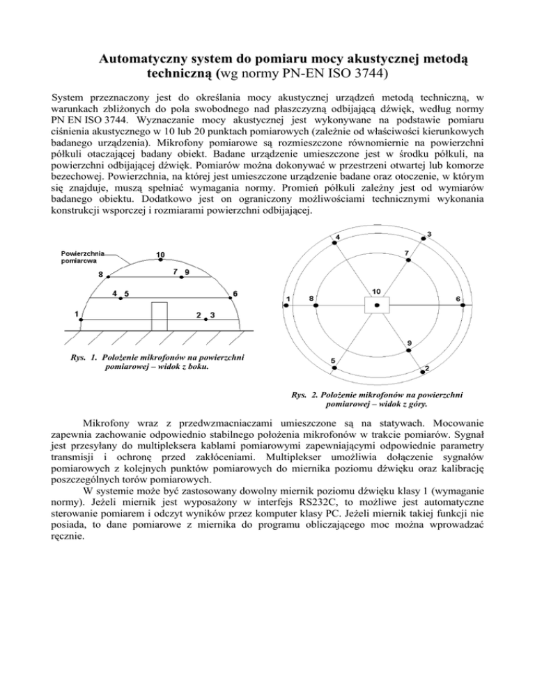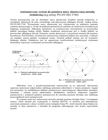 Automatyczny system do pomiaru mocy akustycznej metodą techniczną (wg normy PN-EN ISO 3744) System przeznaczony jest do określania mocy akustycznej urządzeń metodą techniczną, w warunkach zbliżonych do pola swobodnego nad płaszczyzną odbijającą dźwięk, według normy PN EN ISO 3744. Wyznaczanie mocy akustycznej jest wykonywane na podstawie pomiaru ciśnienia akustycznego w 10 lub 20 punktach pomiarowych (zależnie od właściwości kierunkowych badanego urządzenia). Mikrofony pomiarowe są rozmieszczone równomiernie na powierzchni półkuli otaczającej badany obiekt. Badane urządzenie umieszczone jest w środku półkuli, na powierzchni odbijającej dźwięk. Pomiarów można dokonywać w przestrzeni otwartej lub komorze bezechowej. Powierzchnia, na której jest umieszczone urządzenie badane oraz otoczenie, w którym się znajduje, muszą spełniać wymagania normy. Promień półkuli zależny jest od wymiarów badanego obiektu. Dodatkowo jest on ograniczony możliwościami technicznymi wykonania konstrukcji wsporczej i rozmiarami powierzchni odbijającej. Rys. 1. Położenie mikrofonów na powierzchni pomiarowej – widok z boku. Rys. 2. Położenie mikrofonów na powierzchni pomiarowej – widok z góry. Mikrofony wraz z przedwzmacniaczami umieszczone są na statywach. Mocowanie zapewnia zachowanie odpowiednio stabilnego położenia mikrofonów w trakcie pomiarów. Sygnał jest przesyłany do multipleksera kablami pomiarowymi zapewniającymi odpowiednie parametry transmisji i ochronę przed zakłóceniami. Multiplekser umożliwia dołączenie sygnałów pomiarowych z kolejnych punktów pomiarowych do miernika poziomu dźwięku oraz kalibrację poszczególnych torów pomiarowych. W systemie może być zastosowany dowolny miernik poziomu dźwięku klasy 1 (wymaganie normy). Jeżeli miernik jest wyposażony w interfejs RS232C, to możliwe jest automatyczne sterowanie pomiarem i odczyt wyników przez komputer klasy PC. Jeżeli miernik takiej funkcji nie posiada, to dane pomiarowe z miernika do programu obliczającego moc można wprowadzać ręcznie. ... Rys. 3. Schemat blokowy systemu. Program komputerowy umożliwia komunikację z urządzeniami systemu poprzez interfejs RS232C, sterowanie nimi i ich konfigurowanie. Jego głównym celem jest automatyczne przeprowadzenie pomiarów, obliczenie mocy akustycznej badanego obiektu oraz wygenerowanie raportu (protokołu badań). Chwilowe wartości mierzonego poziomu ciśnienia akustycznego można na bieżąco śledzić w postaci stabelaryzowanej oraz wykresów słupkowych w funkcji czasu lub pozycji mikrofonu na sferze pomiarowej. W przypadku pomiaru w pasmach widmowych (oktawowych lub 1/3 oktawowych) dostępna jest wizualizacja zarówno poszczególnych pasm, jak również ich sumy w funkcji czasu, pozycji mikrofonu oraz częstotliwości. R ys. 6 R ys. 7 R ys. 5 R ys. 8 Rys. 4. Wybór funkcji wyświetlania wyników. Dodatkowo obliczane jest odchylenie standardowe odtwarzalności za czas pomiaru dla każdej pozycji mikrofonu oraz dla średniej z powierzchni pomiarowej. Odchylenia przekraczające wprowadzone przez użytkownika wartości graniczne są sygnalizowane. Program określa poprawność kwalifikacji środowiska badawczego oraz ocenia spełnienie kryteriów określonych w normie. W przypadku nie spełnionych warunków możliwe jest dalsze uśrednianie poziomu ciśnienia akustycznego poprzez wprowadzanie dodatkowych cykli pomiarowych. Ponadto dostępna jest archiwizacja zarówno danych pomiarowych, jak również wprowadzonych poprawek widmowych. Możliwe jest również zinterpretowanie badanego obiektu jako źródła wzorcowego, co w połączeniu z wprowadzonymi wartościami nominalnymi mocy akustycznej pozwala na późniejsze pobieranie automatycznie obliczonej poprawki środowiskowej. Rys. 5. Wizualizacja wyników w funkcji częstotliwości. Rys. 6. Wizualizacja wyników w funkcji czasu. Rys. 7. Wizualizacja wyników w funkcji pozycji mikrofonu. Rys. 8. Wizualizacja wyników w pasmach widmowych w funkcji czasu i pozycji mikrofonu. Przypadkowe zakłócenia można usuwać z tabeli pomiarów i ponownie je przywracać po odznaczeniu/zaznaczeniu wskaźnika ich użycia: . Wartość końcowa mocy akustycznej jest wówczas automatycznie przeliczana. Opisane wyżej możliwości programu sterującego Systemem Pomiaru Mocy Akustycznej pozwalają na scharakteryzowanie badanego obiektu pod względem: określenia własnego cyklu pracy, kierunkowości emitowanego hałasu, widma mocy akustycznej.