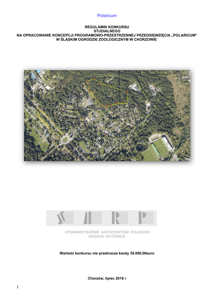 Polaricum le.pl REGULAMIN KONKURSU STUDIALNEGO NA OPRACOWANIE KONCEPCJI PROGRAMOWO-PRZESTRZENNEJ PRZEDSIĘWZIĘCIA „POLARICUM” W ŚLĄSKIM OGRODZIE ZOOLOGICZNYM W CHORZOWIE STOWARZYSZENIE ARCHITEKTÓW POLSKICH ODDZIAŁ KATOWICE Wartość konkursu nie przekracza kwoty 30.000,00euro Chorzów, lipiec 2016 r 1 Polaricum SPIS TREŚCI DZIAŁ I. PODSTAWOWE INFORMACJE O KONKURSIE Rozdział 1. Organizator, Zamawiający, podstawa prawna, forma i przedmiot konkursu. Rozdział 2. Warunki uczestnictwa w konkursie. Rozdział 3. Terminy. Rozdział 4. Nagrody. Rozdział 5. Sąd Konkursowy. Rozdział 6. Sposób porozumiewania się z Organizatorem i wyjaśniania treści Regulaminu Konkursu. DZIAŁ II. SKŁADANIE WNIOSKU O DOPUSZCZENIE DO UDZIAŁU W KONKURSIE Rozdział 7. Forma i sposób składania Wniosku o dopuszczenie do udziału w konkursie. Rozdział 8. Wymagane dokumenty na etapie składania Wniosku o dopuszczenie do udziału w konkursie. Rozdział 9. Zmiana, wycofanie, uzupełnienie i zwrot wniosku. DZIAŁ III. SKŁADANIE PRACY KONKURSOWEJ Rozdział 10. Forma opracowania, zakres oraz sposób prezentacji pracy konkursowej. Rozdział 11. Miejsce i sposób składania prac konkursowych. Rozdział 12. Kryteria i znaczenie kryteriów oceny prac konkursowych. Rozdział 13. Wytyczne merytoryczne - szczegółowe uwarunkowania i zakres rzeczowy. DZIAŁ IV. SPRAWY ORGANIZACYJNE ZWIAZANE Z KONKURSEM Rozdział 14. Jawność postępowania. Rozdział 15. Prawa autorskie. Rozdział 16. Rozstrzygnięcie konkursu, dyskusja pokonkursowa. Rozdział 17. Unieważnienie konkursu. Rozdział 18. Pouczenie o środkach ochrony prawnej. Rozdział 19. Ustalenia wiążące Uczestnika i Organizatora konkursu DZIAŁ V. ZAŁĄCZNIKI DO REGULAMINU KONKURSU Załączniki do wniosku: 1) Załącznik nr 1 Wniosek o dopuszczenie Uczestnika do udziału w konkursie. 2) Załącznik nr 2 Oświadczenie Uczestnika o związaniu Regulaminem Konkursu i akceptacji jego warunków. 3) Załącznik nr 3 Oświadczenie Uczestnika o zastrzeżeniu jawności informacji. 4) Załącznik nr 4 Oświadczenie o prawach autorskich. 5) Załącznik nr 5 Wykaz członków zespołu autorskiego Uczestnika, którzy spełniają warunki Regulaminu zgodnie z § 2 ust. 2 pkt. 1 Regulaminu. Załączniki do pracy konkursowej: 6) Załącznik nr 6 Pokwitowanie odbioru pracy konkursowej. 7) Załącznik nr 7 Karta identyfikacyjna Uczestnika. Załączniki graficzne: 8) Załącznik nr 8 Mapa stanu istniejącego w formacie dwg 9) Załącznik nr 9 Wypis z miejscowego planu zagospodarowania przestrzennego Miasta Chorzów 10) Załącznik nr 10 Inwentaryzacja fotograficzna 11) Załącznik nr 11 Plan Śląskiego Ogrodu Zoologicznego 12) Załącznik nr 12 Rozporządzenie Ministra Środowiska w sprawie warunków hodowli i utrzymania poszczególnych grup gatunków zwierząt w ogrodzie zoologicznym 13) Załącznik nr 13 Zestaw wytycznych dotyczących warunków hodowli poszczególnych gatunków zwierząt (w języku angielskim) 2 Polaricum DZIAŁ I PODSTAWOWE INFORMACJE O KONKURSIE Rozdział 1 ORGANIZATOR, ZAMAWIAJĄCY, PODSTAWA PRAWNA, FORMA I PRZEDMIOT KONKURSU §1. 1. Zamawiającym Konkursu jest: Śląski Ogród Zoologiczny – jednostka budżetowa Województwa Śląskiego Promenada Gen. Jerzego Ziętka 7 41-501 Chorzów 1.2 Zamawiający powierza prace polegające na zorganizowaniu i przeprowadzeniu Konkursu: Stowarzyszeniu Architektów Polskich Oddział Katowice ul. Dyrekcyjna 9 40-013 Katowice e-mail: [email protected] www.sarp.katowice.pl 1.3 Osobą upoważnioną do kontaktów z uczestnikami Konkursu jest Sekretarz Organizacyjny Konkursu wskazany w § 6 ust 9 Regulaminu . 2. Przepisy prawne mające zastosowanie w niniejszym konkursie: 1) Ustawa z dnia 23 kwietnia 1964 r.t.j. ( Dz.U.2016 poz.380,585 Kodeks cywilny 2) Ustawa z dnia 7 lipca 1994 r. – Prawo budowlane (j.t. Dz. U z 2010 r. Nr 243, poz. 1623 z późn. zm.), 3) Ustawa z dnia 16 kwietnia 1993 r. o zwalczaniu nieuczciwej konkurencji (j.t. Dz. U. z 2003 r. Nr 153, poz. 1503 z późn. zm.) 4) Rozporządzenie Ministra Infrastruktury z dnia 2 września 2004 r. w sprawie szczegółowego zakresu i formy dokumentacji projektowej, specyfikacji technicznych wykonania i odbioru robót budowlanych oraz programu funkcjonalno-użytkowego (j.t. Dz. U. z 2004 r. Nr 202, poz. 2072 z późn. zm.), 5) Rozporządzenie Ministra Infrastruktury z dnia 18 maja 2004 r. w sprawie określenia metod i podstaw sporządzania kosztorysu inwestorskiego, obliczania planowanych kosztów prac projektowych oraz planowanych kosztów robót budowlanych określonych w programie funkcjonalno - użytkowym (Dz. U. z 2004 r. Nr 130, poz. 1389), 3. Konkurs nie podlega przepisom ustawy Prawo zamówień publicznych i zorganizowany jest w formie otwartego konkursu jednoetapowego, w którym Uczestnicy składają wnioski o dopuszczenie do udziału w konkursie, a Organizator konkursu dopuszcza do udziału w konkursie i zaprasza do składania prac konkursowych Uczestników spełniających wymagania określone w Regulaminie konkursu (zwanym dalej „Regulaminem”). 4. Rodzaj konkursu – konkurs koncepcyjny architektoniczny jednoetapowy otwarty 5. Niniejszy konkurs jest przyrzeczeniem publicznym, w którym przez publiczne ogłoszenie Zamawiający przyrzeka nagrodę pieniężną za wykonanie i przeniesienie prawa do wybranej przez Sąd Konkursowy pracy konkursowej oraz zapewnia, że do czasu rozstrzygnięcia konkursu przez Sąd Konkursowy niemożliwe jest zidentyfikowanie autorów prac konkursowych. 6. Uczestnicy konkursu przedstawiają w tym samym terminie, na podstawie jednakowych warunków w odpowiedzi na ogłoszenie Zamawiającego twórcze prace projektowe, zawierające opracowanie tego samego zakresu, w celu wyboru najlepszej pracy przez niezależny i profesjonalny Sąd Konkursowy. 7. Przedmiotem konkursu jest wykonanie i zaprezentowanie przez Uczestników konkursu koncepcji programowo - przestrzennej przedsięwzięcia „Polaricum” w Śląskim Ogrodzie Zoologiczny w 