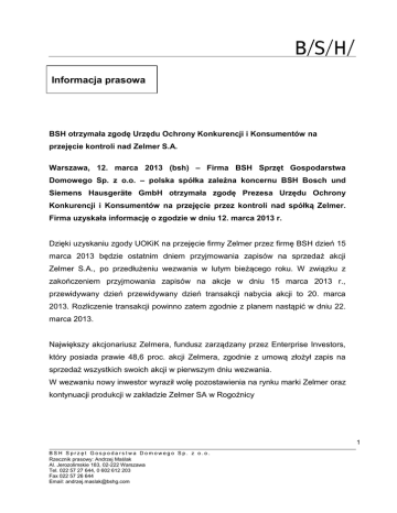 Informacja prasowa BSH otrzymała zgodę Urzędu Ochrony Konkurencji i Konsumentów na przejęcie kontroli nad Zelmer S.A. Warszawa, 12. marca 2013 (bsh) – Firma BSH Sprzęt Gospodarstwa Domowego Sp. z o.o. – polska spółka zależna koncernu BSH Bosch und Siemens Hausgeräte GmbH otrzymała zgodę Prezesa Urzędu Ochrony Konkurencji i Konsumentów na przejęcie przez kontroli nad spółką Zelmer. Firma uzyskała informację o zgodzie w dniu 12. marca 2013 r. Dzięki uzyskaniu zgody UOKiK na przejęcie firmy Zelmer przez firmę BSH dzień 15 marca 2013 będzie ostatnim dniem przyjmowania zapisów na sprzedaż akcji Zelmer S.A., po przedłużeniu wezwania w lutym bieżącego roku. W związku z zakończeniem przyjmowania zapisów na akcje w dniu 15 marca 2013 r., przewidywany dzień przewidywany dzień transakcji nabycia akcji to 20. marca 2013. Rozliczenie transakcji powinno zatem zgodnie z planem nastąpić w dniu 22. marca 2013. Największy akcjonariusz Zelmera, fundusz zarządzany przez Enterprise Investors, który posiada prawie 48,6 proc. akcji Zelmera, zgodnie z umową złożył zapis na sprzedaż wszystkich swoich akcji w pierwszym dniu wezwania. W wezwaniu nowy inwestor wyraził wolę pozostawienia na rynku marki Zelmer oraz kontynuacji produkcji w zakładzie Zelmer SA w Rogoźnicy 1 BSH Sprzęt Gospodarstwa Domowego Sp. z o.o. Rzecznik prasowy: Andrzej Maślak Al. Jerozolimskie 183, 02-222 Warszawa Tel. 022 57 27 644, 0 602 612 203 Fax 022 57 26 644 Email: [email protected] O firmie BSH: BSH jest liderem w branży urządzeń gospodarstwa domowego w Europie i jednym z wiodących producentów AGD na świecie. Koncern powstał w 1967 roku jako joint-venture firm Robert Bosch GmbH (Stuttgart) oraz Siemens AG (Monachium) i osiąga obroty ponad 9,8 mld euro (2012). Obecnie BSH posiada 41 fabryk i prowadzi działalność w 50 krajach świata zatrudniając ponad 46.000 osób. Asortyment oferowanych produktów obejmuje urządzenia dużego i małego AGD. Polska spółka-córka BSH Sprzęt Gospodarstwa Domowego w swoich trzech łódzkich fabrykach produkuje pralki, zmywarki, suszarki do ubrań oraz dystrybuuje sprzęt AGD marek Bosch, Siemens i Gaggenau. BSH zatrudnienia w Polsce ponad 2.000 osób. Łączna wartość polskich inwestycji na koniec 2012 roku przekroczyła 300 mln euro. Dodatkowych informacji udziela rzecznik prasowy BSH w Polsce: Andrzej Maślak. Telefon: 022 57 27 644, 0 602 612 203. E-mail: [email protected] 2 BSH Sprzęt Gospodarstwa Domowego Sp. z o.o. Rzecznik prasowy: Andrzej Maślak Al. Jerozolimskie 183, 02-222 Warszawa Tel. 022 57 27 644, 0 602 612 203 Fax 022 57 26 644 Email: [email protected]