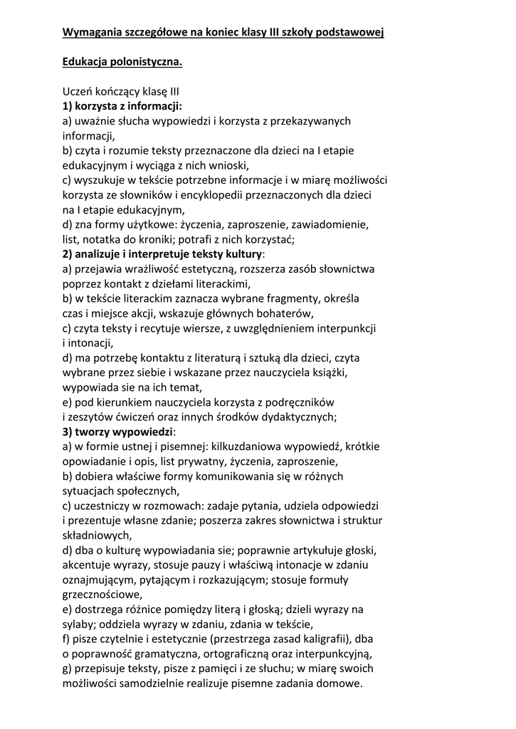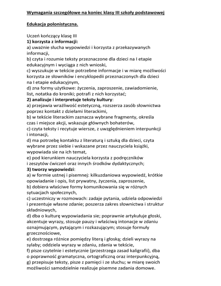 Wymagania szczegółowe na koniec klasy III szkoły podstawowej Edukacja polonistyczna. Uczeń kończący klasę III 1) korzysta z informacji: a) uważnie słucha wypowiedzi i korzysta z przekazywanych informacji, b) czyta i rozumie teksty przeznaczone dla dzieci na I etapie edukacyjnym i wyciąga z nich wnioski, c) wyszukuje w tekście potrzebne informacje i w miarę możliwości korzysta ze słowników i encyklopedii przeznaczonych dla dzieci na I etapie edukacyjnym, d) zna formy użytkowe: życzenia, zaproszenie, zawiadomienie, list, notatka do kroniki; potrafi z nich korzystać; 2) analizuje i interpretuje teksty kultury: a) przejawia wrażliwość estetyczną, rozszerza zasób słownictwa poprzez kontakt z dziełami literackimi, b) w tekście literackim zaznacza wybrane fragmenty, określa czas i miejsce akcji, wskazuje głównych bohaterów, c) czyta teksty i recytuje wiersze, z uwzględnieniem interpunkcji i intonacji, d) ma potrzebę kontaktu z literaturą i sztuką dla dzieci, czyta wybrane przez siebie i wskazane przez nauczyciela książki, wypowiada sie na ich temat, e) pod kierunkiem nauczyciela korzysta z podręczników i zeszytów ćwiczeń oraz innych środków dydaktycznych; 3) tworzy wypowiedzi: a) w formie ustnej i pisemnej: kilkuzdaniowa wypowiedź, krótkie opowiadanie i opis, list prywatny, życzenia, zaproszenie, b) dobiera właściwe formy komunikowania się w różnych sytuacjach społecznych, c) uczestniczy w rozmowach: zadaje pytania, udziela odpowiedzi i prezentuje własne zdanie; poszerza zakres słownictwa i struktur składniowych, d) dba o kulturę wypowiadania sie; poprawnie artykułuje głoski, akcentuje wyrazy, stosuje pauzy i właściwą intonacje w zdaniu oznajmującym, pytającym i rozkazującym; stosuje formuły grzecznościowe, e) dostrzega różnice pomiędzy literą i głoską; dzieli wyrazy na sylaby; oddziela wyrazy w zdaniu, zdania w tekście, f) pisze czytelnie i estetycznie (przestrzega zasad kaligrafii), dba o poprawność gramatyczna, ortograficzną oraz interpunkcyjną, g) przepisuje teksty, pisze z pamięci i ze słuchu; w miarę swoich możliwości samodzielnie realizuje pisemne zadania domowe. Edukacja muzyczna. Uczeń kończący klasę III: 1) w zakresie odbioru muzyki: a) zna i stosuje następujące rodzaje aktywności muzycznej: – śpiewa w zespole piosenki ze słuchu (nie mniej niż 10 utworów w roku szkolnym); śpiewa z pamięci hymn narodowy, – gra na instrumentach perkusyjnych (proste rytmy i wzory rytmiczne) oraz melodycznych (proste melodie i akompaniamenty), – realizuje sylabami rytmicznymi, gestem oraz ruchem proste rytmy i wzory rytmiczne; reaguje ruchem na puls rytmiczny i jego zmiany, zmiany tempa, metrum i dynamiki (maszeruje, biega, podskakuje), – tańczy podstawowe kroki i figury krakowiaka, polki oraz innego, prostego tańca ludowego, b) rozróżnia podstawowe elementy muzyki (melodia, rytm, wysokość dźwięku, akompaniament, tempo, dynamika) i znaki notacji muzycznej (wyraża ruchowo czas trwania wartości rytmicznych, nut i pauz), c) aktywnie słucha muzyki i określa jej cechy: rozróżnia i wyraża środkami pozamuzycznymi charakter emocjonalny muzyki, rozpoznaje utwory wykonane: solo i zespołowo, na chór i orkiestrę; orientuje sie w rodzajach głosów ludzkich (sopran, bas) oraz w instrumentach muzycznych (fortepian, gitara, skrzypce, trąbka, flet, perkusja); rozpoznaje podstawowe formy muzyczne – AB, ABA (wskazuje ruchem lub gestem ich kolejne części); 2) w zakresie tworzenia muzyki: a) tworzy proste ilustracje dźwiękowe do tekstów i obrazów oraz improwizacje ruchowe do muzyki, b) improwizuje głosem i na instrumentach według ustalonych zasad, c) wykonuje proste utwory, interpretuje je zgodnie z ich rodzajem i funkcją. Edukacja plastyczna. Uczeń kończący klasę III: 1) w zakresie percepcji sztuki: a) określa swoją przynależność kulturową poprzez kontakt z wybranymi dziełami sztuki, zabytkami i z tradycją w środowisku rodzinnym, szkolnym i lokalnym; uczestniczy w życiu kulturalnym tych środowisk, wie o istnieniu placówek kultury działających na ich rzecz, b) korzysta z przekazów medialnych; stosuje ich wytwory w swojej działalności twórczej (zgodnie z elementarną wiedzą o prawach autora); 2) w zakresie ekspresji przez sztukę: a) podejmuje działalność twórcza, posługując sie takimi środkami wyrazu plastycznego jak: kształt, barwa, faktura w kompozycji na płaszczyźnie i w przestrzeni (stosując określone materiały, narzędzia i techniki plastyczne), b) realizuje proste projekty w zakresie form użytkowych, w tym służące kształtowaniu własnego wizerunku i otoczenia oraz upowszechnianiu kultury w środowisku szkolnym (stosując określone narzędzia i wytwory przekazów medialnych); 3) w zakresie recepcji sztuki: a) rozróżnia takie dziedziny działalności twórczej człowieka jak: architektura, sztuki plastyczne oraz inne określone dyscypliny sztuki (fotografika, film) i przekazy medialne (telewizja, Internet), a także rzemiosło artystyczne i sztukę ludowa, b) rozpoznaje wybrane dzieła architektury i sztuk plastycznych należące do polskiego i europejskiego dziedzictwa kultury; opisuje ich cechy charakterystyczne (posługując się elementarnymi terminami właściwymi dla tych dziedzin działalności twórczej). Edukacja społeczna. Uczeń kończący klasę III: 1) odróżnia dobro od zła, stara się być sprawiedliwym i prawdomównym; nie krzywdzi słabszych i pomaga potrzebującym; 2) identyfikuje się ze swoją rodzinę i jej tradycjami; podejmuje obowiązki domowe i rzetelnie je wypełnia; rozumie, co to jest sytuacja ekonomiczna rodziny, i wie, że trzeba do niej dostosować swe oczekiwania; 3) wie, jak należy zachowywać sie w stosunku do dorosłych i rówieśników (formy grzecznościowe); rozumie potrzebę utrzymywania dobrych relacji z sąsiadami w miejscu zamieszkania; jest chętny do pomocy, respektuje prawo innych do pracy i wypoc