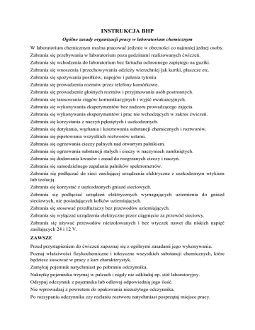 INSTRUKCJA BHP Ogólne zasady organizacji pracy w laboratorium chemicznym W laboratorium chemicznym można pracować jedynie w obecności co najmniej jednej osoby. Zabrania się przebywania w laboratorium poza godzinami realizowanych ćwiczeń. Zabrania się wchodzenia do laboratorium bez fartucha ochronnego zapiętego na guziki. Zabrania się wnoszenia i przechowywania odzieży wierzchniej jak kurtki, płaszcze etc. Zabrania się spożywania posiłków, napojów i palenia tytoniu. Zabrania się prowadzenia rozmów przez telefony komórkowe. Zabrania się prowadzenie głośnych rozmów i przyjmowania osób postronnych. Zabrania się tarasowania ciągów komunikacyjnych i wyjść ewakuacyjnych. Zabrania się wykonywania eksperymentów bez nadzoru prowadzącego zajęcia. Zabrania się wykonywania eksperymentów i prac nie wchodzących w zakres ćwiczeń. Zabrania się korzystania z naczyń pękniętych i uszkodzonych. Zabrania się dotykania, wąchania i kosztowania substancji chemicznych i roztworów. Zabrania się pipetowania wszystkich roztworów ustami. Zabrania się ogrzewania cieczy palnych nad otwartym palnikiem. Zabrania się ogrzewania substancji stałych i cieczy w naczyniach zamkniętych. Zabrania się dodawania kwasów i zasad do rozgrzanych cieczy i naczyń. Zabrania się samodzielnego zapalania palników spektrometrów. Zabrania się podłączać do sieci zasilającej urządzenia elektryczne z uszkodzonym wtykiem lub izolacją. Zabrania się korzystać z uszkodzonych gniazd sieciowych. Zabrania się podłączać urządzeń elektrycznych wymagających uziemienia do gniazd sieciowych, nie posiadających kołków uziemiających. Zabrania się stosować przedłużaczy bez przewodów uziemiających. Zabrania się wyłączać urządzenia elektryczne przez ciągnięcie za przewód sieciowy. Zabrania się używać przewodów nieizolowanych i bez wtyczek nawet dla niskich napięć zasilających 24 i 12 V. ZAWSZE Przed przystąpieniem do ćwiczeń zapoznaj się z ogólnymi zasadami jego wykonywania. Poznaj właściwości fizykochemiczne i toksyczne wszystkich substancji chemicznych, które będziesz stosować w pracy z kart charakterystyk. Zamykaj pojemnik natychmiast po pobraniu odczynnika. Nakrętkę pojemnika trzymaj w palcach i nigdy nie odkładaj np. stół laboratoryjny. Odsypuj odczynnik z pojemnika lub odlewaj odpowiednią jego ilość. Nie wprowadzaj z powrotem do opakowania niezużytego odczynnika. Po rozsypaniu odczynnika czy rozlaniu roztworu natychmiast posprzątaj miejsce pracy. Stosuj środki ochrony indywidualnej (okulary, osłony twarzy, rękawice, fartuchy etc.) Urządzenia elektryczne użytkuj wyłącznie zgodnie z instrukcją, przestrzegając kolejności włączania i wyłączania poszczególnych elementów. Przed zapaleniem palnika sprawdź, czy wąż doprowadzający gaz do palnika nie jest uszkodzony i czy jest dokładnie nasunięty na króciec palnika. Przed zapaleniem zamknij dopływ powietrza do palnika a po zapaleniu reguluj dopływ powietrza ustalając odpowiedni charakter i wysokość płomienia. Gdy płomień „przeskoczy” zgaś natychmiast palnik (ponowne zapalenie jest możliwe po ostygnięciu palnika). Do zapalania palnika używaj wyłącznie zapałek lub odpowiedniej zapalniczki, w żadnym wypadku nie stosuj sączków, skrawków papieru etc. Sprawdź sprawność instalacji wentylacyjnej w tym wentylacji dygestoriów. Zbieraj lub neutralizuj odpady chemiczne. Ustal miejsce, w którym przechowywane są środki ratunkowe (natryski, myjki oczu, środki neutralizujące, opatrunkowe etc.) oraz środki służące do gaszenia pożarów. Przed przystąpieniem do pracy sprawdź czy działają wyciągi, jeżeli nie zostały załączone, włącz lub zgłoś prowadzącemu zajęcia. Prace, podczas których może dojść do wydostania do atmosfery laboratorium szkodliwych substancji, a także koniecznej ochrony przed ewentualnymi pożarami i eksplozjami prowadź pod dygestorium. Zaplanuj postępowanie w wypadku powstania zakłóceń w pracy (pożar, wybuch etc.) Stężone kwasy i zasady rozcieńczaj wyłącznie przez dodawanie kwasu lub zasady do wody nigdy odwrotnie. Zabezpieczaj pionową pozycję butli przez odpowiednie paski czy łańcuchy. Otwieraj główny zawór butli gdy reduktor jest zainstalowany, a wyloty regulacyjne zamknięte. Otwieraj i zamykaj główny zawór butli ręką. Zwalniaj reduktor trzymając go z dala od oczu i twarzy. Dokładnie przeglądaj wszystkie szklane elementy aparatury badawczej i szklane naczynia czy nie są mechanicznie uszkodzone. Używaj odpowiedniej łaźni do podgrzewania, wybierając odpowiedni zakres temperatur. Stosuj mieszanie podczas podgrzewania mieszaniny reakcyjnej, gdy jest to technicznie niemożliwe użyj kamyczków wrzennych. Stosuj kamyki wrzenne, aby zapobiec burzliwemu wrzeniu i przegrzewaniu. Gdy jest to możliwe stosuj płaszcze grzejne z regulacją termiczną odpowiednich rozmiarów. Używaj szczypców, klamer, uchwytów i izolujących rękawic do przenoszenia naczyń do reakcji w wysokich temperaturach. Wyciągaj tygle do topienia i inne rozgrzane naczynia z pieca za pomocą odpowiednich szczypiec. Ochładzaj tygle do topienia na specjalnych ceramicznych trójkątach pod wyciągiem. Używaj szkła żaroodpornego typu Pyrex. Staraj się zabezpieczać aparaturę szklaną przed szokiem termicznym. Dbaj o porządek i ład na stanowisku pracy. Przed opuszczeniem stanowiska sprawdź stan urządzeń zasilanych z instalacji elektrycznej, wodnej i gazowej. Wszystkie wykryte usterki zgłaszaj prowadzącemu zajęcia. Stosuj się do lokalnych wymagań prawnych regulujacych zasady utylizacji odczynników i ścieków. Zwracaj się do prowadzącego zajęcia lub osoby odpowiedzialnej za bezpieczeństwo w przypadku zaistnienia jakichkolwiek wątpliwości. NIGDY Nie wahaj się zwrócić do prowadzącego zajęcia, osoby przez niego wskazanej lub osoby odpowiedzialnej za bezpieczeństwo w przypadku wystąpienia problemów lub w