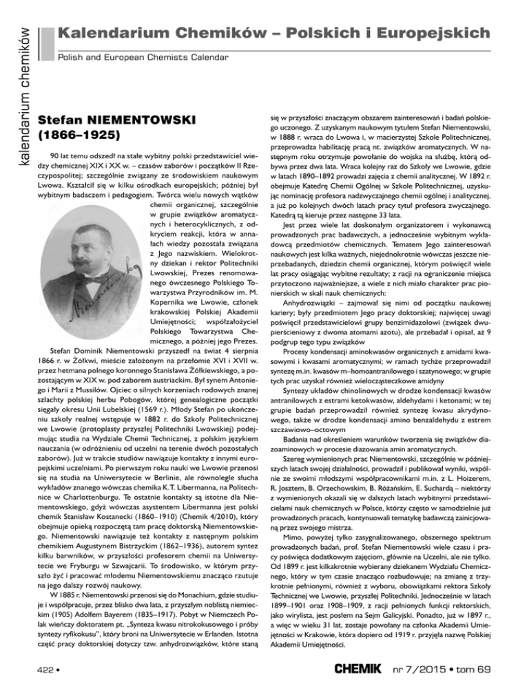 kalendarium chemików Kalendarium Chemików – Polskich i Europejskich Polish and European Chemists Calendar Stefan NIEMENTOWSKI (1866–1925) 90 lat temu odszedł na stałe wybitny polski przedstawiciel wiedzy chemicznej XIX i XX w. – czasów zaborów i początków II Rzeczypospolitej; szczególnie związany ze środowiskiem naukowym Lwowa. Kształcił się w kilku ośrodkach europejskich; później był wybitnym badaczem i pedagogiem. Twórca wielu nowych wątków chemii organicznej, szczególnie w grupie związków aromatycznych i heterocyklicznych, z odkryciem reakcji, która w annałach wiedzy pozostała związana z Jego nazwiskiem. Wielokrotny dziekan i rektor Politechniki Lwowskiej, Prezes renomowanego ówczesnego Polskiego Towarzystwa Przyrodników im. M. Kopernika we Lwowie, członek krakowskiej Polskiej Akademii Umiejętności; współzałożyciel Polskiego Towarzystwa Chemicznego, a później jego Prezes. Stefan Dominik Niementowski przyszedł na świat 4 sierpnia 1866 r. w Żółkwi, mieście założonym na przełomie XVI i XVII w. przez hetmana polnego koronnego Stanisława Żółkiewskiego, a pozostającym w XIX w. pod zaborem austriackim. Był synem Antoniego i Marii z Mussilów. Ojciec o silnych korzeniach rodowych znanej szlachty polskiej herbu Pobogów, której genealogiczne początki sięgały okresu Unii Lubelskiej (1569 r.). Młody Stefan po ukończeniu szkoły realnej wstępuje w 1882 r. do Szkoły Politechnicznej we Lwowie (protoplasty przyszłej Politechniki Lwowskiej) podejmując studia na Wydziale Chemii Technicznej, z polskim językiem nauczania (w odróżnieniu od uczelni na terenie dwóch pozostałych zaborów). Już w trakcie studiów nawiązuje kontakty z innymi europejskimi uczelniami. Po pierwszym roku nauki we Lwowie przenosi się na studia na Uniwersytecie w Berlinie, ale równolegle słucha wykładów znanego wówczas chemika K.T. Libermanna, na Politechnice w Charlottenburgu. Te ostatnie kontakty są istotne dla Niementowskiego, gdyż wówczas asystentem Libermanna jest polski chemik Stanisław Kostanecki (1860–1910) (Chemik 4/2010), który obejmuje opieką rozpoczętą tam pracę doktorską Niementowskiego. Niementowski nawiązuje też kontakty z następnym polskim chemikiem Augustynem Bistrzyckim (1862–1936), autorem syntez kilku barwników, w przyszłości profesorem chemii na Uniwersytecie we Fryburgu w Szwajcarii. To środowisko, w którym przyszło żyć i pracować młodemu Niementowskiemu znacząco rzutuje na jego dalszy rozwój naukowy. W 1885 r. Niementowski przenosi się do Monachium, gdzie studiuje i współpracuje, przez blisko dwa lata, z przyszłym noblistą niemieckim (1905) Adolfem Bayerem (1835–1917). Pobyt w Niemczech Polak wieńczy doktoratem pt. „Synteza kwasu nitrokokusowego i próby syntezy ryfikokusu”, który broni na Uniwersytecie w Erlanden. Istotna część pracy doktorskiej dotyczy tzw. anhydrozwiązków, które staną 422 • się w przyszłości znaczącym obszarem zainteresowań i badań polskiego uczonego. Z uzyskanym naukowym tytułem Stefan Niementowski, w 1888 r. wraca do Lwowa i, w macierzystej Szkole Politechnicznej, przeprowadza habilitację pracą nt. związków aromatycznych. W następnym roku otrzymuje powołanie do wojska na służbę, którą odbywa przez dwa lata. Wraca kolejny raz do Szkoły we Lwowie, gdzie w latach 1890–1892 prowadzi zajęcia z chemii analitycznej. W 1892 r. obejmuje Katedrę Chemii Ogólnej w Szkole Politechnicznej, uzyskując nominację profesora nadzwyczajnego chemii ogólnej i analitycznej, a już po kolejnych dwóch latach pracy tytuł profesora zwyczajnego. Katedrą tą kieruje przez następne 33 lata. Jest przez wiele lat doskonałym organizatorem i wykonawcą prowadzonych prac badawczych, a jednocześnie wybitnym wykładowcą przedmiotów chemicznych. Tematem Jego zainteresowań naukowych jest kilka ważnych, niejednokrotnie wówczas jeszcze nieprzebadanych, dziedzin chemii organicznej, którym poświęcił wiele lat pracy osiągając wybitne rezultaty; z racji na ograniczenie miejsca przytoczono najważniejsze, a wiele z nich miało charakter prac pionierskich w skali nauk chemicznych: Anhydrozwiązki – zajmował się nimi od początku naukowej kariery; były przedmiotem Jego pracy doktorskiej; najwięcej uwagi poświęcił przedstawicielowi grupy benzimidazolowi (związek dwupierścieniowy z dwoma atomami azotu), ale przebadał i opisał, aż 9 podgrup tego typu związków Procesy kondensacji aminokwasów organicznych z amidami kwasowymi i kwasami aromatycznymi; w ramach tychże przeprowadził syntezę m.in. kwasów m–homoantranilowego i szatynowego; w grupie tych prac uzyskał również wielocząsteczkowe amidyny Syntezy układów chinolinowych w drodze kondensacji kwasów antranilowych z estrami ketokwasów, aldehydami i ketonami; w tej grupie badań przeprowadził również syntezę kwasu akrydynowego, także w drodze kondensacji amino benzaldehydu z estrem szczawiowo–octowym Badania nad określeniem warunków tworzenia się związków diazoaminowych w procesie diazowania amin aromatycznych. Szereg wymienionych prac Niementowski, szczególnie w późniejszych latach swojej działalności, prowadził i publikował wyniki, wspólnie ze swoimi młodszymi współpracownikami m.in. z L. Hoizerem, R. Josztem, B. Orzechowskim, B. Różańskim, E. Suchardą – niektórzy z wymienionych okazali się w dalszych latach wybitnymi przedstawicielami nauk chemicznych w Polsce, którzy często w samodzielnie już prowadzonych pracach, kontynuowali tematykę badawczą zainicjowaną przez swojego mistrza. Mimo, powyżej tylko zasygnalizowanego, obszernego spektrum prowadzonych badań, prof. Stefan Niementowski wiele czasu i pracy poświęca dodatkowym zajęciom, głównie na Uczelni, ale nie tylko. Od 1899 r. jest kilkakrotnie wybierany dziekanem Wydziału Chemicznego, który w tym czasie znacząco rozbudowuje; na zmianę z trzykrotnie pełnionymi, również z wyboru, obo