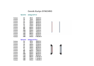 Cennik Kurtyn SYNCHRO Synchro Kurtyna Kurtyna Kurtyna Kurtyna Kurtyna Kurtyna Kurtyna Kurtyna Kurtyna Kurtyna Kurtyna Kurtyna Kurtyna 2w 3w 4w 5w 6w 7w 8W 9W 10W 11W 12W 13W 14W Synchro Kurtyna Kurtyna Kurtyna Kurtyna Kurtyna Kurtyna Kurtyna Kurtyna Kurtyna Kurtyna Kurtyna Kurtyna Kurtyna 2w 3w 4w 5w 6w 7w 8W 9W 10W 11W 12W 13W 14W zasięg do15 m 45cm 75cm 100cm 125cm 150cm 175cm 200cm 220cm 238cm 265cm 286cm 315cm 334cm 324,00 zł 350,00 zł 395,00 zł 464,00 zł 503,00 zł 557,00 zł 615,00 zł 675,00 zł 735,00 zł 795,00 zł 870,00 zł 945,00 zł 1 020,00 zł zasięg do 35 m 45cm 75cm 100cm 125cm 150cm 175cm 200cm 220cm 238cm 265cm 286cm 315cm 334cm 386,00 zł 420,00 zł 474,00 zł 556,80 zł 603,60 zł 668,40 zł 738,00 zł 810,00 zł 882,00 zł 954,00 zł 1 044,00 zł 1 134,00 zł 1 224,00 zł