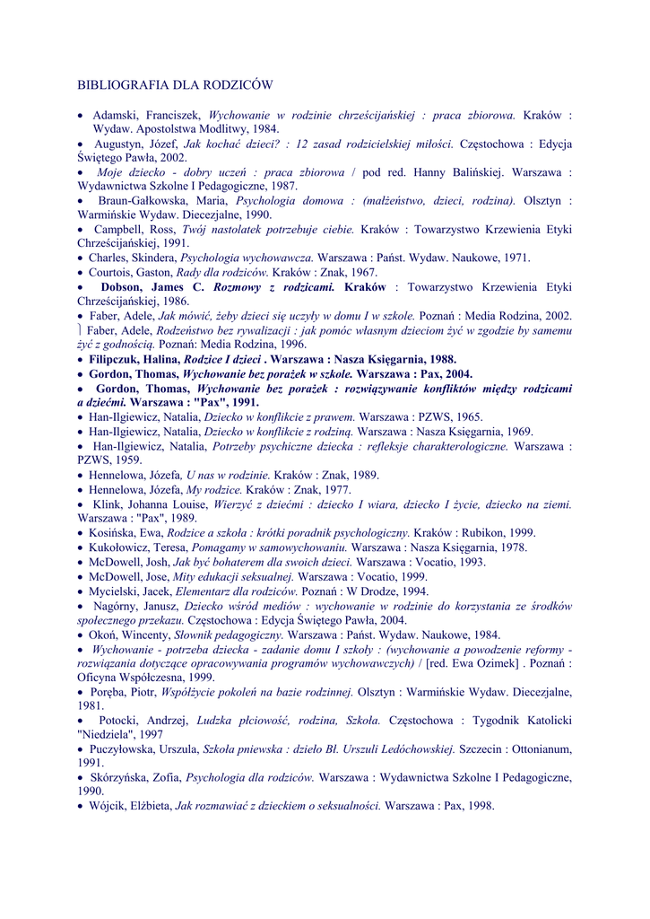 BIBLIOGRAFIA DLA RODZICÓW Adamski, Franciszek, Wychowanie w rodzinie chrześcijańskiej : praca zbiorowa. Kraków : Wydaw. Apostolstwa Modlitwy, 1984. Augustyn, Józef, Jak kochać dzieci? : 12 zasad rodzicielskiej miłości. Częstochowa : Edycja Świętego Pawła, 2002. Moje dziecko - dobry uczeń : praca zbiorowa / pod red. Hanny Balińskiej. Warszawa : Wydawnictwa Szkolne I Pedagogiczne, 1987. Braun-Gałkowska, Maria, Psychologia domowa : (małżeństwo, dzieci, rodzina). Olsztyn : Warmińskie Wydaw. Diecezjalne, 1990. Campbell, Ross, Twój nastolatek potrzebuje ciebie. Kraków : Towarzystwo Krzewienia Etyki Chrześcijańskiej, 1991. Charles, Skindera, Psychologia wychowawcza. Warszawa : Państ. Wydaw. Naukowe, 1971. Courtois, Gaston, Rady dla rodziców. Kraków : Znak, 1967. Dobson, James C. Rozmowy z rodzicami. Kraków : Towarzystwo Krzewienia Etyki Chrześcijańskiej, 1986. Faber, Adele, Jak mówić, żeby dzieci się uczyły w domu I w szkole. Poznań : Media Rodzina, 2002. Faber, Adele, Rodzeństwo bez rywalizacji : jak pomóc własnym dzieciom żyć w zgodzie by samemu żyć z godnością. Poznań: Media Rodzina, 1996. Filipczuk, Halina, Rodzice I dzieci . Warszawa : Nasza Księgarnia, 1988. Gordon, Thomas, Wychowanie bez porażek w szkole. Warszawa : Pax, 2004. Gordon, Thomas, Wychowanie bez porażek : rozwiązywanie konfliktów między rodzicami a dziećmi. Warszawa : "Pax", 1991. Han-Ilgiewicz, Natalia, Dziecko w konflikcie z prawem. Warszawa : PZWS, 1965. Han-Ilgiewicz, Natalia, Dziecko w konflikcie z rodziną. Warszawa : Nasza Księgarnia, 1969. Han-Ilgiewicz, Natalia, Potrzeby psychiczne dziecka : refleksje charakterologiczne. Warszawa : PZWS, 1959. Hennelowa, Józefa, U nas w rodzinie. Kraków : Znak, 1989. Hennelowa, Józefa, My rodzice. Kraków : Znak, 1977. Klink, Johanna Louise, Wierzyć z dziećmi : dziecko I wiara, dziecko I życie, dziecko na ziemi. Warszawa : "Pax", 1989. Kosińska, Ewa, Rodzice a szkoła : krótki poradnik psychologiczny. Kraków : Rubikon, 1999. Kukołowicz, Teresa, Pomagamy w samowychowaniu. Warszawa : Nasza Księgarnia, 1978. McDowell, Josh, Jak być bohaterem dla swoich dzieci. Warszawa : Vocatio, 1993. McDowell, Jose, Mity edukacji seksualnej. Warszawa : Vocatio, 1999. Mycielski, Jacek, Elementarz dla rodziców. Poznań : W Drodze, 1994. Nagórny, Janusz, Dziecko wśród mediów : wychowanie w rodzinie do korzystania ze środków społecznego przekazu. Częstochowa : Edycja Świętego Pawła, 2004. Okoń, Wincenty, Słownik pedagogiczny. Warszawa : Państ. Wydaw. Naukowe, 1984. Wychowanie - potrzeba dziecka - zadanie domu I szkoły : (wychowanie a powodzenie reformy rozwiązania dotyczące opracowywania programów wychowawczych) / [red. Ewa Ozimek] . Poznań : Oficyna Współczesna, 1999. Poręba, Piotr, Współżycie pokoleń na bazie rodzinnej. Olsztyn : Warmińskie Wydaw. Diecezjalne, 1981. Potocki, Andrzej, Ludzka płciowość, rodzina, Szkoła. Częstochowa : Tygodnik Katolicki "Niedziela", 1997 Puczyłowska, Urszula, Szkoła pniewska : dzieło Bł. Urszuli Ledóchowskiej. Szczecin : Ottonianum, 1991. Skórzyńska, Zofia, Psychologia dla rodziców. Warszawa : Wydawnictwa Szkolne I Pedagogiczne, 1990. Wójcik, Elżbieta, Jak rozmawiać z dzieckiem o seksualności. Warszawa : Pax, 1998. 1. Blanca Jorda de Urries - Twoje dziecko między 1 a 3 rokiem życia Apostolicum 2005 2. Blanca Jorda de Urries, Manso Manolia Twoje dziecko między 4 a 5 rokiem życia, Apostolicum, 2005 3. Corominas Fernando - Wychowywać dziś, Apostolicum, 2006 4. Faber Adele, Mazlish Elainea Jak mówić, żeby dzieci się uczyły Jak mówić, żeby dzieci nas słuchały, jak słuchać, żeby dzieci żeby dzieci mówiły. Rodzeństwo bez rywalizacji Media Rodzina, 1995 5. Gordon Thomas Wychowanie bez porażek, Instytut Wydawniczy PAX, 2003 6. Kast- Zahn Annette Każde dziecko może nauczyć się reguł. Jak ustanowić granice I wytyczyć zasady postępowania OD niemowlaka do dziecka w wieku szkolnym, Media Rodzina 1999 7. Leman Kevin â?? Jak wychowywać dziecko I nie oszaleć, Kraków 2004 8. Lewis David â?? Jak wychować zdolne dziecko 9. Mycielski Jacek â?? Elementarz dla rodziców, W drodze, 2002 10. Nelson Jane â?? Posprzątaj zabawki, kochanie, 2005 11. Obuchowska Irena â?? Kochać I rozumieć CZ.1,2,3, Media Rodzina, 2003 12. Riera L.C. â?? Żartobliwie o wychowaniu, Oficyna Współczesna, 2000 13. Wyckof Jerry I Unell Barbara Dyscyplina bez krzyku I bicia. Praktyczne rozwiązania najczęstszych problemów dotyczących zachowania dzieci, K.E. Liber 2004 14. Żulińska Barbara Seria książek Jak wychowywać nasze dzieci? Ku zmartwychwstaniu, Oficyna Wydawnicza Viator 15. Rogaczewski Arkadiusz O cnotach I wychowaniu, Instytut Edukacji Narodowej, Lublin 1999