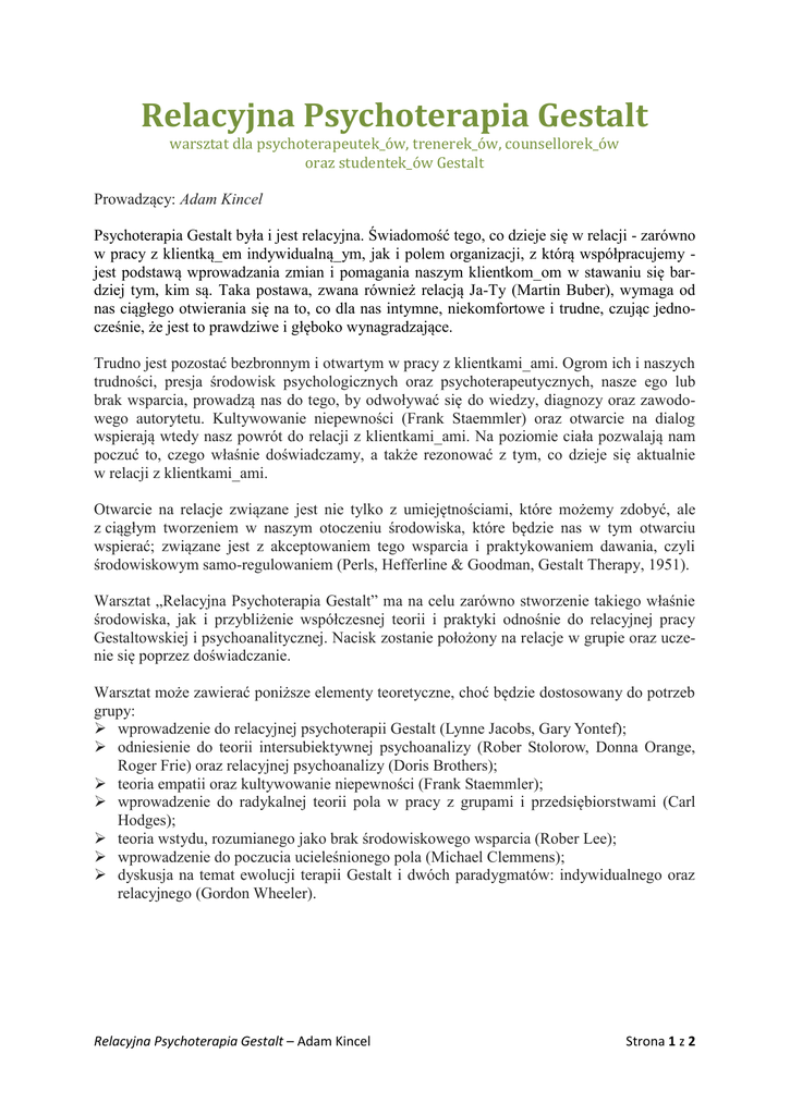 Relacyjna Psychoterapia Gestalt warsztat dla psychoterapeutek_ów, trenerek_ów, counsellorek_ów oraz studentek_ów Gestalt Prowadzący: Adam Kincel Psychoterapia Gestalt była i jest relacyjna. Świadomość tego, co dzieje się w relacji - zarówno w pracy z klientką_em indywidualną_ym, jak i polem organizacji, z którą współpracujemy jest podstawą wprowadzania zmian i pomagania naszym klientkom_om w stawaniu się bardziej tym, kim są. Taka postawa, zwana również relacją Ja-Ty (Martin Buber), wymaga od nas ciągłego otwierania się na to, co dla nas intymne, niekomfortowe i trudne, czując jednocześnie, że jest to prawdziwe i głęboko wynagradzające. Trudno jest pozostać bezbronnym i otwartym w pracy z klientkami_ami. Ogrom ich i naszych trudności, presja środowisk psychologicznych oraz psychoterapeutycznych, nasze ego lub brak wsparcia, prowadzą nas do tego, by odwoływać się do wiedzy, diagnozy oraz zawodowego autorytetu. Kultywowanie niepewności (Frank Staemmler) oraz otwarcie na dialog wspierają wtedy nasz powrót do relacji z klientkami_ami. Na poziomie ciała pozwalają nam poczuć to, czego właśnie doświadczamy, a także rezonować z tym, co dzieje się aktualnie w relacji z klientkami_ami. Otwarcie na relacje związane jest nie tylko z umiejętnościami, które możemy zdobyć, ale z ciągłym tworzeniem w naszym otoczeniu środowiska, które będzie nas w tym otwarciu wspierać; związane jest z akceptowaniem tego wsparcia i praktykowaniem dawania, czyli środowiskowym samo-regulowaniem (Perls, Hefferline & Goodman, Gestalt Therapy, 1951). Warsztat „Relacyjna Psychoterapia Gestalt” ma na celu zarówno stworzenie takiego właśnie środowiska, jak i przybliżenie współczesnej teorii i praktyki odnośnie do relacyjnej pracy Gestaltowskiej i psychoanalitycznej. Nacisk zostanie położony na relacje w grupie oraz uczenie się poprzez doświadczanie. Warsztat może zawierać poniższe elementy teoretyczne, choć będzie dostosowany do potrzeb grupy: wprowadzenie do relacyjnej psychoterapii Gestalt (Lynne Jacobs, Gary Yontef); odniesienie do teorii intersubiektywnej psychoanalizy (Rober Stolorow, Donna Orange, Roger Frie) oraz relacyjnej psychoanalizy (Doris Brothers); teoria empatii oraz kultywowanie niepewności (Frank Staemmler); wprowadzenie do radykalnej teorii pola w pracy z grupami i przedsiębiorstwami (Carl Hodges); teoria wstydu, rozumianego jako brak środowiskowego wsparcia (Rober Lee); wprowadzenie do poczucia ucieleśnionego pola (Michael Clemmens); dyskusja na temat ewolucji terapii Gestalt i dwóch paradygmatów: indywidualnego oraz relacyjnego (Gordon Wheeler). Relacyjna Psychoterapia Gestalt – Adam Kincel Strona 1 z 2 Adam Kincel – jest psychoterapeutą, superwizorem oraz trenerem Gestalt w Londynie. Ukończył studia Gestaltowskie w Gestalt Centre London oraz psychodynamiczne w British Association of Psychotherapists. Jest członkiem zarządu Association for the Advancement in Gestalt Therapy (AAGT), delegatem do Europejskiego Stowarzyszenia Psychoterapii Integralnej oraz trenerem w londyńskim Re-Vision Centre. Relacyjnej Psychoterapii uczył się osobiście od Lynne Jacbos, Gary Yontefa i Doris Brothers w Pacific Gestalt Insitute (Los Angeles) oraz Carla Hodgesa z New York Institute for Gestalt Therapy. Od trzech lat Adam prowadzi badania doktoranckie nad dużymi grupami oraz relacyjną pracą z ciałem. Poza pracą, Adam odnawia relację z naturą, ćwiczy yogę oraz lubi podróżować. ***** Informacje organizacyjne: ORGANIZATOR Pracownia Psychologiczna JA-TY, Daniel Bąk; Zgłoszenia: Daniel Bąk; e-mail: [email protected] TERMIN/MIEJSCE/OPŁATY Termin: Od godz. 11.00 w dn. 7 listopada do godz. 16.00 w dn. 9 listopada 2014; Miejsce: Szkwa – niewielka wieś w okolicy Ostrołęki (ok. 140 km od Warszawy); zakwaterowanie w dwóch domach (22.50 PLN lub 32,00 PLN za noc; obiad płatny dodatkowo – 13,00 PLN); Opłata za warsztat: 650,00 PLN brutto (przedpłata: 250,00 PLN brutto); Nasz „warsztatowy” dom w Szkwie i jego otoczenie. Relacyjna Psychoterapia Gestalt – Adam Kincel Strona 2 z 2