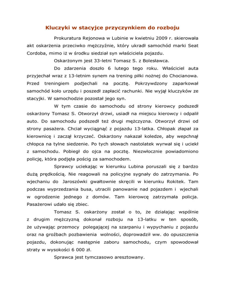 Kluczyki w stacyjce przyczynkiem do rozboju Prokuratura Rejonowa w Lubinie w kwietniu 2009 r. skierowała akt oskarżenia przeciwko mężczyźnie, który ukradł samochód marki Seat Cordoba, mimo iż w środku siedział syn właściciela pojazdu. Oskarżonym jest 33-letni Tomasz S. z Bolesławca. Do zdarzenia doszło 6 lutego tego roku. Właściciel auta przyjechał wraz z 13-letnim synem na trening piłki nożnej do Chocianowa. Przed treningiem podjechali na pocztę. Pokrzywdzony zaparkował samochód koło urzędu i poszedł zapłacić rachunki. Nie wyjął kluczyków ze stacyjki. W samochodzie pozostał jego syn. W tym czasie do samochodu od strony kierowcy podszedł oskarżony Tomasz S. Otworzył drzwi, usiadł na miejscu kierowcy i odpalił auto. Do samochodu podszedł też drugi mężczyzna. Otworzył drzwi od strony pasażera. Chciał wyciągnąć z pojazdu 13-latka. Chłopak złapał za kierownicę i zaczął krzyczeć. Oskarżony nakazał koledze, aby wepchnął chłopca na tylne siedzenie. Po tych słowach nastolatek wyrwał się i uciekł z samochodu. Pobiegł do ojca na pocztę. Niezwłocznie powiadomiono policję, która podjęła pościg za samochodem. Sprawcy uciekając w kierunku Lubina poruszali się z bardzo dużą prędkością. Nie reagowali na policyjne sygnały do zatrzymania. Po wjechaniu do Jaroszówki gwałtownie skręcili w kierunku Rokitek. Tam podczas wyprzedzania busa, utracili panowanie nad pojazdem i wjechali w ogrodzenie jednego z domów. Tam kierowcę zatrzymała policja. Pasażerowi udało się zbiec. Tomasz S. oskarżony został o to, że działając wspólnie z drugim mężczyzną dokonał rozboju na 13-latku w ten sposób, że używając przemocy polegającej na szarpaniu i wypychaniu z pojazdu oraz na groźbach pozbawienia wolności, doprowadził ww. do opuszczenia pojazdu, dokonując następnie zaboru samochodu, czym spowodował straty w wysokości 6 000 zł. Sprawca jest tymczasowo aresztowany. Za przestępstwo rozboju grozi kara od 2 do 12 lat pozbawienia wolności. Sprawę rozpozna Sąd Rejonowy w Lubinie.