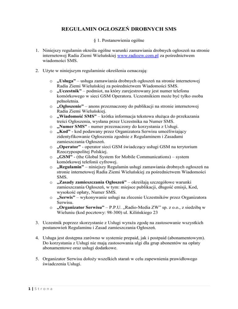 REGULAMIN OGŁOSZEŃ DROBNYCH SMS § 1. Postanowienia ogólne 1. Niniejszy regulamin określa ogólne warunki zamawiania drobnych ogłoszeń na stronie internetowej Radia Ziemi Wieluńskiej www.radiozw.com.pl za pośrednictwem wiadomości SMS. 2. Użyte w niniejszym regulaminie określenia oznaczają: o „Usługa” – usługa zamawiania drobnych ogłoszeń na stronie internetowej Radia Ziemi Wieluńskiej za pośrednictwem Wiadomości SMS. o „Uczestnik” – podmiot, na który zarejestrowany jest numer telefonu komórkowego w sieci GSM Operatora. Uczestnikiem może być tylko osoba pełnoletnia. o „Ogłoszenie” – anons przeznaczony do publikacji na stronie internetowej Radia Ziemi Wieluńskiej. o „Wiadomość SMS” – krótka informacja tekstowa służąca do przekazania treści Ogłoszenia, wysłana przez Uczestnika na Numer SMS. o „Numer SMS” - numer przeznaczony do korzystania z Usługi. o „Kod” - kod podawany przez Organizatora Serwisu umożliwiający zidentyfikowanie Ogłoszenia zgodnie z Regulaminem i Zasadami zamieszczania Ogłoszeń. o „Operator” - operator sieci GSM świadczący usługi GSM na terytorium Rzeczypospolitej Polskiej. o „GSM” - (the Global System for Mobile Communications) – system komórkowej telefonii cyfrowej. o „Regulamin” – niniejszy Regulamin usługi zamawiania drobnych ogłoszeń na stronie internetowej Radia Ziemi Wieluńskiej za pośrednictwem Wiadomości SMS. o „Zasady zamieszczania Ogłoszeń” – określają szczegółowe warunki zamieszczania Ogłoszeń, w tym: miejsce publikacji, długość emisji, Kod, wysokość opłaty, Numer SMS. o „Serwis” – wykonywanie usługi na zlecenie Uczestników przez Organizatora Serwisu. o „Organizator Serwisu” – P.P.U. „Radio-Media ZW” sp. z o.o., z siedzibą w Wieluniu (kod pocztowy: 98-300) ul. Kilińskiego 23 3. Uczestnik poprzez skorzystanie z Usługi wyraża zgodę na zastosowanie wszystkich postanowień Regulaminu i Zasad zamieszczania Ogłoszeń. 4. Usługa jest dostępna zarówno w systemie prepaid, jak i postpaid (abonamentowym). Do korzystania z Usługi nie mają zastosowania ulgi dla grup abonentów na opłaty abonamentowe oraz usługi dodatkowe. 5. Organizator Serwisu dołoży wszelkich starań w celu zapewnienia prawidłowego świadczenia Usługi. 1|Strona § 2. Zasady korzystania z Serwisu 1. Usługa uruchomiona jest od dnia 04 stycznia 2012 roku do odwołania. 2. Warunkiem korzystania z Usługi jest zapoznanie się z Regulaminem i Zasadami zamieszczania Ogłoszeń. 3. W przypadku przesłania przez Uczestnika Wiadomości SMS z treścią Ogłoszenia, Uczestnik otrzymuje zwrotną Wiadomość SMS potwierdzającą przyjęcie Ogłoszenia do publikacji. Publikowane będą jedynie ogłoszenia spełniające wszystkie postanowienia Regulaminu i Zasad zamieszczania Ogłoszeń. W ramach Usługi Uczestnik otrzyma również zwrotną Wiadomość SMS potwierdzającą publikację Ogłoszenia na stronie internetowej Radia Ziemi Wieluńskiej. 4. Organizator Serwisu nie będzie publikował Ogłoszeń zabronionych prawem. 5. Organizator Serwisu nie będzie publikował Ogłoszeń zawierających treści powszechnie uważane za obraźliwe, naruszające dobra osobiste osób trzecich oraz treści, które Organizator Serwisu uzna za gorszące bądź niewłaściwe do odbioru w szczególności przez dzieci. 6. Organizator Serwisu zastrzega sobie prawo weryfikacji treści Ogłoszenia w zakresie jego zgodności z zasadami pisowni języka polskiego (ortografii i gramatyki) oraz z Regulaminem i Zasadami zamieszczania Ogłoszeń. 7. W przypadku wysłania przez Uczestnika Wiadomości SMS zawierającej błędy uniemożliwiające publikację Ogłoszenia przez Organizatora Serwisu lub niezgodnej z Regulaminem bądź Zasadami zamieszczania Ogłoszeń, Ogłoszenie nie zostanie opublikowane, a Organizator Serwisu nie zwraca kosztów związanych z wysłaniem tej Wiadomości SMS. 8. Ogłoszenia zawierające treści niezgodne z przepisami prawa, zasadami moralnymi i dobrymi obyczajami, Regulaminem, Zasadami zamieszczania Ogłoszeń nie będą publikowane, a Organizator Serwisu nie zwraca kosztów związanych z wysłaniem tej Wiadomości SMS. 9. W przypadku niepodania przez Uczestnika w treści Ogłoszenia numeru telefonu kontaktowego zostanie opublikowany numeru telefonu komórkowego, z którego wysłana została Wiadomość SMS z treścią Ogłoszenia. 10. Numer telefonu, z którego została wysłana Wiadomość SMS musi być identyczny z numerem telefonu podanym w Ogłoszeniu, w przeciwnym wypadku do Ogłoszenia zostanie dodany numer z jakiego zostało wysłane Ogłoszenie. 11. W razie zmiany Regulaminu bądź Zasad zamieszczania Ogłoszeń Uczestnik, który złożył, przed dokonaniem zmiany, zlecenie publikacji Ogłoszenia zachowuje wszystkie dotychczasowe prawa i obowiązki w niezmienionym zakresie, w szczególności złożone zlecenie publikacji Ogłoszenia zostanie wykonane zgodnie z jego treścią. 2|Strona 12. Organizator Serwisu nie ponosi odpowiedzialności za: o treść Ogłoszenia opublikowanego na stronie Radia Ziemi Wieluńskiej zgodnie ze zleceniem publikacji tego Ogłoszenia; o korzystanie z Usługi przez osoby nieuprawnione do używania telefonu komórkowego, z którego została wysłana Wiadomość SMS; o problemy w świadczeniu Serwisu, jeżeli nastąpiły one wskutek zdarzeń, których Organizator Serwisu przy zachowaniu należytej staranności nie był w stanie przewidzieć, lub którym nie mógł zapobiec (np. nieprzekazanie Organizatorowi Serwisu Wiadomości SMS z treścią Ogłoszenia przez Operatora), w szczególności jeżeli nastąpiły wskutek zdarzeń losowych o charakterze siły wyższej; o korzystanie z Usługi przez Uczestników niezgodnie z postanowieniami Regulaminu i Zasadami zamieszczania Ogłoszeń lub bez zapoznania się z Regulaminem i Zasadami zamieszczania Ogłoszeń, w tym zwłaszcza wynikające z niewłaściwego zrozumienia przez Uczestnika charakt