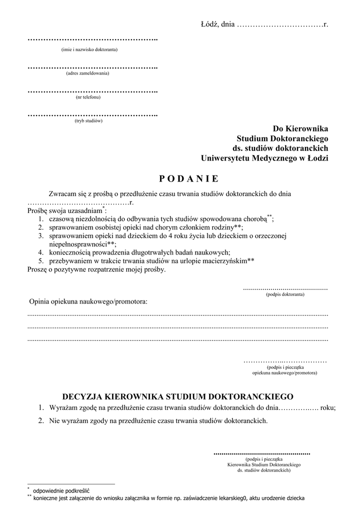 Łódź, dnia ……………………………r. ………………………………………….. (imie i nazwisko doktoranta) ………………………………………….. (adres zameldowania) ………………………………………….. (nr telefonu) ………………………………………….. (tryb studiów) Do Kierownika Studium Doktoranckiego ds. studiów doktoranckich Uniwersytetu Medycznego w Łodzi PODANIE Zwracam się z prośbą o przedłuŜenie czasu trwania studiów doktoranckich do dnia ……………………………………r. Prośbę swoja uzasadniam*: 1. czasową niezdolnością do odbywania tych studiów spowodowana chorobą**; 2. sprawowaniem osobistej opieki nad chorym członkiem rodziny**; 3. sprawowaniem opieki nad dzieckiem do 4 roku Ŝycia lub dzieckiem o orzeczonej niepełnosprawności**; 4. koniecznością prowadzenia długotrwałych badań naukowych; 5. przebywaniem w trakcie trwania studiów na urlopie macierzyńskim** Proszę o pozytywne rozpatrzenie mojej prośby. ........................................... (podpis doktoranta) Opinia opiekuna naukowego/promotora: ..................................................................................................................................................................... ..................................................................................................................................................................... ..................................................................................................................................................................... ……………..……………… (podpis i pieczątka opiekuna naukowego/promotora) DECYZJA KIEROWNIKA STUDIUM DOKTORANCKIEGO 1. WyraŜam zgodę na przedłuŜenie czasu trwania studiów doktoranckich do dnia………….…. roku; 2. Nie wyraŜam zgody na przedłuŜenie czasu trwania studiów doktoranckich. ................................................. (podpis i pieczątka Kierownika Studium Doktoranckiego ds. studiów doktoranckich) * ** odpowiednie podkreślić konieczne jest załączenie do wniosku załącznika w formie np. zaświadczenie lekarskieg0, aktu urodzenie dziecka
