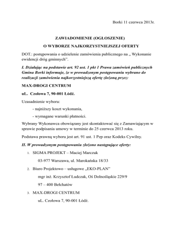 Borki 11 czerwca 2013r. ZAWIADOMIENIE (OGŁOSZENIE) O WYBORZE NAJKORZYSTNIEJSZEJ OFERTY DOT.: postępowania o udzielenie zamówienia publicznego na „ Wykonanie ewidencji dróg gminnych”. I. Działając na podstawie art. 92 ust. 1 pkt 1 Prawa zamówień publicznych Gmina Borki informuje, że w prowadzonym postępowaniu wybrano do realizacji zamówienia najkorzystniejszą ofertę złożoną przez: MAX-DROGI CENTRUM uL. Czołowa 7, 90-001 Łódź. Uzasadnienie wyboru: - najniższy koszt wykonania, - wymagane warunki płatności. Wybrany Wykonawca obowiązany jest skontaktować się z Zamawiającym w sprawie podpisania umowy w terminie do 25 czerwca 2013 roku. Podstawa prawną wyboru jest art. 91 ust. 1 Pzp oraz Kodeks Cywilny. II. W prowadzonym postępowaniu złożono następujące oferty: 1. SIGMA PROJEKT – Maciej Marczuk 03-977 Warszawa, ul. Marokańska 18/33 2. Biuro Projektowo – usługowe „EKO-PLAN” mgr inż. Krzysztof Łudczak, Oś Dolnośląskie 229/9 97 – 400 Bełchatów 3. MAX-DROGI CENTRUM uL. Czołowa 7, 90-001 Łódź. III. Działając na podstawie art. 92 ust. 1 pkt 3 Prawa zamówień publicznych Gmina Borki informuje, że w prowadzonym postępowaniu nie został wykluczony żaden Wykonawca. IV. Środki ochrony prawnej. Środki ochrony prawnej Od niniejszej decyzji przysługują , środki ochrony prawnej określone w ustawie z dnia 29 stycznia 2004 roku Prawo zamówień publicznych (Tj. Dz.U. z 2010 r. Nr 113, poz. 759 ze zm. – dział VI „Środki ochrony prawnej”. Wobec czynności podjętych przez Gminę Borki w toku postępowania oraz w przypadku zaniechania przez Gminę Borki czynności, do której jest zobowiązany na podstawie ustawy, można wnieść protest do Gminy Borki. Protest wnosi się w terminie 7 dni od dnia, w którym powzięto lub można było powziąć wiadomość o okolicznościach stanowiących podstawę wniesienia.