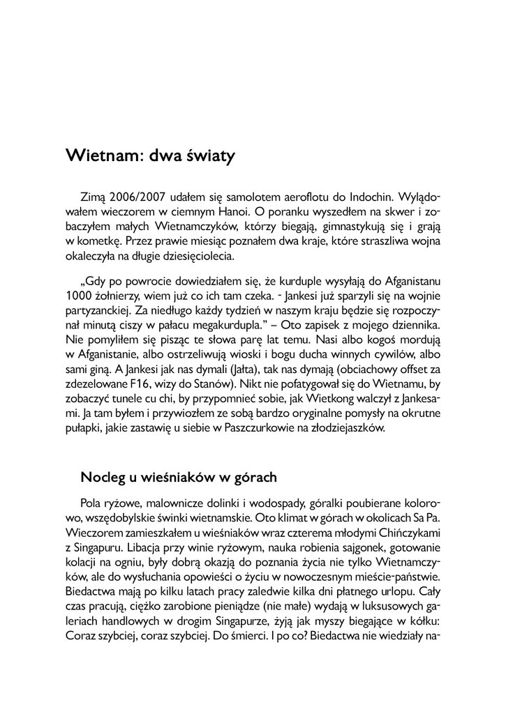 Wietnam: dwa światy Zimą 2006/2007 udałem się samolotem aeroflotu do Indochin. Wylądowałem wieczorem w ciemnym Hanoi. O poranku wyszedłem na skwer i zobaczyłem małych Wietnamczyków, którzy biegają, gimnastykują się i grają w kometkę. Przez prawie miesiąc poznałem dwa kraje, które straszliwa wojna okaleczyła na długie dziesięciolecia. „Gdy po powrocie dowiedziałem się, że kurduple wysyłają do Afganistanu 1000 żołnierzy, wiem już co ich tam czeka. - Jankesi już sparzyli się na wojnie partyzanckiej. Za niedługo każdy tydzień w naszym kraju będzie się rozpoczynał minutą ciszy w pałacu megakurdupla.” – Oto zapisek z mojego dziennika. Nie pomyliłem się pisząc te słowa parę lat temu. Nasi albo kogoś mordują w Afganistanie, albo ostrzeliwują wioski i bogu ducha winnych cywilów, albo sami giną. A Jankesi jak nas dymali (Jałta), tak nas dymają (obciachowy offset za zdezelowane F16, wizy do Stanów). Nikt nie pofatygował się do Wietnamu, by zobaczyć tunele cu chi, by przypomnieć sobie, jak Wietkong walczył z Jankesami. Ja tam byłem i przywiozłem ze sobą bardzo oryginalne pomysły na okrutne pułapki, jakie zastawię u siebie w Paszczurkowie na złodziejaszków. Nocleg u wieśniaków w górach Pola ryżowe, malownicze dolinki i wodospady, góralki poubierane kolorowo, wszędobylskie świnki wietnamskie. Oto klimat w górach w okolicach Sa Pa. Wieczorem zamieszkałem u wieśniaków wraz czterema młodymi Chińczykami z Singapuru. Libacja przy winie ryżowym, nauka robienia sajgonek, gotowanie kolacji na ogniu, były dobrą okazją do poznania życia nie tylko Wietnamczyków, ale do wysłuchania opowieści o życiu w nowoczesnym mieście-państwie. Biedactwa mają po kilku latach pracy zaledwie kilka dni płatnego urlopu. Cały czas pracują, ciężko zarobione pieniądze (nie małe) wydają w luksusowych galeriach handlowych w drogim Singapurze, żyją jak myszy biegające w kółku: Coraz szybciej, coraz szybciej. Do śmierci. I po co? Biedactwa nie wiedziały na- 122 Mój świat wet, co to libacja. Mi udawało się wytrzymać tempo narzucone przez naszych gospodarzy. Im wydawało się, że też. Spaliśmy pokotem na strychu na dechach i co chwila jedno z nich zbiegało na dół i jeszcze w drodze do pobliskiej sławojki jęczało „błeeeeeee….”. Rano młodzież poznała, co to kac. Indochińskie impresje „Tajemnicza zatoka Ha Long - ostańce przypominające mi wybrzeże koło Krabi, noc na łodzi wśród małych wysepek, farmy ryb na otwartym morzu, wyprawa do dżungli na Cat Ba, owoce morza bez granic.” „Tam Coc - jesteśmy na planie filmu Indochiny”. Indochiny to zieleń. Ale nie zwykła zieleń. Inodochiny to zieleń żarówiasta, soczysta, krzycząca. Zielone trawy i zarośla nad malowniczą i urokliwą rzeczką wśród skalnych ostańców. Różnozielone pola ryżowe wysoko w górach. Zieleń to spokój. Ukojenie. To najpiękniejszy z kolorów. Zawsze, gdy chcę wypocząć, uciekam w zieleń. Obojętnie, czy to moje ukochane Paszczurkowo na Mazurach, Poczesna na Jurze, Azja, czy Afryka ekwatorialna. Zieleń koi, likwiduje stres, pozwala odżyć i zaczerpnąć sił. Ludzie w Indochinach są spokojni, bo żyją wśród zieleni. Nie pędzą. Płyną powolutku łódkami, dżonkami. Gdyby nie to, że jedzą psy i koty, byłby to całkowicie spokojny, rajski obrazek. Sajgon Jakże inne od Hanoi jest miasto o nazwie Ho Chi Minh City. Zapisałem w moim dzienniku: „Sajgon - metropolia, sześć milionów motorowerów na ulicach, ruch całą dobę, bombowe bary”. Klimat sprzed wojny wietnamskiej. Wszystko takie żywiołowe. Nienawidzę wielkich miast. Brzydzę się Warszawą. Sylwester w Sajgonie był jednak najlepszy. Odbywał się pod znakiem „Good Morning Viet Nam!”, „Miss Sajgon!”. To prawdziwa metropolia. Wietnam: dwa światy 123 Polski pilot na Phu quoc W Sajgoinie po Sylwestrze wsiadłem w mały samolot Vietnam Airlines i poszybowałem na Phu quoc, wysepkę na pograniczu Wientamu i Kambodży. Gdy zająłem swoje miejsce, wysłuchałem z ust atrakcyjnej stewardessy instrukcji bezpieczeństwa. Następnie głos zabrał pilot. Poinformował po angielsku gdzie i jak lecimy, a następnie poprosił personel pokładowy o zajęcie miejsc do startu i … powiedział po polsku (!): „Pan w piątym rzędzie proszę zapiąć pasy”. Gdy po 40 minutach wylądowaliśmy na maleńkiej wysepce, z kabiny pilota wyszedł rosły gość z wielkimi wąsami. Od razu podszedłem do niego, przywitaliśmy się i ucięliśmy sobie dłuższą pogawędkę. Okazało się, że olał z kolegami LOT, żarłocznego fiskusa i ZUS, jest profesjonalistą, pracuje, zarabia, korzysta z uroków życia w pięknym kraju. Pracuje w nowozelandzkiej firmie, nie płaci podatków, ma wszystko w dalekim poważaniu. Żyje. Dwa światy Po kilku dniach oddechu wróciłem do Sajgonu. Wieczorem miałem samolot do Hanoi. Cały dzień spędziłem na łażeniu po wielkiej metropolii. Dzień wcześniej przemieszczałem się po ruchliwej Delcie Mekongu. „Delta Mekongu - plantacje owoców, ludzie żyją na rzece i z rzeki, pływający targ, tankowce na Mekongu śpieszące z ropą do Chin w towarzystwie małych dżonek”. Wieczór w Sajgonie jest magiczny. Masz wrażenie, że jest to jądro cywilizacji: ciągły ruch, optymizm na twarzach ludzi. Gdy po niecałych dwóch godzinach lotu wylądowałem w Hanoi, zastałem inny świat: szarość, ciszę. Tak oto zapisałem moje wrażenia w moim dzienniku: „Przelot wieczorem z kolorowego i optymistycznego Ho Chi Minh City do ponurego Hanoi - dwa światy, dwa kraje, dwa społeczeństwa”.