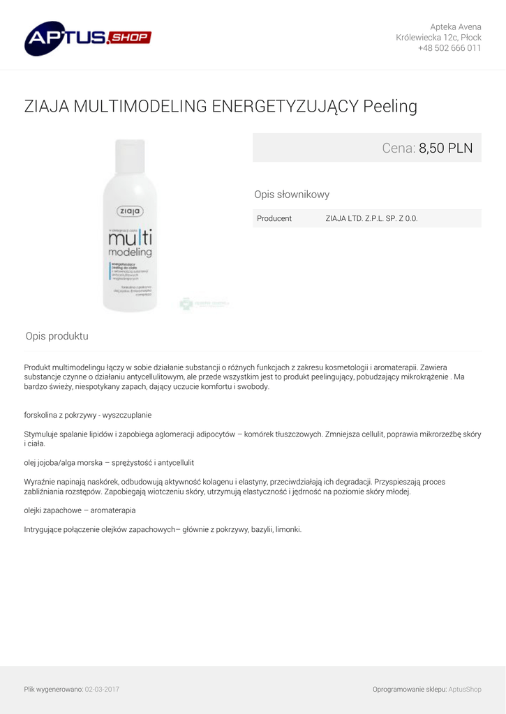 Apteka Avena Królewiecka 12c, Płock +48 502 666 011 ZIAJA MULTIMODELING ENERGETYZUJĄCY Peeling Cena: 8,50 PLN Opis słownikowy Producent ZIAJA LTD. Z.P.L. SP. Z 0.0. Opis produktu Produkt multimodelingu łączy w sobie działanie substancji o różnych funkcjach z zakresu kosmetologii i aromaterapii. Zawiera substancje czynne o działaniu antycellulitowym, ale przede wszystkim jest to produkt peelingujący, pobudzający mikrokrążenie . Ma bardzo świeży, niespotykany zapach, dający uczucie komfortu i swobody. forskolina z pokrzywy - wyszczuplanie Stymuluje spalanie lipidów i zapobiega aglomeracji adipocytów – komórek tłuszczowych. Zmniejsza cellulit, poprawia mikrorzeźbę skóry i ciała. olej jojoba/alga morska – sprężystość i antycellulit Wyraźnie napinają naskórek, odbudowują aktywność kolagenu i elastyny, przeciwdziałają ich degradacji. Przyspieszają proces zabliźniania rozstępów. Zapobiegają wiotczeniu skóry, utrzymują elastyczność i jędrność na poziomie skóry młodej. olejki zapachowe – aromaterapia Intrygujące połączenie olejków zapachowych– głównie z pokrzywy, bazylii, limonki. Plik wygenerowano: 02-03-2017 Powered by TCPDF (www.tcpdf.org) Oprogramowanie sklepu: AptusShop