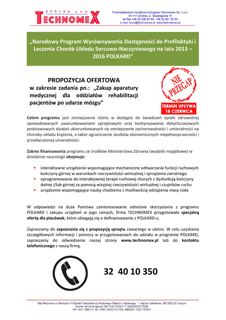 „Narodowy Program Wyrównywania Dostępności do Profilaktyki i Leczenia Chorób Układu Sercowo-Naczyniowego na lata 2013 – 2016 POLKARD” PROPOZYCJA OFERTOWA w zakresie zadania pn.: „Zakup aparatury medycznej dla oddziałów rehabilitacji pacjentów po udarze mózgu” Celem programu jest zmniejszenie różnic w dostępie do świadczeń opieki zdrowotnej spowodowanych uwarunkowaniami sprzętowymi oraz kontynuowanie dotychczasowych podstawowych działań ukierunkowanych na zmniejszenie zachorowalności i umieralności na choroby układu krążenia, a także ograniczenie skutków ekonomicznych niepełnosprawności i przedwczesnej umieralności. Zakres finansowania programu ze środków Ministerstwa Zdrowia (wydatki majątkowe) w dziedzinie neurologii obejmuje: interaktywne urządzenie wspomagające mechaniczne odtwarzanie funkcji ruchowych kończyny górnej w warunkach rzeczywistości wirtualnej i sprzężenia zwrotnego oprogramowanie do interaktywnej terapii ruchowej chorych z dysfunkcją kończyny dolnej i/lub górnej za pomocą wizyjnej rzeczywistości wirtualnej i czujników ruchu urządzenie wspomagające naukę chodzenia z możliwością odciążenia masy ciała W odpowiedzi na duże Państwa zainteresowanie odnośnie skorzystania z programu POLKARD i zakupu urządzeń w jego ramach, firma TECHNOMEX przygotowała specjalną ofertę dla placówek, które ubiegają się o dofinansowanie z POLKARD-u. Zapraszamy do zapoznania się z propozycją sprzętu zawartego w ulotce. W celu uzyskania szczegółowych informacji i pomocy w przygotowaniach do udziału w programie POLKARD, zapraszamy do odwiedzenia naszej strony www.technomex.pl lub do kontaktu telefonicznego z naszą firmą. 32 40 10 350 Interaktywne urządzenie wspomagające mechaniczne odtwarzanie funkcji ruchowych kończyny górnej w warunkach rzeczywistości wirtualnej i sprzężenia zwrotnego W skład zestawu wchodzi: Hand Tutor ™ oraz Arm Tutor™ Profesjonalne urządzenie do ćwiczeń czynnych ręki Wskazania do rehabilitacji z urządzeniem HandTutor™ rehabilitacja po udarze poprawa zręczności ręki po urazach czaszkowo-mózgowych drżenie rąk, spowolnienie ruchowe (m.in. w chorobie Parkinsona) wzmacnianie siły mięśniowej (m.in. stwardnienie rozsiane) mózgowe porażenie, spastyczność, ataksja i atetoza rozwojowe zaburzenia koordynacji (dyspraksja, syndrom niezdarnego dziecka) rehabilitacja dłoni po przeniesieniu ścięgna lub po doraźnym zespoleniu płytą metalową złamanie w obrębie nadgarstka uszkodzenia tkanek miękkich uszkodzenie splotu ramiennego, nerwu łokciowego i promieniowego ograniczony czynny zakres ruchomości działanie przeciwbólowe HandTutor™ to system oparty o koncepcje rehabilitacji, która zakłada, że powtarzane ćwiczenia czynne połączone z wizualnym sprzężeniem zwrotnym (Biofeedback) pozwalają na zwiększenie zakresu ruchomości, dokładności wykonywanych ruchów oraz ich szybkości. HandTutor™ i ArmTutor™ to systemy znajdujące szerokie zastosowanie w oddziałach rehabilitacji narządu ruchu, klinikach ortopedii i rehabilitacji, ośrodkach rehabilitacji ambulatoryjnej oraz w terapii domowej i nowej dziedzinie jaką staje się telerehabilitacja. Zestaw przeznaczony jest do rehabilitacji w zaburzeniach ruchowych kończyn górnych. ArmTutor™ składa się z bezpiecznych, wygodnych, łatwych w użytkowaniu klamer z wbudowanymi czujnikami pozycji i prędkości, które precyzyjnie odtwarzają trójpłaszczyznowy ruch. ArmTutor™ posiada wbudowany ogranicznik ruchu, co umożliwia dokładne wyznaczenie dynamicznych i pasywnych zakresów ruchu wyprostu i zgięcia dla stawu. Oprogramowanie daje terapeucie obiektywną i ilościową informację na temat postępów leczenia. Informacja ta pozwala w pełni dostosować sesję ćwiczeniową do aktualnych zdolności ruchowych pacjenta i wyboru zarówno ruchu izolowanego jak i ruchów łączonych. Wykorzystując koncepcję sprzężenia zwrotnego system zapewnia pacjentowi dostosowanie intensywności aktywnych ćwiczeń do jego możliwości co prowadzi do szybkiego powrotu utraconych funkcji i poprawy jakości życia. Oprogramowanie do interaktywnej terapii ruchowej chorych z dysfunkcją kończyny dolnej i/lub górnej za pomocą wizyjnej rzeczywistości wirtualnej i czujników ruchu Zestaw Pablo Max Pablo Maks to kompaktowy, przenośny zestaw urządzeń oferujących pakiet możliwości pomocnych w rehabilitacji w dysfunkcjach motorycznych kończyny górnej. Pablo jest narzędziem, które z jednej strony służy do pomiarów diagnostycznych, a z drugiej do terapii funkcjonalnej z zastosowaniem sprzężenia zwrotnego. Zestaw gier (ćwiczeń) pozwala w pełni dostosować sesję ćwiczeniową do aktualnych możliwości pacjenta. Pablo umożliwia wykonanie najbardziej różnorodnych ruchów ściskowych ręki takich jak chwyt cylindryczny, prostowanie, stretching, chwyty szczypcowe, mierząc ich siłę w tym samym czasie. Urządzenie mierzy również zakres ruchomości w stawach kończyny górnej (ramienny, łokciowy, nadgarstkowy) poprzez zintegrowane czujniki pozycji. Oprogramowanie zintegrowane z kartoteką pacjenta pozwalana na przedstawienie wszystkich wyników pomiarów i ćwiczeń w sposób numeryczny i graficzny przekazując bardzo przejrzystą informację na temat postępów terapii. Zakresy ruchu: staw ramienny-zginanie, prostowanie, odwodzenie, przywodzenie 0°-180° staw łokciowy-zginanie, prostowanie 0°-180°; pronacja, supinacja -90°-0-90° nadgarstek - zginanie-prostowanie -90°-0-90°, odwiedzenie dopromieniowe-dołkociowe 40°-20° Charakterystyka: chwyt cylindryczny – pomiar do 1000 N (lub 100kg) chwyty szczypcowe – pomiar do 200 N (lub 20kg) W skład zestawu wchodzi przystawka Multiball do trójpłaszczyznowego ruchu w stawie nadgarstkowym i przystawka Multiboard do łączonej terapii wszystkich części kończyny górnej. Urządzenie wspomagające naukę chodzenia z możliwością odciążenia masy ciała Syst