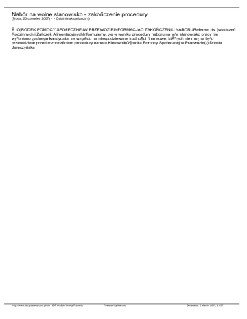 Nabór na wolne stanowisko - zakoñczenie procedury (¶roda, 20 czerwiec 2007) - - Ostatnia aktualizacja ()  O¦RODEK POMOCY SPO£ECZNEJW PRZEWOZIEINFORMACJAO ZAKOÑCZENIU NABORUReferent ds. ¦wiadczeñ Rodzinnych i Zaliczek AlimentacyjnychInformujemy, ¿e w wyniku procedury naboru na w/w stanowisko pracy nie wy³oniono ¿adnego kandydata, ze wzglêdu na niespodziewane trudno¶ci finansowe, których nie mo¿na by³o przewidzieæ przed rozpoczêciem procedury naboru.KierownikO¶rodka Pomocy Spo³ecznej w Przewozie(-) Dorota Jereczyñska http://www.bip.przewoz.com.pl/bip - BIP Urzêdu Gminy Przewóz Powered by Mambo Generated: 2 March, 2017, 21:57