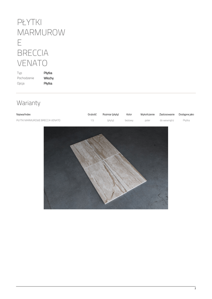 PŁYTKI MARMUROW E BRECCIA VENATO Typ Płytka Pochodzenie Włochy Opcja Płytka Warianty Nazwa/Index PŁYTKI MARMUROWE BRECCIA VENATO Grubość Rozmiar (płyty) Kolor Wykończenie Zastosowanie Dostępne jako 1.5 (płyty) beżowy poler do wewnątrz Płytka 1