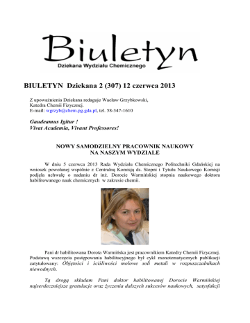 BIULETYN Dziekana 2 (307) 12 czerwca 2013 Z upoważnienia Dziekana redaguje Wacław Grzybkowski, Katedra Chemii Fizycznej. E-mail: [email protected], tel. 58-347-1610 Gaudeamus Igitur ! Vivat Academia, Vivant Professores! NOWY SAMODZIELNY PRACOWNIK NAUKOWY NA NASZYM WYDZIALE W dniu 5 czerwca 2013 Rada Wydziału Chemicznego Politechniki Gdańskiej na wniosek powołanej wspólnie z Centralną Komisją ds. Stopni i Tytułu Naukowego Komisji podjęła uchwałę o nadaniu dr inż. Dorocie Warmińskiej stopnia naukowego doktora habilitowanego nauk chemicznych w zakresie chemii. Pani dr habilitowana Dorota Warmińska jest pracownikiem Katedry Chemii Fizycznej. Podstawą wszczęcia postępowania habilitacyjnego był cykl monotematycznych publikacji zatytułowany: Objętości i ściśliwości molowe soli metali w rozpuszczalnikach niewodnych. Tą drogą składam Pani doktor habilitowanej Dorocie Warmińskiej najserdeczniejsze gratulacje oraz życzenia dalszych sukcesów naukowych, satysfakcji z pracy dydaktycznej oraz zdrowia i wszelkiej pomyślności w życiu rodzinnym i osobistym. Profesor Sławomir Milewski Dziekan XI BAŁTYCKI FESTIWAL NAUKI NA NASZYM WYDZIALE XI Bałtycki Festiwal Nauki w tym roku odbył się w dniach 22-26.05.2013. Mimo niezbyt dobrej pogody nasze imprezy odwiedziło około 11 000 osób, o 50 % więcej niż w roku ubiegłym. Wydział Chemiczny przygotował najwięcej imprez (52) ze wszystkich wydziałów PG. W organizację imprez zaangażowanych było 161 osób, w tym 28 doktorantów i aż 105 studentów. Na podkreślenie zasługuje duże zaangażowanie studentów, szczególnie członków kół naukowych, Koła Studentów Biotechnologii PG oraz Naukowego Koła Chemików i Sekcji Studenckiej Oddziału Gdańskiego Polskiego Towarzystwa Chemicznego „Hybryda”. Po raz pierwszy uczestniczyła też sekcja KS ISPE (International Society for Pharmaceutic Engineering). Nasze imprezy odbywały się również gościnnie w Lipnicy, Borowym Młynie i Brzeźnie Szlacheckim. Imprezy cieszyły się bardzo dużym zainteresowaniem, szczególnie pokazy reakcji chemicznych przygotowane przez NKCh oraz przez Katedrę Chemii Nieorganicznej oraz Katedrę Chemii Analitycznej. Zmieniające się kolory, wybuchy, płonące chmury – to zawsze wzbudza duże zainteresowanie wszystkich widzów, od malucha po seniora. Generalni przeważała tematyka ekologiczna, biotechnologiczna oraz związana z odnawialnymi źródłami energii. Jak zwykle dużym zainteresowaniem cieszyła się przygotowana przez studentów z „Hybrydy” Chemia kuchenna oraz konkursy i pokazy przygotowane przez biotechnologów (DNA, mikroflora skóry, stanowisko fermentacyjne i mikroskopowe). Można się było też dowiedzieć i co ważne zobaczyć, jak można wytwarzać energię wykorzystując słońce (świetny piec słoneczny), gaz ziemny, warzywa i owoce a nawet bakterie. W wielu przypadkach odwiedzający mogli sami przeprowadzać doświadczenia, np. budować urządzenia będące odnawialnymi źródłami energii, oznaczać rtęć w swoich włosach produkować polimer z ziemniaka czy biopaliwo. Tematyka była różnorodna i każdy mógł znaleźć coś ciekawego dla siebie. Nic więc dziwnego, że odwiedziła nas tak duża liczba słuchaczy i widzów od dzieci w wieku przedszkolnym przez młodzież szkolną po seniorów. Były to zarówno grupy zorganizowane młodzieży szkolnej, jak i rodziny. W festiwalu czynny udział brał również Samorząd Studentów Wydziału Chemicznego PG organizując przed budynkiem Chemii A punkt informacyjny, w którym można było także sprawdzić się w układankach sprawnościowo-logicznych. Wszystkim, którzy uczestniczyli w organizacji X Bałtyckiego Festiwalu Nauki należą się duże brawa i podziękowania. Jest to świetny przykład wyjścia naukowców do społeczeństwa, promocji nauki i uczelni oraz szkoła pracy społecznej. prof. dr. hab. inż. Marek Biziuk Koordynator BFN na Wydziale Chemicznym EFEKT MODYFIKACJI INDEKSU HIRSCHA W ostatnim majowym wydaniu tygodnika POLITYKA (22/2909) profesor Janusz Gil z Uniwersytetu Zielonogórskiego przedstawił i porównał dwa rankingi polskich uczelni. Pierwszy z nich opierał się indeks Hirscha, a drugi o jego modyfikację. Ze względu na to, że nie wszyscy PT Czytelnicy Biuletynu czytają Politykę przedstawiam obszerne fragmenty tego opracowania i pewne ważne fakty. Pierwotnymi parametrami naukometrycznymi liczba publikacji i liczba cytowań. Średnia liczba cytowań jest przykładem parametru pochodnego. Innym ważnym parametrem pochodnym jest wspomniany wyżej indeks Hirscha, wprowadzony w 2005 r. przez amerykańskiego fizyka Jorge E. Hirscha. Parametr ten został przyjęty jako wiarygodna miara zdolności publikowania ważnych (często cytowanych) artykułów. Trzeba bowiem sobie uświadomić, że wysoka liczba cytowań autora czy uczelni (zbioru autorów) może oznaczać zarówno wysoką średnią „cytowalność”, jak również jedną bardzo często cytowaną publikację (przebój) i dużą liczbę artykułów przechodzących bez echa. Problem ten uwzględnia właśnie indeks Hirscha, oznaczany tradycyjnie literą h. Jest to liczba publikacji z całej puli zarejestrowanej w danej bazie, z których każdy był cytowany co najmniej h razy. Zatem parametr h mierzy jednocześnie produktywność i jakość publikacji uczonego lub zbioru uczonych. Popularność indeksu Hirscha wynika z tego, że oddaje on dobrze zdolność danego autora do systematycznego publikowania ważnych, często cytowanych prac. Jednakże w przypadku oceny instytucji ma on wadę polegającą na faworyzowaniu uczelni większych, które zwykle publikują więcej prac naukowych i nawet przy niewielkiej liczbie cytowań uzyskują większe wartości indeksu h. Aby zniwelować wpływ wielkości instytucji wprowadzono w 2008 r. nowy parametr pochodny, tak zwany zmodyfikowany indeks Hirscha hm = h/N0.4. Zauważmy, że jest to w przybliżeniu indeks h podzielony przez pierw