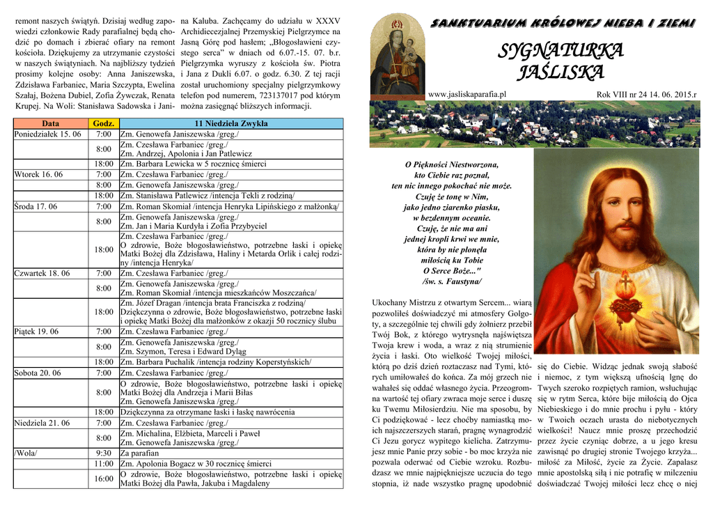 remont naszych świątyń. Dzisiaj według zapowiedzi członkowie Rady parafialnej będą chodzić po domach i zbierać ofiary na remont kościoła. Dziękujemy za utrzymanie czystości w naszych świątyniach. Na najbliższy tydzień prosimy kolejne osoby: Anna Janiszewska, Zdzisława Farbaniec, Maria Szczypta, Ewelina Szałaj, Bożena Dubiel, Zofia Żywczak, Renata Krupej. Na Woli: Stanisława Sadowska i JaniData Poniedziałek 15. 06 Wtorek 16. 06 Środa 17. 06 Czwartek 18. 06 Piątek 19. 06 Sobota 20. 06 Niedziela 21. 06 /Wola/ na Kaluba. Zachęcamy do udziału w XXXV Archidiecezjalnej Przemyskiej Pielgrzymce na Jasną Górę pod hasłem; „Błogosławieni czystego serca” w dniach od 6.07.-15. 07. b.r. Pielgrzymka wyruszy z kościoła św. Piotra i Jana z Dukli 6.07. o godz. 6.30. Z tej racji został uruchomiony specjalny pielgrzymkowy telefon pod numerem, 723137017 pod którym można zasięgnąć bliższych informacji. Godz. 11 Niedziela Zwykła 7:00 Zm. Genowefa Janiszewska /greg./ Zm. Czesława Farbaniec /greg./ 8:00 Zm. Andrzej, Apolonia i Jan Patlewicz 18:00 Zm. Barbara Lewicka w 5 rocznicę śmierci 7:00 Zm. Czesława Farbaniec /greg./ 8:00 Zm. Genowefa Janiszewska /greg./ 18:00 Zm. Stanisława Patlewicz /intencja Tekli z rodziną/ 7:00 Zm. Roman Skomiał /intencja Henryka Lipińskiego z małżonką/ Zm. Genowefa Janiszewska /greg./ 8:00 Zm. Jan i Maria Kurdyła i Zofia Przybyciel Zm. Czesława Farbaniec /greg./ O zdrowie, Boże błogosławieństwo, potrzebne łaski i opiekę 18:00 Matki Bożej dla Zdzisława, Haliny i Metarda Orlik i całej rodziny /intencja Henryka/ 7:00 Zm. Czesława Farbaniec /greg./ Zm. Genowefa Janiszewska /greg./ 8:00 Zm. Roman Skomiał /intencja mieszkańców Moszczańca/ Zm. Józef Dragan /intencja brata Franciszka z rodziną/ 18:00 Dziękczynna o zdrowie, Boże błogosławieństwo, potrzebne łaski i opiekę Matki Bożej dla małżonków z okazji 50 rocznicy ślubu 7:00 Zm. Czesława Farbaniec /greg./ Zm. Genowefa Janiszewska /greg./ 8:00 Zm. Szymon, Teresa i Edward Dyląg 18:00 Zm. Barbara Puchalik /intencja rodziny Koperstyńskich/ 7:00 Zm. Czesława Farbaniec /greg./ O zdrowie, Boże błogosławieństwo, potrzebne łaski i opiekę 8:00 Matki Bożej dla Andrzeja i Marii Biłas Zm. Genowefa Janiszewska /greg./ 18:00 Dziękczynna za otrzymane łaski i łaskę nawrócenia 7:00 Zm. Czesława Farbaniec /greg./ Zm. Michalina, Elżbieta, Marceli i Paweł 8:00 Zm. Genowefa Janiszewska /greg./ 9:30 Za parafian 11:00 Zm. Apolonia Bogacz w 30 rocznicę śmierci O zdrowie, Boże błogosławieństwo, potrzebne łaski i opiekę 16:00 Matki Bożej dla Pawła, Jakuba i Magdaleny Sanktuarium Królowej Nieba i Ziemi SYGNATURKA JAŚLISKA www.jasliskaparafia.pl Rok VIII nr 24 14. 06. 2015.r O Piękności Niestworzona, kto Ciebie raz poznał, ten nic innego pokochać nie może. Czuję że tonę w Nim, jako jedno ziarenko piasku, w bezdennym oceanie. Czuję, że nie ma ani jednej kropli krwi we mnie, która by nie płonęła miłością ku Tobie O Serce Boże..." /św. s. Faustyna/ Ukochany Mistrzu z otwartym Sercem... wiarą pozwoliłeś doświadczyć mi atmosfery Golgoty, a szczególnie tej chwili gdy żołnierz przebił Twój Bok, z którego wytrysnęła najświętsza Twoja krew i woda, a wraz z nią strumienie życia i łaski. Oto wielkość Twojej miłości, którą po dziś dzień roztaczasz nad Tymi, których umiłowałeś do końca. Za mój grzech nie wahałeś się oddać własnego życia. Przeogromna wartość tej ofiary zwraca moje serce i duszę ku Twemu Miłosierdziu. Nie ma sposobu, by Ci podziękować - lecz choćby namiastką moich najszczerszych starań, pragnę wynagrodzić Ci Jezu gorycz wypitego kielicha. Zatrzymujesz mnie Panie przy sobie - bo moc krzyża nie pozwala oderwać od Ciebie wzroku. Rozbudzasz we mnie najpiękniejsze uczucia do tego stopnia, iż nade wszystko pragnę upodobnić się do Ciebie. Widząc jednak swoją słabość i niemoc, z tym większą ufnością lgnę do Twych szeroko rozpiętych ramion, wsłuchując się w rytm Serca, które bije miłością do Ojca Niebieskiego i do mnie prochu i pyłu - który w Twoich oczach urasta do niebotycznych wielkości! Naucz mnie proszę przechodzić przez życie czyniąc dobrze, a u jego kresu zawisnąć po drugiej stronie Twojego krzyża... miłość za Miłość, życie za Życie. Zapalasz mnie apostolską siłą i nie potrafię w milczeniu doświadczać Twojej miłości lecz chcę o niej głosić wszelkiemu stworzeniu, bo radość rozpiera me serce. Całą swą duszę zatapiam w Tobie, pragnąc jedynie Ciebie. Nie gaś tego pragnienia Panie, niech ono spala mnie chwila po chwili. Jak wielką łaską jest poznawać Ciebie Boże, miłować i pracować w Twojej winnicy. Język tego nie wypowie i nie ujmie w słowa, pozostaje więc wymowna cisza, która zdradza potęgę tajemnicy... Bądź uwielbiony, bądź pochwalony Boże Nieskończony. Amen. Pielgrzymka do Włoch do Relikwii Całunu Turyńskiego w Turynie zwiedzanie Wenecji, Werony, Mediolanu i Padwy /c.d./ O godz. 14:33 byliśmy na wysokości Klagenfurtu, stolicy Karyntii, nad górskim jeziorem Viterzi ośrodkiem sportów wodnych. Tutaj zatrzymaliśmy się na chwilę, aby skorzystać z toalety, zaczerpnąć świeżego powietrza, wypocząć nieco i rozprostować zmęczone nogi przed dalszą podróżą. Jadąc dalej naszym autokarem po drodze mijaliśmy górskie rzeki, w tym Sawę, minęliśmy także górskie jezioro Fakrezi i miasto Villach, z którego wywodzi się słynny austriacki skoczek narciarski Thomas Morgenstern. Niedługo potem byliśmy przy granicy włoskiej. W poniedziałek, 18 maja 2015 roku po południu o godzinie 15:5253 nasz autokar bez zatrzymywania się przejechał granicę austriacko- włoską i wszyscy znaleźliśmy się na terenie Włoch. Wkrótce wyjechaliśmy z ośnieżonych szczytów Alp i wjechaliśmy na Nizinę Padańską. Jest to najgęściej zaludniona część kraju i główna rolnicza urodzajna nizina Włoch,