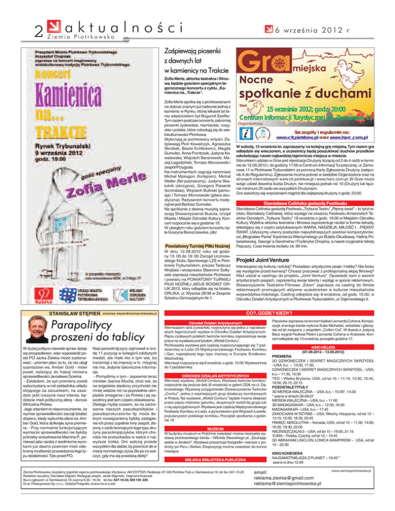 2 aktualności 6 września 2012 r Ziemia Piotrkowska Zaśpiewają piosenki z dawnych lat w kamienicy na Trakcie Zofia Merle, aktorka teatralna i filmowa, będzie gościem specjalnym tegorocznego koncertu z cyklu „Kamienica na...Trakcie". Zofia Merle spotka się z piotrkowianami na dobrze znanym już balkonie jednej z kamienic w Rynku, której kilkaset lat temu właścicielem był Bogumił Szeffer. Tym razem podczas koncertu zabrzmią piosenki żydowskie, niemieckie, rosyjskie i polskie, które odwołują się do wielokulturowości Piotrkowa. Wykonają je piotrkowscy artyści. Zaśpiewają Piotr Kowalczyk, Agnieszka Skrobek, Beata Królikiewicz, Magda Gumulec, Anna Frontczak, Justyna Kowalewska, Wojciech Baranowski, Maciej Łagodziński, Tomasz Morozowski i zespół Przygoda. Na instrumentach zagrają natomiast Michał Makagon (fortepian), Michał Walter (flet poprzeczny), Justyna Skatulnik (skrzypce), Grzegorz Piasecki (kontrabas), Wojciech Buliński (perkusja) i Tomasz Morozowski (gitara akustyczna). Reżyserem koncertu tradycyjnie jest Bartosz Gumulec. Na spotkanie z dawną muzyką zapraszają Stowarzyszenie Busola, Urząd Miasta i Miejski Ośrodek Kultury. Koncert rozpocznie się o godzinie 19. W ubiegłym roku gościem koncertu była Grażyna Barszczewska.(dk) Powiatowy Turniej Piłki Nożnej W dniu 12.09.2012 roku od godziny 15: 00 do 19: 00 Zarząd Uczniowskiego Klubu Sportowego LZS w Piotrkowie Trybunalskim, prezes Tadeusz Wojdala i wiceprezes Sławomir Sołtysiak zaprasza mieszkańców Piotrkowa i powiatu na POWIATOWY TURNIEJ PIŁKI NOŻNEJ „MOJE BOISKO” ORLIK 2012, który odbędzie się na boisku ORLIKA, ul. Wysoka 28/38 w Zespole Szkolno-Gimnazjalnym Nr 1. STANISŁAW STĘPIEŃ Stanisława Celińska gwiazdą Festiwalu Stanisława Celińska gwiazdą Festiwalu „TrybunaTeatru” „Piękny świat” – to tytuł recitalu Stanisławy Celińskiej, która wystąpi na otwarciu Festiwalu Amatorskich Teatrów Dorosłych „Trybuna Teatru” 18 września o godz. 19.00 w Miejskim Ośrodku Kultury. Wybitna aktorka teatralna i filmowa zaprezentuje recital w formie tetrady, składający się z części zatytułowanych: WIARA, NADZIEJA, MIŁOŚĆ I…PIĘKNY ŚWIAT. Usłyszymy utwory poetyckie najwybitniejszych poetówi kompozytorów: od „Błogosław Panie” Kazimierza Wierzyńskiego po Bułata Okudżawę, Halinę Poświatowską, George`a Gershwina i Fryderyka Chopina, a nawet oryginalne teksty Papuszy. Czas trwania recitalu: ok. 90 min. Projekt Joint Venture Interesujesz się kulturą i sztuką? Posiadasz artystyczne pasje i hobby? Nie boisz się występów przed kamerą? Chcesz pracować z profesjonalną ekipą filmową? Weź udział w castingu do projektu „Joint Venture”. Opowiedz nam o swoich artystycznych pasjach, zaprezentuj swoje talenty i wystąp w spocie reklamowym. Stowarzyszenie Teatralno-Filmowe „Eikon” zaprasza na casting do filmów reklamowych promujących aktywne uczestnictwo w kulturze mieszkańców województwa łódzkiego. Casting odbędzie się: 8 września, od godz. 10.00, w Ośrodku Działań Artystycznych w Piotrkowie Trybunalskim, ul. Dąbrowskiego 5. CO?, GDZIE? KIEDY? [email protected] Parapolitycy proszeni do tablicy W dużej polityce niewiele spraw dzieje się przypadkowo, więc wypowiedź posła PO Jacka Żaleka może zastanawiać: - premier płaci za to, że nie uległ szantażowi ws. Amber Gold - mówi poseł, należący do frakcji ministra sprawiedliwości Jarosława Gowina. - Zakładam, że syn premiera został wykorzystany w roli zakładnika układu stojącego za oszustwem, na zasadzie: jeśli ruszycie nasz interes, będziecie mieli polityczną aferę - donosi Wirtualna Polska. Jego zdaniem to nieporozumienie, że wymiar sprawiedliwości zaczął działać dopiero, kiedy wybuchła afera ws.Amber Gold, która dotknęła syna premiera: - Przy normalnie funkcjonującym wymiarze sprawiedliwości nie byłoby potrzeby aresztowania Marcina P., ponieważ jako osoba z siedmioma wyrokami już dawno powinien mieć odebraną możliwość prowadzenia tego typu działalności.Tyle poseł PO. W sobotę, 15 września br. zapraszamy na kolejną grę miejską.Tym razem gra odbędzie się wieczorem, a uczestnicy będą poszukiwać duchów przodków odwiedzając nawet najbardziej tajemnicze miejsca w mieście. Warunkiem udziału w Grze jest rejestracja Drużyny liczącej od 2 do 4 osób w terminie do 12.09.2012 r.do godziny 17:00 w Centrum Informacji Turystycznej, ul.Zamurowa 11 w Piotrkowie Trybunalskim za pomocą Karty Zgłoszenia Drużyny (załącznik A do Regulaminu). Zgłoszenia można pobrać w siedzibie Organizatora oraz na stronach internetowych www.cit.piotrkow.pl i www.harc.com.pl. W Grze może wziąć udział dowolna liczba Drużyn, nie mniejsza jednak niż 10 (Drużyn) lub łącznie minimum 25 osób we wszystkich Drużynach. Gra zakończy się wręczeniem nagród dla najlepszej drużyny o godz. 23:00. Nasi paraolimijczycy zajmowali w środę 11 pozycję w kategorii zdobytych medali, ale mało kto o tym wie, bo transmisji z tej imprezy w tv misyjnej nie ma. Jedynie lakoniczne informacje. - Pomyślimy o tym - zapewnia teraz minister Joanna Mucha, choć wie, że na angielskie stadiony przychodzi nie mniej widzów niż na poprzednie olimpijskie zmagania i że Polska i jej zawodnicy jest tam często oklaskiwana. Dlatego myślę czasem, że na zachowania naszych pseudopolityków i pseudoprokuratorów itp. może dobrym rozwiązaniemy byłoby zastąpienie ich przez zupełnie inny zespół, złożony z osób tworzących tego typu drużyny paraolimpijczyków, którym choroba nie przeszkadza w walce o najwyższe trofea. Oni walczą przede wszystkim dla siebie, by powrócić do w miarę normalnego życia.Bo po co walczyć, gdy ma się poselską dietę? Ośrodek Działań Artystycznych Wernisażem dziś (czwartek) rozpoczyna się jedna z najciekawszych tegorocznych wystaw w Ośrodku Działań Artystycznych. Pięciu czołowych polskich twórców komiksu zaprezent