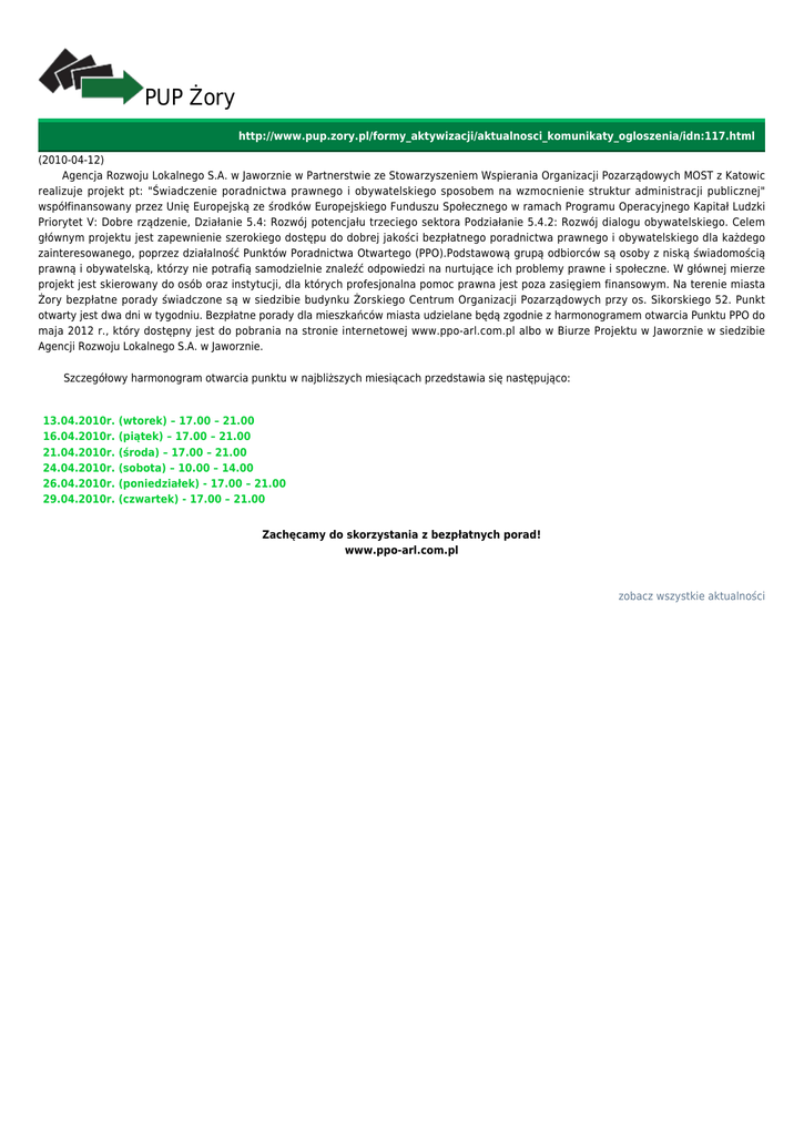 PUP Żory http://www.pup.zory.pl/formy_aktywizacji/aktualnosci_komunikaty_ogloszenia/idn:117.html (2010-04-12) Agencja Rozwoju Lokalnego S.A. w Jaworznie w Partnerstwie ze Stowarzyszeniem Wspierania Organizacji Pozarządowych MOST z Katowic realizuje projekt pt: "Świadczenie poradnictwa prawnego i obywatelskiego sposobem na wzmocnienie struktur administracji publicznej" współfinansowany przez Unię Europejską ze środków Europejskiego Funduszu Społecznego w ramach Programu Operacyjnego Kapitał Ludzki Priorytet V: Dobre rządzenie, Działanie 5.4: Rozwój potencjału trzeciego sektora Podziałanie 5.4.2: Rozwój dialogu obywatelskiego. Celem głównym projektu jest zapewnienie szerokiego dostępu do dobrej jakości bezpłatnego poradnictwa prawnego i obywatelskiego dla każdego zainteresowanego, poprzez działalność Punktów Poradnictwa Otwartego (PPO).Podstawową grupą odbiorców są osoby z niską świadomością prawną i obywatelską, którzy nie potrafią samodzielnie znaleźć odpowiedzi na nurtujące ich problemy prawne i społeczne. W głównej mierze projekt jest skierowany do osób oraz instytucji, dla których profesjonalna pomoc prawna jest poza zasięgiem finansowym. Na terenie miasta Żory bezpłatne porady świadczone są w siedzibie budynku Żorskiego Centrum Organizacji Pozarządowych przy os. Sikorskiego 52. Punkt otwarty jest dwa dni w tygodniu. Bezpłatne porady dla mieszkańców miasta udzielane będą zgodnie z harmonogramem otwarcia Punktu PPO do maja 2012 r., który dostępny jest do pobrania na stronie internetowej www.ppo-arl.com.pl albo w Biurze Projektu w Jaworznie w siedzibie Agencji Rozwoju Lokalnego S.A. w Jaworznie. Szczegółowy harmonogram otwarcia punktu w najbliższych miesiącach przedstawia się następująco: 13.04.2010r. 16.04.2010r. 21.04.2010r. 24.04.2010r. 26.04.2010r. 29.04.2010r. (wtorek) – 17.00 – 21.00 (piątek) – 17.00 – 21.00 (środa) – 17.00 – 21.00 (sobota) – 10.00 – 14.00 (poniedziałek) - 17.00 – 21.00 (czwartek) - 17.00 – 21.00 Zachęcamy do skorzystania z bezpłatnych porad! www.ppo-arl.com.pl zobacz wszystkie aktualności