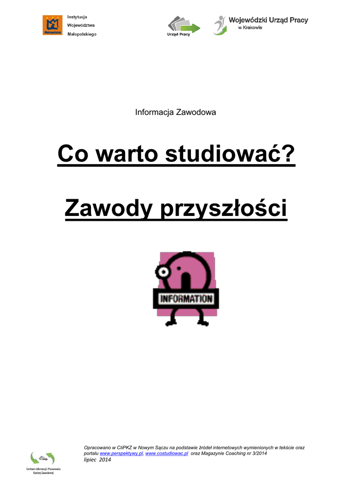 Informacja Zawodowa Co warto studiować? Zawody przyszłości Opracowano w CIiPKZ w Nowym Sączu na podstawie źródeł internetowych wymienionych w tekście oraz portalu www.perspektywy.pl, www.costudiowac.pl oraz Magazynie Coaching nr 3/2014 lipiec 2014 „Co warto studiować?” – to pytanie zadaje sobie wielu młodych ludzi, którzy stoją przed podjęciem decyzji o wyborze kierunku studiów. Uczelnie kuszą coraz ciekawszymi nazwami kierunków, obiecują bonusy, pracę w przyszłości, pełną wyzwań i możliwości. Jaka faktycznie jest prawda? Warto sprawdzić. Najlepszą metodą na uzyskanie informacji o kierunku jest udział w targach edukacyjnych, uczestnictwie w drzwiach otwartych uczelni, pozyskaniem informacji bezpośrednio od studentów konkretnych kierunków. Co należy wziąć pod uwagę wybierając kierunek studiów: 1. Zainteresowania zawodowe i pozazawodowe – ważne jest nasze hobby, pasja, która może być w przyszłości również sposobem na życie. To, co sprawia nam przyjemność jako hobby, będzie niewątpliwie przyjemnością w pracy zawodowej. 2. Predyspozycje zawodowe - warto je poznać, zanim podejmiemy decyzję o wyborze kierunku. Predyspozycje to nasz inklinacje do wykonywania określonych zawodów; mogą to być min. predyspozycje społeczne, badawcze, przedsiębiorcze, artystyczne, realistyczne, konwencjonalne itp. Co się kryje pod ich nazwą, warto sprawdzić i skonsultować z doradcą zawodowym. Doradca zawodowy, zaproponuje konkretny test badający predyspozycje, określi potencjał zawodowy i wskaże możliwe ścieżki kształcenia w danym zawodzie. 3. Analizę zasobów finansowych - warto dodać, że w Polsce pomimo, że studia stacjonarne są bezpłatne, studiowanie bywa kosztowne. Związane jest to często z wyjazdem do innego miasta, wynajęciem mieszkania, akademika, kosztem życia itp. 4. Możliwości podjęcia pracy w zawodzie po ukończeniu studiów – często uczelnie, prowadzą badania losów absolwentów. Na ich podstawie można określić perspektywy i szanse na podjęcie zatrudnienia w zawodzie. Warto poznać rynek pracy oraz zapotrzebowanie na określone zawody i branże. Przydatnym narzędziem Małopolskiego Obserwatorium Rynku Pracy i Edukacji może być barometr zawodów – stosowany w PUP – ach. Pokazuje on obraz sytuacji –( zapotrzebowania na określone zawody): Opracowano w CIiPKZ w Nowym Sączu na podstawie źródeł internetowych wymienionych w tekście oraz portalu www.perspektywy.pl, www.costudiowac.pl oraz Magazynie Coaching nr 3/2014 lipiec 2014 zawodów deficytowych, w których w najbliższym roku nie powinno być trudności ze znalezieniem pracy, gdyż zapotrzebowanie pracodawców będzie w ich przypadku duże, a podaż pracowników chętnych do podjęcia zatrudnienia i mających odpowiednie kwalifikacje – niewielka, zawodów zrównoważonych, w których liczba ofert pracy będzie zbliżona do liczby osób zdolnych i chętnych do podjęcia zatrudnienia w danym zawodzie (podaż i popyt zrównoważą się), zawodów nadwyżkowych, w których znalezienie pracy może być trudniejsze ze względu na małe zapotrzebowanie oraz wielu kandydatów chętnych do podjęcia pracy i spełniających wymagania pracodawców. te informacje można sprawdzić na stronie internetowej: http://www.barometr.obserwatorium.malopolska.pl/ 5. Dobór kierunku studiów do prognozowanego zapotrzebowania na pracowników - przed Tobą około 5 lat solidnej pracy, która ma przekształcić się w dochodową inwestycję w samego siebie ((wg http://www.costudiowac.pl/)) 6. Studiowanie niszowego kierunku - mała liczba fachowców na rynku wpłynie na zapotrzebowanie oraz na wynagrodzenie Najlepsze kierunki studiów (wg. rankingu uczelni z 2014 roku) http://www.costudiowac.pl/kierunki-studiow#sthash.myD8jLYJ.dpuf Kierunki HUMANISTYCZNE Filologie, języki obce i językoznawstwo Filologia polska Filozofia Historia Kulturoznawstwo Wiedza o krajach i regionach Teologia Kierunki SPOŁECZNE Dziennikarstwo i komunikacja społeczna Politologia Opracowano w CIiPKZ w Nowym Sączu na podstawie źródeł internetowych wymienionych w tekście oraz portalu www.perspektywy.pl, www.costudiowac.pl oraz Magazynie Coaching nr 3/2014 lipiec 2014 - Pedagogika i edukacja Psychologia Socjologia Kierunki ekonomiczne Prawo i administracja Kierunki ŚCISŁE Matematyka Fizyka i astronomia Chemia Kierunki PRZYRODNICZE Kierunki przyrodnicze Ochrona środowiska Kierunki TECHNICZNE Automatyka i robotyka, Mechatronika Elektrotechnika Energetyka Mechanika i budowa maszyn Architektura i urbanistyka, Budownictwo Elektronika i telekomunikacja Inżynieria i technologia chemiczna Inżynieria materiałowa Kierunki IT Inżynieria produkcji Kierunki techniczne (pozostałe) Kierunki ROLNICZE, LEŚNE i WETERYNARYJNE Kierunki o żywieniu i żywności Kierunki rolnicze i leśne Weterynaria Opracowano w CIiPKZ w Nowym Sączu na podstawie źródeł internetowych wymienionych w tekście oraz portalu www.perspektywy.pl, www.costudiowac.pl oraz Magazynie Coaching nr 3/2014 lipiec 2014 Kierunki MEDYCZNIE i o ZDROWIU Kierunki lekarskie i dentystyczne Farmacja Ochrona zdrowia Wychowanie fizyczne Kierunki ARTYSTYCZNE Kierunki muzyczne Kierunki plastyczne Kierunki teatralne i filmowe http://www.costudiowac.pl/kierunki-studiow#sthash.myD8jLYJ.dpuf http://www.costudiowac.pl/kierunki-studiow#sthash.myD8jLYJ.dpuf 7. Analiza popełnianych błędów studentów przy wyborze kierunku studiów unikniesz niedopasowania się do rynku (przykładem może być wielka popularność kierunku "zarządzanie", po którym mało kto dostawał dobrą pracę) 8. Zapoznanie z zawodami przyszłości - „60% zawodów przyszłości, które za 10 lat zostaną uznane za najlepsze, jeszcze nie wymyślono” – przekonuje Thomas Frey, dyrektor futurystycznego DaVinci Institute (Magazyn Coaching nr 3/2014). Zawody przyszłości (Magazyn Coaching nr 3/2014): nauczyciel ciekawości (nauczyciel sztuki odrywania) pobudzająca ciekawo