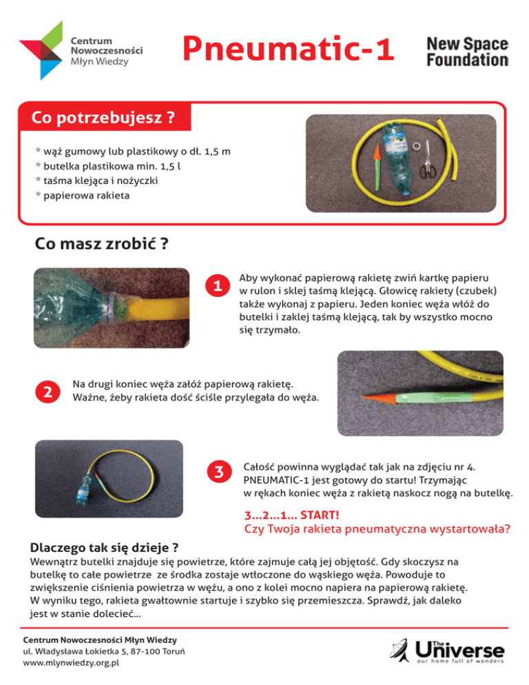 Pneumatic-1 Co potrzebujesz ? * wąż gumowy lub plastikowy o dł. 1,5 m * butelka plastikowa min. 1,5 l * taśma klejąca i nożyczki * papierowa rakieta Co masz zrobić ? 1 2 Aby wykonać papierową rakietę zwiń kartkę papieru w rulon i sklej taśmą klejącą. Głowicę rakiety (czubek) także wykonaj z papieru. Jeden koniec węża włóż do butelki i zaklej taśmą klejącą, tak by wszystko mocno się trzymało. Na drugi koniec węża załóż papierową rakietę. Ważne, żeby rakieta dość ściśle przylegała do węża. 3 Całość powinna wyglądać tak jak na zdjęciu nr 4. PNEUMATIC-1 jest gotowy do startu! Trzymając w rękach koniec węża z rakietą naskocz nogą na butelkę. 3…2…1… START! Czy Twoja rakieta pneumatyczna wystartowała? Dlaczego tak się dzieje ? Wewnątrz butelki znajduje się powietrze, które zajmuje całą jej objętość. Gdy skoczysz na butelkę to całe powietrze ze środka zostaje wtłoczone do wąskiego węża. Powoduje to zwiększenie ciśnienia powietrza w wężu, a ono z kolei mocno napiera na papierową rakietę. W wyniku tego, rakieta gwałtownie startuje i szybko się przemieszcza. Sprawdź, jak daleko jest w stanie dolecieć… Centrum Nowoczesności Młyn Wiedzy ul. Władysława Łokietka 5, 87-100 Toruń www.mlynwiedzy.org.pl