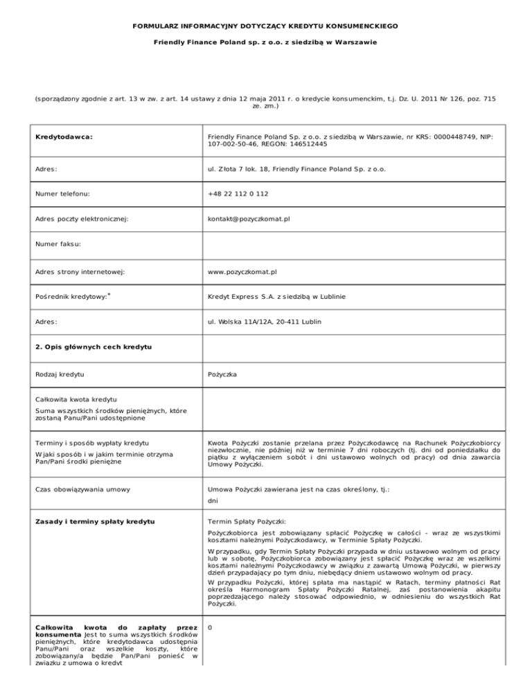 FORMULARZ INFORMACYJNY DOTYCZĄCY KREDYTU KONSUMENCKIEGO Friendly Finance Poland sp. z o.o. z siedzibą w Warszawie (s porządzony zgodnie z art. 13 w zw. z art. 14 us tawy z dnia 12 maja 2011 r. o kredycie kons umenckim, t.j. Dz. U. 2011 Nr 126, poz. 715 ze. zm.) Kredytodawca: Friendly Finance Poland Sp. z o.o. z s iedzibą w Wars zawie, nr KRS: 0000448749, NIP: 107-002-50-46, REGON: 146512445 Adres : ul. Z łota 7 lok. 18, Friendly Finance Poland Sp. z o.o. Numer telefonu: +48 22 112 0 112 Adres poczty elektronicznej: [email protected] Numer faks u: Adres s trony internetowej: www.pozyczkomat.pl Poś rednik kredytowy:* Kredyt Expres s S.A. z s iedzibą w Lublinie Adres : ul. Wols ka 11A/12A, 20-411 Lublin 2. Opis głównych cech kredytu Rodzaj kredytu Pożyczka Całkowita kwota kredytu Suma ws zys tkich ś rodków pieniężnych, które zos taną Panu/Pani udos tępnione Terminy i s pos ób wypłaty kredytu W jaki s pos ób i w jakim terminie otrzyma Pan/Pani ś rodki pieniężne Kwota Pożyczki zos tanie przelana przez Pożyczkodawcę na Rachunek Pożyczkobiorcy niezwłocznie, nie później niż w terminie 7 dni roboczych (tj. dni od poniedziałku do piątku z wyłączeniem s obót i dni us tawowo wolnych od pracy) od dnia zawarcia Umowy Pożyczki. Czas obowiązywania umowy Umowa Pożyczki zawierana jes t na czas okreś lony, tj.: dni Zasady i terminy spłaty kredytu Termin Spłaty Pożyczki: Pożyczkobiorca jes t zobowiązany s płacić Pożyczkę w całoś ci - wraz ze ws zys tkimi kos ztami należnymi Pożyczkodawcy, w Terminie Spłaty Pożyczki. W przypadku, gdy Termin Spłaty Pożyczki przypada w dniu us tawowo wolnym od pracy lub w s obotę, Pożyczkobiorca zobowiązany jes t s płacić Pożyczkę wraz ze ws zelkimi kos ztami należnymi Pożyczkodawcy w związku z zawartą Umową Pożyczki, w pierws zy dzień przypadający po tym dniu, niebędący dniem us tawowo wolnym od pracy. W przypadku Pożyczki, której s płata ma nas tąpić w Ratach, terminy płatnoś ci Rat okreś la Harmonogram Spłaty Pożyczki Ratalnej, zaś pos tanowienia akapitu poprzedzającego należy s tos ować odpowiednio, w odnies ieniu do ws zys tkich Rat Pożyczki. Całkowita kwota do zapłaty przez konsumenta Jes t to s uma ws zys tkich ś rodków pieniężnych, które kredytodawca udos tępnia Panu/Pani oraz ws zelkie kos zty, które zobowiązany/a będzie Pan/Pani ponieś ć w związku z umową o kredyt 0 związku z umową o kredyt Kredyt wiązany lub w formie odroczonej płatności* NIE DOTYCZ Y -opis towaru lub us ługi: NIE DOTYCZ Y -cena: NIE DOTYCZ Y Wymagane zabezpieczenia kredytu* Z abezpieczenie jakie będzie Pan/Pani mus iał/a przeds tawić w związku z umową o kredyt NIE DOTYCZ Y Informacja czy umowa o kredyt przewiduje gwarancję spłaty całkowitej kwoty kredytu wypłaconej na jej podstawie * Jeżeli zgodnie z pos tanowieniami umowy o kredyt płatnoś ci dokonywane przez Pana/Panią nie s ą zaliczane do s płaty całkowitej kwoty kredytu, ale będą wykorzys tywane do zgromadzenia kapitału przez okres y i na zas adach okreś lonych w umowie o kredyt lub w umowie dodatkowej, to umowa o kredyt nie przewiduje gwarancji s płaty całkowitej kwoty kredytu wypłaconej na jej pods tawie NIE DOTYCZ Y 3. Koszty kredytu Stopa oprocentowania warunki jej zmiany kredytu oraz W okres ie obowiązywania Umowy Pożyczki, s topa oprocentowania Pożyczki jes t s tała i wynos i 0 %. Rzeczywista roczna stopa oprocentowania Jes t to całkowity kos zt kredytu ponos zony przez kons umenta, wyrażony jako wartoś ć procentowa całkowitej kwoty kredytu w s tos unku rocznym przeds tawiona aby pomóc Panu/Pani w porównaniu oferowanych kredytów % Obowiązek zawarcia umowy dodatkowej Do uzys kania kredytu konieczne jes t zawarcie NIE DOTYCZ Y przez Pana/Panią umowy dodatkowej, w s zczególnoś ci umowy ubezpieczenia lub innej umowy Koszty, które zobowiązany/a będzie Pan/Pani ponieść w związku z umową o kredyt* Prowizja za udzielenie Pożyczki w kwocie Kos zty prowadzenia jednego lub kilku rachunków w celu dokonywania wpłat i wypłat ś rodków pieniężnych* NIE DOTYCZ Y Kos zty korzys tania z kart kredytowych* NIE DOTYCZ Y Inne kos zty, które kons ument zobowiązany jes t ponieś ć w związku z umową Opłata weryfikacyjna w kwocie 0,01 zł‚ dokonywana z Rachunku Pożyczkobiorcy – zwracana Pożyczkobiorcy; Prowizja za Przedłużenie Terminu Spłaty Pożyczki (dotyczy Umowy Pożyczki z Jednym Terminem Spłaty), w wys okoś ci zgodnej z Tabelą Opłat i Prowizji obowiązującą w dniu złożenia wnios ku o Przedłużenie Terminu Spłaty Pożyczki. złożenia wnios ku o Przedłużenie Terminu Spłaty Pożyczki. Warunki, na jakich kos zty związane z umową o kredyt mogą ulegać zmianie* NIE DOTYCZ Y Opłaty notarialne * NIE DOTYCZ Y Skutek braku płatności W przypadku opóźnienia w s płacie Pożyczki, Pożyczkodawca zas trzega s obie możliwoś ć naliczenia ods etek za czas opóźnienia w wys okoś ci równej dwukrotnoś ci s umy s topy referencyjnej Narodowego Banku Pols kiego i 5,5 punktów procentowych (ods etki maks ymalne za opóźnienie). W przypadku łącznego s pełnienia przes łanek okreś lonych w art. 14 lub 16, 17 bądź 18 us tawy z dnia 9 kwietnia 2010 r. o udos tępnianiu informacji gos podarczych i wymianie danych gos podarczych (t. j. w Dz. U. z 2014 r., poz. 1015 z późn. zm., dalej jako: „UIG”), Pożyczkodawca jes t uprawniony do przekazania informacji o zobowiązaniach Pożyczkobiorcy do Biur Informacji Gos podarczej, co może mieć wpływ na zdolnoś ć kredytową Pożyczkobiorcy. Pożyczkodawca ma prawo przekazać informacje o zobowiązaniach Pożyczkobiorcy do Biura Informacji Kredytowej. W przypadku opóźnienia w s płacie Pożyczki (braku płatnoś ci), Pożyczkodawca jes t uprawniony do podjęcia działań zmierzających do zas pokojenia wierzytelnoś ci Pożyczkodawcy wynikających z zawartej Umowy Pożyczki, polegających w s zczególnoś ci na: - wys yłaniu 