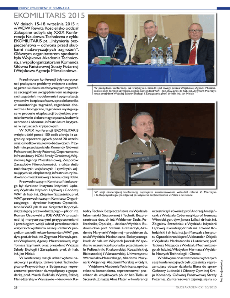 KURSY, KONFERENCJE, SEMINARIA EKOMILITARIS 2015 W dniach 15-18 września 2015 r. w WDW Rewita Kościelisko oddział Zakopane odbyła się XXIX Konferencja Naukowo-Techniczna z cyklu EKOMILITARIS pt. „Inżynieria bezpieczeństwa – ochrona przed skutkami nadzwyczajnych zagrożeń”. Głównym organizatorem spotkania była Wojskowa Akademia Techniczna, a współorganizatorami Komenda Główna Państwowej Straży Pożarnej i Wojskowa Agencja Mieszkaniowa. 28 W prezydium konferencji, już tradycyjnie, zasiedli (od lewej): prezes Wojskowej Agencji Mieszkaniowej mgr Tomasz Szymanik, rektor-komendant WAT gen. dyw. prof. dr hab. inż. Zygmunt Mierczyk oraz prezydent Wyższej Szkoły Ekologii i Zarządzania prof. dr hab. inż. Jan Misiak W sesji otwierającej konferencję największe zainteresowanie wzbudził referat Z. Mierczyka i K. Kopczyńskiego (na zdjęciu) pt. Inżynieria bezpieczeństwa w Polsce i na świecie tedry Technik Bezpieczeństwa na Wydziale Informatyki Stosowanej i Technik Bezpieczeństwa doc. dr inż. Waldemar Szulc, Politechnikę Opolską – dziekan Wydziału Budownictwa prof. Stefania Grzeszczyk, Akademię Marynarki Wojennej – prodziekan ds. nauki Wydziału Mechaniczno-Elektrycznego kmdr dr hab. inż. Wojciech Jurczak. W spotkaniu uczestniczyli ponadto przedstawiciele Politechnik: Krakowskiej, Koszalińskiej, Białostockiej i Warszawskiej, Uniwersytetu Warmińsko-Mazurskiego, Akademii Marynarki Wojennej i Akademii Morskiej w Gdyni. Wojskową Akademię Techniczną, oprócz rektora-komendanta, reprezentował prorektor ds. wojskowych płk dr hab. Tadeusz Szczurek. Z naszej Alma Mater w konferencji uczestniczyli również: prof.Andrzej Ameljańczyk z Wydziału Cybernetyki; prof. Ireneusz Winnicki, gen. dyw. Janusz Lalka i dr hab. inż. Zbigniew Szcześniak z Wydziału Inżynierii Lądowej i Geodezji; dr hab. inż. Edward Kołodziński i dr hab. inż. Jan Marczak z Instytutu Optoelektroniki; prof.Aleksander Olejnik z Wydziału Mechatroniki i Lotnictwa; prof. Tadeusz Niezgoda z Wydziału Mechanicznego; dr hab. inż.Władysław Harmata z Wydziału Nowych Technologii i Chemii. Wnikliwymi obserwatorami wybranych sesji konferencyjnych byli uczestnicy reprezentujący obszar działania Biura do spraw Ochrony Ludności i Obrony Cywilnej Kraju Komendy Głównej Państwowej Straży Pożarnej. Zainteresowani zajmują się na co GŁOS AKADEMICKI 10/2015 Fot. Ewa Jankiewicz Przedmiotem konferencji były teoretyczne i praktyczne problemy związane z ochroną przed skutkami nadzwyczajnych zagrożeń ze szczególnym uwzględnieniem następujących zagadnień: modelowanie i optymalizacja systemów bezpieczeństwa, optoelektronika w monitoringu zagrożeń, zagrożenia chemiczne i biologiczne, zagrożenia występujące w procesie eksploatacji budynków, promieniowanie elektromagnetyczne, budowle ochronne i obronne, infrastruktura krytyczna w sytuacjach kryzysowych. W XXIX konferencji EKOMILITARIS wzięło udział ponad 150 osób z kraju i z zagranicy, reprezentujących ponad 20 uczelni oraz ośrodków naukowo-badawczych. Przybyli m.in. przedstawiciele: Komendy Głównej Państwowej Straży Pożarnej, Departamentu Infrastruktury MON, Straży Granicznej,Wojskowej Agencji Mieszkaniowej, Zespołów Zarządców Nieruchomości, a także służb technicznych wojskowych i cywilnych, zajmujących się eksploatacją infrastruktury budowlano-mieszkaniowej z terenu całej Polski. Przewodniczącym Komitetu Naukowego był dyrektor Instytutu Inżynierii Lądowej Wydziału Inżynierii Lądowej i Geodezji WAT dr hab. inż. Zbigniew Szcześniak, prof. WAT; przewodniczącym Komitetu Organizacyjnego – dyrektor Instytutu Optoelektroniki WAT płk dr inż. Krzysztof Kopczyński; zastępcą przewodniczącego – płk dr inż. Roman Ostrowski z IOE WAT. W pracach nad jej merytorycznymi przygotowaniami i przebiegiem wzięli udział przedstawiciele wszystkich wydziałów naszej uczelni.W prezydium zasiedli: rektor-komendant WAT gen. dyw. prof. dr hab. inż. Zygmunt Mierczyk, prezes Wojskowej Agencji Mieszkaniowej mgr Tomasz Szymanik oraz prezydent Wyższej Szkoły Ekologii i Zarządzania prof. dr hab. inż. Jan Misiak. W konferencji wzięli udział wybitni naukowcy i praktycy. Uniwersytet Technologiczno-Przyrodniczy z Bydgoszczy reprezentował prorektor ds. współpracy z gospodarką prof. Marek Bieliński, Wyższą Szkołę Menedżerską w Warszawie – kierownik Ka- KURSY, KONFERENCJE, SEMINARIA Fot. Archiwum konferencji, Ewa Jankiewicz dzień utrzymaniem i eksploatacją schronów dla ludności.Wśród uczestników dużą grupę stanowili również zarządcy nieruchomości i mieszkań wojskowych podległych Wojskowej Agencji Mieszkaniowej. Ponad 50 osób z nich pozytywnie zaliczyło pisemny sprawdzian prowadzony przez dwie komisje kierowane przez dr. hab. inż. Zbigniewa Szcześniaka oraz dr. inż. Jarosława Wasilczuka.W opinii kierownictw wymienionych instytucji, rozważana tematyka przyczyniła się w istotny sposób do podniesienia wiedzy i udoskonalenia kwaliikacji zawodowych. Obrady plenarne EKOMILITARIS 2015 odbywały się w 4 sesjach tematycznych, na których zaprezentowano 65 referatów. W sesji otwierającej konferencję wygłoszono następujące referaty: Mierczyk Z., Kopczyński K. – Inżynieria bezpieczeństwa w Polsce i na świecie; Szcześniak Z., Sobiech M.,Wasilczuk J.: Innowacyjne obiekty obronne; Mueller F.: Zabezpieczenie meteorologiczne i oceanograiczne dowództw i jednostek NATO; Koss A., Płuska I.: Prace konserwatorskie dwóch budynków więźniarskich dawnego niemieckiego nazistowskiego obozu koncentracyjnego i zagłady Auschwitz-Birkenau w Oświęcimiu. Serdeczne podziękowania należą się zespołom profesorów, członków Komitetu Naukowego za sprawne i profesjonalne prowadzenie obrad na pozostałych sesjach, a szczególnie: prof. Markowi Bielińskiemu – prorektorowi UTP Bydgoszcz; prof. Andrzejowi Ameljańczykowi z Wydziału Cybernetyki WAT; dr. hab. inż. Zbigniewowi Szcześniakow