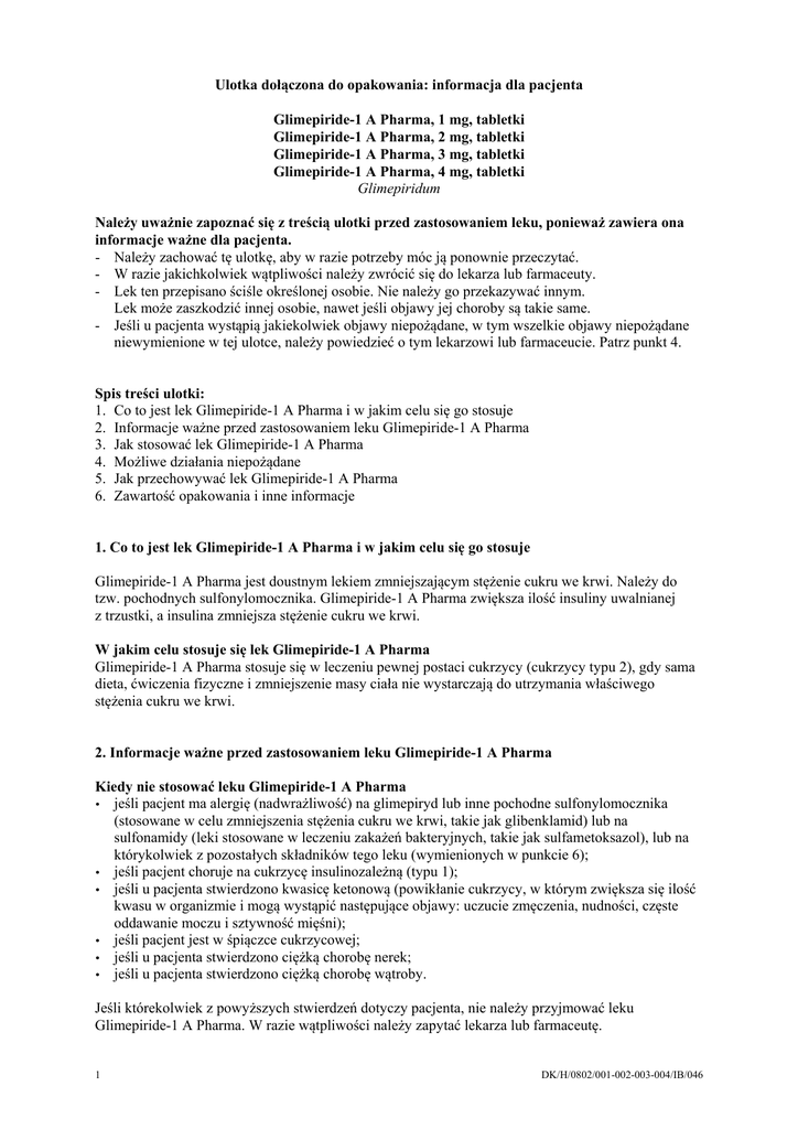 Ulotka dołączona do opakowania: informacja dla pacjenta Glimepiride-1 A Pharma, 1 mg, tabletki Glimepiride-1 A Pharma, 2 mg, tabletki Glimepiride-1 A Pharma, 3 mg, tabletki Glimepiride-1 A Pharma, 4 mg, tabletki Glimepiridum Należy uważnie zapoznać się z treścią ulotki przed zastosowaniem leku, ponieważ zawiera ona informacje ważne dla pacjenta. - Należy zachować tę ulotkę, aby w razie potrzeby móc ją ponownie przeczytać. - W razie jakichkolwiek wątpliwości należy zwrócić się do lekarza lub farmaceuty. - Lek ten przepisano ściśle określonej osobie. Nie należy go przekazywać innym. Lek może zaszkodzić innej osobie, nawet jeśli objawy jej choroby są takie same. - Jeśli u pacjenta wystąpią jakiekolwiek objawy niepożądane, w tym wszelkie objawy niepożądane niewymienione w tej ulotce, należy powiedzieć o tym lekarzowi lub farmaceucie. Patrz punkt 4. Spis treści ulotki: 1. Co to jest lek Glimepiride-1 A Pharma i w jakim celu się go stosuje 2. Informacje ważne przed zastosowaniem leku Glimepiride-1 A Pharma 3. Jak stosować lek Glimepiride-1 A Pharma 4. Możliwe działania niepożądane 5. Jak przechowywać lek Glimepiride-1 A Pharma 6. Zawartość opakowania i inne informacje 1. Co to jest lek Glimepiride-1 A Pharma i w jakim celu się go stosuje Glimepiride-1 A Pharma jest doustnym lekiem zmniejszającym stężenie cukru we krwi. Należy do tzw. pochodnych sulfonylomocznika. Glimepiride-1 A Pharma zwiększa ilość insuliny uwalnianej z trzustki, a insulina zmniejsza stężenie cukru we krwi. W jakim celu stosuje się lek Glimepiride-1 A Pharma Glimepiride-1 A Pharma stosuje się w leczeniu pewnej postaci cukrzycy (cukrzycy typu 2), gdy sama dieta, ćwiczenia fizyczne i zmniejszenie masy ciała nie wystarczają do utrzymania właściwego stężenia cukru we krwi. 2. Informacje ważne przed zastosowaniem leku Glimepiride-1 A Pharma Kiedy nie stosować leku Glimepiride-1 A Pharma jeśli pacjent ma alergię (nadwrażliwość) na glimepiryd lub inne pochodne sulfonylomocznika (stosowane w celu zmniejszenia stężenia cukru we krwi, takie jak glibenklamid) lub na sulfonamidy (leki stosowane w leczeniu zakażeń bakteryjnych, takie jak sulfametoksazol), lub na którykolwiek z pozostałych składników tego leku (wymienionych w punkcie 6); jeśli pacjent choruje na cukrzycę insulinozależną (typu 1); jeśli u pacjenta stwierdzono kwasicę ketonową (powikłanie cukrzycy, w którym zwiększa się ilość kwasu w organizmie i mogą wystąpić następujące objawy: uczucie zmęczenia, nudności, częste oddawanie moczu i sztywność mięśni); jeśli pacjent jest w śpiączce cukrzycowej; jeśli u pacjenta stwierdzono ciężką chorobę nerek; jeśli u pacjenta stwierdzono ciężką chorobę wątroby. Jeśli którekolwiek z powyższych stwierdzeń dotyczy pacjenta, nie należy przyjmować leku Glimepiride-1 A Pharma. W razie wątpliwości należy zapytać lekarza lub farmaceutę. 1 DK/H/0802/001-002-003-004/IB/046 Ostrzeżenia i środki ostrożności Przed zastosowaniem leku należy omówić to z lekarzem lub farmaceutą, jeśli: pacjent powraca do zdrowia po urazie, operacji, zakażeniu przebiegającym z gorączką lub po innych rodzajach stresu, gdyż może być konieczna czasowa zmiana leczenia, u pacjenta stwierdzono ciężkie zaburzenia czynności wątroby lub nerek. W razie wątpliwości, czy którekolwiek z tych stanów dotyczy pacjenta, przed zażyciem leku Glimepiride-1 A Pharma należy skonsultować się z lekarzem lub farmaceutą. U pacjentów z niedoborem enzymu dehydrogenazy glukozo-6-fosforanowej może wystąpić zmniejszenie stężenia hemoglobiny i rozpad krwinek czerwonych (niedokrwistość hemolityczna). Informacja na temat stosowania leku Glimepiride-1 A Pharma u osób w wieku poniżej 18 lat jest ograniczona, dlatego nie zaleca się jego podawania pacjentom tej grupy wiekowej. Istotne informacje o hipoglikemii (małym stężeniu cukru we krwi) U pacjentów przyjmujących Glimepiride-1 A Pharma może wystąpić hipoglikemia (małe stężenie cukru we krwi). Należy zapoznać się z poniższymi dodatkowymi informacjami na temat hipoglikemii, jej objawów i leczenia. Następujące czynniki mogą zwiększać ryzyko hipoglikemii: niedożywienie, nieregularne spożywanie posiłków, pomijanie lub opóźnianie posiłków, okresowe głodzenie, zmiany diety, przyjmowanie większej ilości leku Glimepiride-1 A Pharma niż zalecona, osłabiona czynność nerek, ciężka choroba wątroby, szczególna choroba o podłożu hormonalnym (zaburzenia czynności tarczycy, przysadki mózgowej lub kory nadnerczy), spożywania alkoholu (zwłaszcza z jednoczesnym pomijaniem posiłków), jednoczesnego przyjmowania niektórych leków (patrz niżej „Glimepiride-1 A Pharma a inne leki”), zwiększenia wysiłku fizycznego bez spożywania wystarczających posiłków lub spożywania posiłków zawierających mniej węglowodanów niż zwykle. Objawami hipoglikemii mogą być: napady głodu, ból głowy, nudności, wymioty, ospałość, senność, zaburzenia snu, niepokój ruchowy, agresja, osłabiona koncentracja, zmniejszona czujność i czas reakcji, depresja, dezorientacja, zaburzenia mowy i widzenia, niewyraźna mowa, drżenie, częściowe porażenie, zaburzenia czucia, zawroty głowy, bezradność. ponadto mogą wystąpić: pocenie się, wilgotność skóry, niepokój, przyspieszona czynność serca, wysokie ciśnienie tętnicze krwi, kołatanie serca, nagły, promieniujący silny ból w klatce piersiowej (dławica piersiowa) i zaburzenia rytmu serca. Jeśli stężenie cukru zmniejsza się w dalszym ciągu, mogą wystąpić: silne splątanie (majaczenie), drgawki, utrata samokontroli, płytki oddech i zwolniona czynność serca, utrata przytomności. Obraz kliniczny znacznego zmniejszenia stężenia glukozy we krwi może przypominać udar mózgu. Leczenie hipoglikemii W większości przypadków objawy zmniejszonego stężenia glukozy we krwi ustępują bardzo s