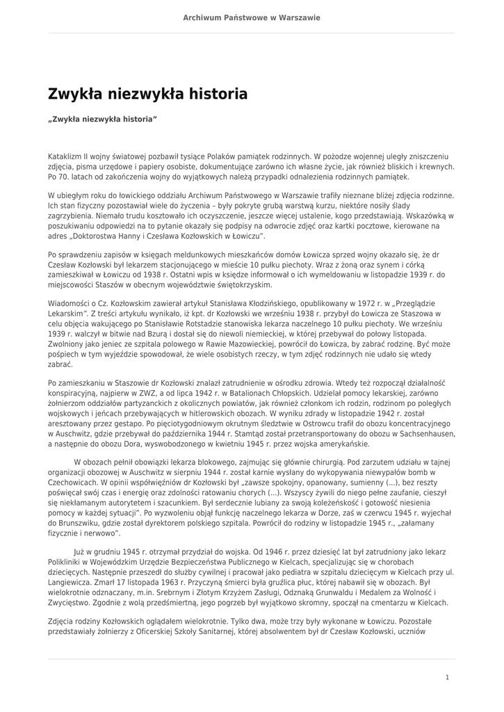 Archiwum Państwowe w Warszawie Zwykła niezwykła historia „Zwykła niezwykła historia” Kataklizm II wojny światowej pozbawił tysiące Polaków pamiątek rodzinnych. W pożodze wojennej uległy zniszczeniu zdjęcia, pisma urzędowe i papiery osobiste, dokumentujące zarówno ich własne życie, jak również bliskich i krewnych. Po 70. latach od zakończenia wojny do wyjątkowych należą przypadki odnalezienia rodzinnych pamiątek. W ubiegłym roku do łowickiego oddziału Archiwum Państwowego w Warszawie trafiły nieznane bliżej zdjęcia rodzinne. Ich stan fizyczny pozostawiał wiele do życzenia – były pokryte grubą warstwą kurzu, niektóre nosiły ślady zagrzybienia. Niemało trudu kosztowało ich oczyszczenie, jeszcze więcej ustalenie, kogo przedstawiają. Wskazówką w poszukiwaniu odpowiedzi na to pytanie okazały się podpisy na odwrocie zdjęć oraz kartki pocztowe, kierowane na adres „Doktorostwa Hanny i Czesława Kozłowskich w Łowiczu”. Po sprawdzeniu zapisów w księgach meldunkowych mieszkańców domów Łowicza sprzed wojny okazało się, że dr Czesław Kozłowski był lekarzem stacjonującego w mieście 10 pułku piechoty. Wraz z żoną oraz synem i córką zamieszkiwał w Łowiczu od 1938 r. Ostatni wpis w księdze informował o ich wymeldowaniu w listopadzie 1939 r. do miejscowości Staszów w obecnym województwie świętokrzyskim. Wiadomości o Cz. Kozłowskim zawierał artykuł Stanisława Kłodzińskiego, opublikowany w 1972 r. w „Przeglądzie Lekarskim”. Z treści artykułu wynikało, iż kpt. dr Kozłowski we wrześniu 1938 r. przybył do Łowicza ze Staszowa w celu objęcia wakującego po Stanisławie Rotstadzie stanowiska lekarza naczelnego 10 pułku piechoty. We wrześniu 1939 r. walczył w bitwie nad Bzurą i dostał się do niewoli niemieckiej, w której przebywał do połowy listopada. Zwolniony jako jeniec ze szpitala polowego w Rawie Mazowieckiej, powrócił do Łowicza, by zabrać rodzinę. Być może pośpiech w tym wyjeździe spowodował, że wiele osobistych rzeczy, w tym zdjęć rodzinnych nie udało się wtedy zabrać. Po zamieszkaniu w Staszowie dr Kozłowski znalazł zatrudnienie w ośrodku zdrowia. Wtedy też rozpoczął działalność konspiracyjną, najpierw w ZWZ, a od lipca 1942 r. w Batalionach Chłopskich. Udzielał pomocy lekarskiej, zarówno żołnierzom oddziałów partyzanckich z okolicznych powiatów, jak również członkom ich rodzin, rodzinom po poległych wojskowych i jeńcach przebywających w hitlerowskich obozach. W wyniku zdrady w listopadzie 1942 r. został aresztowany przez gestapo. Po pięciotygodniowym okrutnym śledztwie w Ostrowcu trafił do obozu koncentracyjnego w Auschwitz, gdzie przebywał do października 1944 r. Stamtąd został przetransportowany do obozu w Sachsenhausen, a następnie do obozu Dora, wyswobodzonego w kwietniu 1945 r. przez wojska amerykańskie. W obozach pełnił obowiązki lekarza blokowego, zajmując się głównie chirurgią. Pod zarzutem udziału w tajnej organizacji obozowej w Auschwitz w sierpniu 1944 r. został karnie wysłany do wykopywania niewypałów bomb w Czechowicach. W opinii współwięźniów dr Kozłowski był „zawsze spokojny, opanowany, sumienny (...), bez reszty poświęcał swój czas i energię oraz zdolności ratowaniu chorych (...). Wszyscy żywili do niego pełne zaufanie, cieszył się niekłamanym autorytetem i szacunkiem. Był serdecznie lubiany za swoją koleżeńskość i gotowość niesienia pomocy w każdej sytuacji”. Po wyzwoleniu objął funkcję naczelnego lekarza w Dorze, zaś w czerwcu 1945 r. wyjechał do Brunszwiku, gdzie został dyrektorem polskiego szpitala. Powrócił do rodziny w listopadzie 1945 r., „załamany fizycznie i nerwowo”. Już w grudniu 1945 r. otrzymał przydział do wojska. Od 1946 r. przez dziesięć lat był zatrudniony jako lekarz Polikliniki w Wojewódzkim Urzędzie Bezpieczeństwa Publicznego w Kielcach, specjalizując się w chorobach dziecięcych. Następnie przeszedł do służby cywilnej i pracował jako pediatra w szpitalu dziecięcym w Kielcach przy ul. Langiewicza. Zmarł 17 listopada 1963 r. Przyczyną śmierci była gruźlica płuc, której nabawił się w obozach. Był wielokrotnie odznaczany, m.in. Srebrnym i Złotym Krzyżem Zasługi, Odznaką Grunwaldu i Medalem za Wolność i Zwycięstwo. Zgodnie z wolą przedśmiertną, jego pogrzeb był wyjątkowo skromny, spoczął na cmentarzu w Kielcach. Zdjęcia rodziny Kozłowskich oglądałem wielokrotnie. Tylko dwa, może trzy były wykonane w Łowiczu. Pozostałe przedstawiały żołnierzy z Oficerskiej Szkoły Sanitarnej, której absolwentem był dr Czesław Kozłowski, uczniów 1 Archiwum Państwowe w Warszawie gimnazjum w Kielcach oraz członków rodziny i przyjaciół jego żony Hanny. Były też fotografie obojga małżonków, wykonane w Warszawie, Konstancinie i Staszowie, a na końcu ich dzieci – Tadeusza i Marii. Im dłużej przyglądałem się zdjęciom, tym większego nabierałem przekonania, że mogą stanowić dla rodziny dra. Kozłowskiego bardzo cenna pamiątkę. Otwartym pozostawało pytanie, czy ktoś z tej rodziny żyje, a jeżeli tak, to gdzie. Dzięki pomocy dyrektora Wydziału Spraw Obywatelskich Urzędu Miasta Kielce udało się odnaleźć adres córki Czesława i Hanny Kozłowskich, Pani Marii Uznańskiej, do której napisałem list z prośbą o skontaktowanie się w sprawie posiadanych zdjęć. Zadzwoniła po kilku dniach. Była wzruszona i nie kryła zaskoczenia perspektywą otrzymania nieznanych jej zdjęć. Obiecałem przesłać je możliwie szybko. Pani Uznańska zatelefonowała z podziękowaniami po otrzymaniu przesyłki. Okazało się, że niektóre sfotografowane miejsca, a nawet meble są jej świetnie znane. Czułem wielką satysfakcję, że odnaleziono i przywrócono rodzinie tak cenne pamiątki, które są dla jej członków prawdziwym skarbem, w którym ukryta jest pamięć o najbliższych i ich życiu. Marek Wo