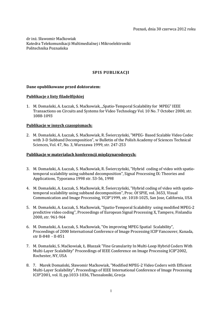 Poznań, dnia 30 czerwca 2012 roku dr inż. Sławomir Maćkowiak Katedra Telekomunikacji Multimedialnej i Mikroelektroniki Politechnika Poznańska SPIS PUBLIKAC JI Dane opublikowane przed doktoratem: Publikacje z listy filadelfijskiej 1. M. Domański, A. Łuczak, S. Maćkowiak, „Spatio-Temporal Scalability for MPEG” IEEE Transactions on Circuits and Systems for Video Technology Vol. 10 No. 7 October 2000, str. 1088-1093 Publikacje w innych czasopismach: 2. M. Domański, A. Łuczak, S. Maćkowiak, R. Świerczyński, "MPEG- Based Scalable Video Codec with 3-D Subband Decomposition", w Bulletin of the Polish Academy of Sciences Technical Sciences, Vol. 47, No. 3, Warszawa 1999, str. 247-253 Publikacje w materiałach konferencji międzynarodowych: 3. M. Domański, A. Łuczak, S. Maćkowiak, R. Świerczyński, "Hybrid coding of video with spatiotemporal scalability using subband decomposition", Signal Processing IX: Theories and Applications, Typorama 1998 str. 53-56, 1998 4. M. Domański, A. Łuczak, S. Maćkowiak, R. Świerczyński, "Hybrid coding of video with spatiotemporal scalability using subband decomposition", Proc. Of SPIE, vol. 3653, Visual Communication and Image Processing, VCIP’1999, str. 1018-1025, San Jose, California, USA 5. M. Domański, A. Łuczak, S. Maćkowiak, "Spatio-Temporal Scalability using modified MPEG-2 predictive video coding", Proceedings of European Signal Processing X, Tampere, Finlandia 2000, str. 961-964 6. M. Domański, A. Łuczak, S. Maćkowiak, "On improving MPEG Spatial Scalability", Proceedings of 2000 International Conference of Image Processing ICIP Vancouver, Kanada, str II-848 - II-851 7. M. Domański, S. Maćkowiak, Ł. Błaszak "Fine Granularity In Multi-Loop Hybrid Coders With Multi-Layer Scalability" Proceedings of IEEE Conference on Image Processing ICIP’2002, Rochester, NY, USA 8. 7. Marek Domański, Sławomir Maćkowiak, "Modified MPEG-2 Video Coders with Efficient Multi-Layer Scalability", Proceedings of IEEE International Conference of Image Processing ICIP’2001, vol. II, pp.1033-1036, Thessaloniki, Grecja 1 9. M. Domański, S. Maćkowiak, Ł. Blaszak "Scalable hybrid video coders with double motion compensation", Proceedings of IEEE International Symposium on Consumer Electronics ISCE'2002, September 23-26, 2002 Erfurt, Niemcy 10. M. Domański, A. Łuczak, S. Maćkowiak, R. Świerczyński, U. Benzler, "Spatio-Temporal Scalable Video Codecs with MPEG-Compatible Base Layer", Proceedings of Picture Coding Symposium, Portland 1999, str. 45-48 11. M. Domański, A. Łuczak, S. Maćkowiak, "Scalable MPEG Video Coding with improved Bframe prediction", Proceedings of IEEE International Symposium Circuits and Systems ISCAS 2000, Genewa, Szwajcaria 2000 str.II-273 II-276 12. M. Domański, A. Łuczak, S. Maćkowiak, "Video Coding with Spatio- Temporal Scalability for applications in heterogeneous communication networks", Proceedings of IWSSIP'2000 7th. Int. Workshop on Systems, Signals and Image Processing, Maribor Słowenia 2000, str.127130 13. M. Domański, S. Maćkowiak, Ł. Blaszak "Efficient hybrid video coders with spatial and temporal scalability", Proceedings of IEEE International Conference on Multimedia and Expo ICME'2002, August 26-29, 2002 Lausanne, Szwajcaria 14. M. Domański, S. Maćkowiak, Ł. Blaszak "Efficient Structure of Video Coders with MotionCompensated Fine-Granularity Scalability" Proceedings of XI European Signal Processing Conference EUSIPCO'2002, September 3-6, 2002 Tuluza, Francja 15. M. Domański, S. Maćkowiak, "Three-Layer MPEG-2 Based Video Codecs with SpatioTemporal Scalability", EURASIP Conference on Digital Signal Processing for Multimedia Communications and Services, 2001, Budapeszt Węgry 16. M. Domański, S. Maćkowiak, "An MPEG based Multilayer Video Coder with Spatio-Temporal Scalability and DCT Data Partitioning", International Conference on Signals and Electronic Systems ICSES 2001, str. 203-208, Łódź 17. M. Domański, A. Łuczak, S. Maćkowiak, "MPEG-2 Compatible Hierarchical Video Coders with B-frame Data Partitioning" Proceedings IWSSIP'99 6th. Int. Workshop on Systems, Signals and Image Processing 1999, str. 34-37, Bratysława, Słowacja Publikacje w materiałach konferencji krajowych: 18. M. Domański, S. Maćkowiak, "Badania kodeka MPEG-2 standardu telewizji cyfrowej", Krajowe Sympozjum Telekomunikacji Bydgoszcz 1998, str.190-198 19. A. Łuczak, S. Maćkowiak, "Uniwersalne oprogramowanie do realizacji koderów wizyjnych", Poznańskie Warsztaty Telekomunikacyjne, Poznań 1998, str. 3.5-1 3.5-4 20. M. Domański, A. Łuczak, S. Maćkowiak, R. Świerczyński, "MPEG- Based Scalable Video Codec with 3-D Subband Decomposition", Proceedings of the XXIst National Conference on Circuit Theory and Electronic Networks, Poznan, str. 487-492, 1998 (przedruk w Bulletin of the Polish Academy of Sciences Technical zob. także poz. 2) 21. A. Łuczak, S. Maćkowiak, K. Rakowski, Z. Szymański "System multimedialny dla telemedycyny", Poznańskie Warsztaty Telekomunikacyjne, Poznań 1999 str. 3.4-1 2 22. A. Łuczak, S. Maćkowiak, "Medyczny system multimedialny ze zdalnym dostępem", Systemy i technologie telekomunikacji multimedialnej STM 2000, Łódź 2000, str. 231-236 23. M. Domański, A. Łuczak, S. Maćkowiak, "Ulepszony koder skalowalny dla systemu MPEG-2", Systemy i technologie telekomunikacji multimedialnej STM 2000, Łódź 2000, str. 153-158 24. A. Łuczak, S. Maćkowiak, "Dedykowane oprogramowanie do zastosowań telepatologicznych", Telemedycyna 2000, Łódź, str. 63-68 25. M. Domański, S. Maćkowiak, Ł. Blaszak "Scalable video compression for wireless systems" URSI X National Symposium of Radio Sciences, pp. 336-340, 2002, Poznań 26. S. Maćkowiak, "Model weryfikacyjny trójwarstwowego skalowalnego kodera wizyjnego wykorzystującego struktury koderów MPEG-2", Krajowa Konferencja Radiotelekomunikacji Radiofonii i Telewizji KKRITT 2001, str. 7.3-1 7.3-4, Poznań 27. Rozdział w materiałach do ku