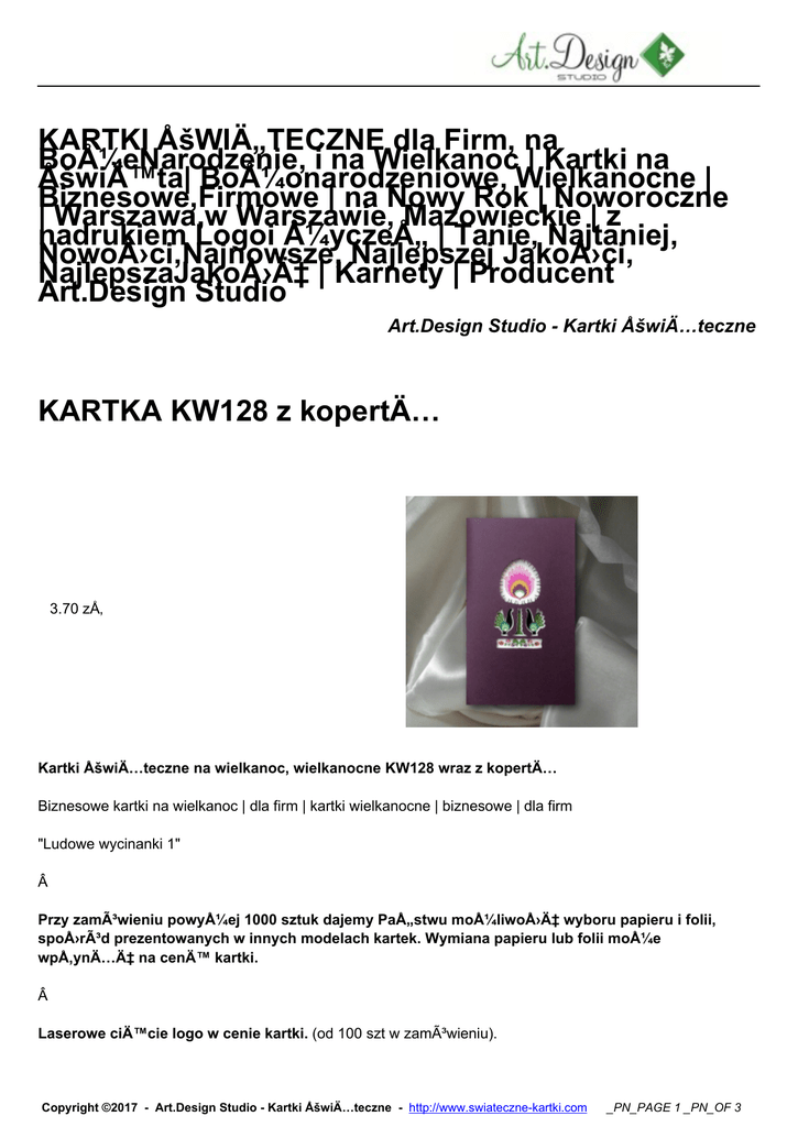 KARTKI ÅšWIÄ„TECZNE dla Firm, na BożeNarodzenie, i na Wielkanoc | Kartki na ÅšwiÄ™ta| Bożonarodzeniowe, Wielkanocne | Biznesowe,Firmowe | na Nowy Rok | Noworoczne | Warszawa,w Warszawie, Mazowieckie | z nadrukiem Logoi życzeÅ„ | Tanie, Najtaniej, NowoÅ›ci,Najnowsze, Najlepszej JakoÅ›ci, NajlepszaJakość | Karnety | Producent Art.Design Studio Art.Design Studio - Kartki ÅšwiÄ…teczne KARTKA KW128 z kopertÄ… 3.70 zÅ‚ Kartki ÅšwiÄ…teczne na wielkanoc, wielkanocne KW128 wraz z kopertÄ… Biznesowe kartki na wielkanoc | dla firm | kartki wielkanocne | biznesowe | dla firm "Ludowe wycinanki 1"  Przy zamówieniu powyżej 1000 sztuk dajemy PaÅ„stwu możliwość wyboru papieru i folii, spoÅ›ród prezentowanych w innych modelach kartek. Wymiana papieru lub folii może wpÅ‚ynąć na cenÄ™ kartki.  Laserowe ciÄ™cie logo w cenie kartki. (od 100 szt w zamówieniu). Copyright ©2017 - Art.Design Studio - Kartki ÅšwiÄ…teczne - http://www.swiateczne-kartki.com _PN_PAGE 1 _PN_OF 3  rozmiar: zamkniÄ™ta 107x185 mm, otwarta 214x185 mm, Å›rodek 177x210 mm, koperta 120x195 mm, okÅ‚adka: bardzo wysokiej jakoÅ›ci papier matowy, gÅ‚adki w kolorze fioletowym, zdobiony ciÄ™ciem laserowym. 240 gram. Folkowego charakteru dodaje nadruk na wkÅ‚adce inspirowany wycinankÄ… Å‚owickÄ…. Bardzo żywe kolory zadrukowane na poddruku piÄ™knie komponujÄ… siÄ™ i bardzo dobrze oddajÄ… charakter tych Å›wiÄ…t. WYCINANA GRAFIKA: nr. 20 Rodzaj wycinanej grafiki na okÅ‚adce i drukowanej grafiki na wkÅ‚adce do wyboru. (przy zmianie oryginalnego wyglÄ…du kartki, podaj wybrane numery Wycinanej Grafiki i Drukowanej Grafiki w mailu potwierdzajÄ…cym zamówienie). Zamiast drukowania Dowolnej Grafiki, istnieje możliwość nadruku dowolnego zdjÄ™cia, lub LOGO Firmy. Å›rodek: bardzo wysokiej jakoÅ›ci papier, gÅ‚adki, w kolorze biaÅ‚ym. 120 gram. koperta: bardzo wysokiej jakoÅ›ci papier ekologiczny, gÅ‚adki, matowy, w kolorze biaÅ‚ym. 120 gram. sposób łączenia Å›rodka z okÅ‚adkÄ…: z tyÅ‚u okÅ‚adki wykonane sÄ… dwa półokrÄ…gÅ‚e naciÄ™cia, w które wkÅ‚ada siÄ™ Å›rodek.   Umieszczenie logo na okÅ‚adce jako dodatkowa opcja. Możliwe techniki umieszczenia np. LOGO na okÅ‚adce: • Wycinane Laserem (min. 100 szt.) W CENIE KARTKI (GRATIS) • ZÅ‚ocone, Srebrzone, Folia Hot-Print (min. 100 szt.) • TÅ‚oczone (min. 100 szt.)  Zobacz nasze Rabaty IloÅ›ciowe. od 200 do 500 sztuk - 6% od 501 do 1000 sztuk - 8% od 1001 do 2500 sztuk - 10% od 2501 do 5000 sztuk - 12% od 5001 do 10000 sztuk - 14% Copyright ©2017 - Art.Design Studio - Kartki ÅšwiÄ…teczne - http://www.swiateczne-kartki.com _PN_PAGE 2 _PN_OF 3 od 10001 sztuk - do uzgodnienia Wybierz: Treść Å»yczeÅ„, Krój Czcionki, Kolor Nadruku.  W Å›rodku kartki drukujemy DOWOLNE Å»YCZENIA i np. LOGO w kolorze nadesÅ‚ane przez PaÅ„stwa lub wybrane z naszych propozycji w dziale: Treść Å»yczeÅ„  Koperta Ozdobna w Cenie Kartki Wszystkie nasze ceny sÄ… cenami BRUTTO (zawierajÄ… 23% podatku VAT) Gwarantujemy NajwyższÄ… Jakość naszych Kartek ÅšwiÄ…tecznych. Zamów 3 próbki GRATIS.  Odważna, fioletowa kartka. DoskonaÅ‚a do wielkanocnych życzeÅ„. PiÄ™kna, Å‚owicka wycinanka byÅ‚a inspiracjÄ… dla tego projektu. Å»ywy fiolet okÅ‚adki to kolor prosto z łąki. Na przykÅ‚ad – kolor kÄ…koli. Natura nigdy nie boi siÄ™ kolorów. Nasze kartki także. Projekt doskonale przytacza tradycjÄ™ polskich ÅšwiÄ…t Wielkiej Nocy. Zwróćmy na niÄ… uwagÄ™. Na tradycjÄ™ wielkanocnÄ… czy na projekt tej kartki? Na jedno i na drugie. Kartki Å›wiÄ…teczne Art.Design Studio. Producent, wydawca nowoczesnych kartek wielkanocnych, na Boże Narodzenie poleca doskonaÅ‚e wzory wykonane z najlepszych papierów, piÄ™knie wykoÅ„czone. Nowoczesny design, Å›wietne kolorowe papiery, profesjonalny nadruk, połączenie tradycyjnych metod uszlachetniania papieru z laserowymi możliwoÅ›ciami ciÄ™cia papieru sprawia, że nasze kartki sÄ… wyjÄ…tkowe, niebanalne i bardzo chÄ™tnie kupowane. Informacja o sprzedawcy Copyright ©2017 - Art.Design Studio - Kartki ÅšwiÄ…teczne - http://www.swiateczne-kartki.com _PN_PAGE 3 _PN_OF 3
