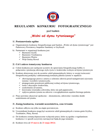 REGULAMIN KONKURSU FOTOGRAFICZNEGO pod hasłem „Wolni od dymu tytoniowego” 1/. Postanowienia ogólne a) Organizatorem konkursu fotograficznego pod hasłem „Wolni od dymu tytoniowego” jest Państwowy Powiatowy Inspektor Sanitarny w Gryficach b) Partnerami w organizacji konkursu jest: Burmistrz Gryfic Burmistrz Trzebiatowa Burmistrz Płotów Wójt Gminy Rewal 2/. Cel i zakres tematyczny konkursu a) Celem konkursu jest zachęceni uczniów do uprawiania fotograficznego hobby w połączeniu z promocją zdrowego stylu Ŝycia w środowisku wolnym od dymu tytoniowym b) Konkurs skierowany jest do uczniów szkół gimnazjalnych, którzy w swojej twórczości fotograficznej podejmą i udokumentują tematykę palenia tytoniu w aspekcie: obowiązującego prawa ( ustawa o ochronie zdrowia przed następstwami uŜywania tytoniu i wyrobów tytoniowych), propagowanie przestrzeni publicznej wolnej od dymu tytoniowego, norm i obyczajów środowiska, uzaleŜnienia od tytoniu, kreowania wizerunku człowieka, który nie pali papierosów, wpływu palenia tytoniu na zdrowie z uwzględnieniem aspektu biernego palenia. c) Prace powinny ukazywać społeczno – ekonomiczne, zdrowotne i moralne skutki uzaleŜnienia od tytoniu. 3/. Zasięg konkursu, warunki uczestnictwa, czas trwania a) Konkurs odbywa się tylko na etapie powiatowym. b) Uczestnikami konkursu mogą być uczniowie szkół gimnazjalnych z terenu gmin Gryfice, Trzebiatów, Płoty, Rewal. c) Do konkursu zostaną dopuszczone wyłącznie prace, które są zgodne z regulaminem konkursu i w sposób oczywisty nawiązywać będą do jego tematyki. d) Konkurs trwa od 15 marca do 21 maja 2012r. 1 e) Prace konkursowe naleŜy przesłać / dostarczyć w terminie do dnia 21 maja 2012r. do godziny 15.00 na adres: Powiatowa Stacja Sanitarno – Epidemiologicznej ul. Nowy Świat 6, 72-300 Gryfice z dopiskiem „Konkurs Fotograficzny” f) Warunkiem uczestnictwa w konkursie jest pisemne wyraŜenie zgody przedstawiciela ustawowego dziecka na udział w konkursie ( dokument w załączeniu). WyraŜenie zgody musie być dołączone do pracy konkursowej, w przeciwnym razie praca nie będzie dopuszczona do konkursu. 4/. Zasady przeprowadzania konkursu a) Prace zgłaszane do udziału w konkursie powinny składać się z: maksymalnie 3 zdjęcia czarno – białe lub kolorowe w formacie 10 x 15 (odbitki) na białym papierze matowym lub błyszczącym zdjęcia muszą być równieŜ dostarczone w wersji elektroniczne na płycie CD lub DVD o rozdzielczości zdjęcia minimum 1600 x 1200 pikseli kaŜde zdjęcie i płyta muszą być podpisane: imię i nazwisko uczestnika konkursu, szkoła, klasa. zdjęcia bez podpisu nie będą oceniane b) Zdjęcia mogą być poddane obróbce komputerowej. c) KaŜdy uczestnik musi posiadać pełne prawa autorskie do wykonanych zdjęć. d) Zdjęcia przesłane na konkurs przechodzą na własność organizatora. Organizator zastrzega sobie prawo do ich publikacji. e) Zdjęcia nie mogą zawierać treści obraŜających i naruszających dobre imię innych osób. 5/. Rozstrzygnięcie konkursu a) Oceny nadesłanych prac dokona komisja konkursowa powołana przez organizatora. b) Prace oceniane będą wg następujących kryteriów: zgodność z tematem konkursu wartość profilaktyczno-edukacyjna jasność przekazu wartość artystyczna oryginalność pracy c) Komisja konkursowa wyłoni laureatów I, II, III miejsca oraz przyzna wyróŜnienia. Komisja konkursowa zastrzega sobie prawo innego podziału nagród oraz przyznawania miejsc exaequo. d) Nagrody rzeczowe dla laureatów konkursu zostaną zakupione ze środków finansowych samorządów gmin Gryfice, Trzebiatów, Płoty, Rewal. 2 e) Nagrody rzeczowe stanowił będzie sprzęt elektroniczny. f) Wyniki konkursu zostaną ogłoszone w dniu 31 maja 2012r. – na stronie internetowej http://pssegryfice.pis.gov.pl g) Uroczyste wręczenie nagród nastąpi w dniu 15 czerwca 2012r. o godz. 10.00 w Gryfickim Domu Kultury podczas Konferencji Edukacyjnej „Współczesne zagroŜenie dla zdrowia – Nikotynizm” Nadesłanie prac na konkurs jest równoznaczne z przyjęciem warunków opisanych w niniejszym regulaminie. Szczegółowe informacje na temat organizacji konkursu moŜna uzyskać u pracownika Oświaty Zdrowotnej i Promocji Zdrowia PSSE Gryfice, pod numerem telefonu 91 38 78 319, 91 38 78 320. Zał. 1/. Druk „Zgoda przedstawiciela ustawowego dziecka, które nie ukończyło 18 roku Ŝycia na udział w konkursie” 3