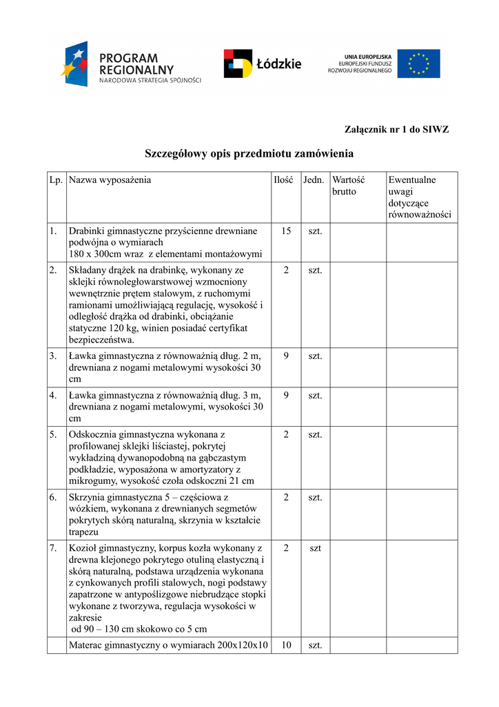 Załącznik nr 1 do SIWZ Szczegółowy opis przedmiotu zamówienia Lp. Nazwa wyposażenia Ilość Jedn. Wartość brutto 1. Drabinki gimnastyczne przyścienne drewniane podwójna o wymiarach 180 x 300cm wraz z elementami montażowymi 15 szt. 2. Składany drążek na drabinkę, wykonany ze sklejki równoległowarstwowej wzmocniony wewnętrznie prętem stalowym, z ruchomymi ramionami umożliwiającą regulację, wysokość i odległość drążka od drabinki, obciążanie statyczne 120 kg, winien posiadać certyfikat bezpieczeństwa. 2 szt. 3. Ławka gimnastyczna z równoważnią dług. 2 m, drewniana z nogami metalowymi wysokości 30 cm 9 szt. 4. Ławka gimnastyczna z równoważnią dług. 3 m, drewniana z nogami metalowymi, wysokości 30 cm 9 szt. 5. Odskocznia gimnastyczna wykonana z profilowanej sklejki liściastej, pokrytej wykładziną dywanopodobną na gąbczastym podkładzie, wyposażona w amortyzatory z mikrogumy, wysokość czoła odskoczni 21 cm 2 szt. 6. Skrzynia gimnastyczna 5 – częściowa z wózkiem, wykonana z drewnianych segmetów pokrytych skórą naturalną, skrzynia w kształcie trapezu 2 szt. 7. Kozioł gimnastyczny, korpus kozła wykonany z drewna klejonego pokrytego otuliną elastyczną i skórą naturalną, podstawa urządzenia wykonana z cynkowanych profili stalowych, nogi podstawy zapatrzone w antypoślizgowe niebrudzące stopki wykonane z tworzywa, regulacja wysokości w zakresie od 90 – 130 cm skokowo co 5 cm 2 szt Materac gimnastyczny o wymiarach 200x120x10 10 szt. Ewentualne uwagi dotyczące równoważności 8. cm wypełniony pianką poliuretanową, pokrowce wykonane z tworzywa PCV wytrzymałego na uszkodzenia typu rozerwanie i ścieranie, wyposażony w uchwyty do przenoszenia, boki wzmocnione posiadający certyfikat CE 9. Materac gimnastyczny o wymiarach 200x120x20 cm wypełniony pianką poliuretanową, pokrowce wykonane z tworzywa PCV wytrzymałego na uszkodzenia typu rozerwanie i ścieranie, wyposażony w uchwyty do przenoszenia, boki wzmocnione, posiadający certyfikat CE 10 szt. 10. Słupki do siatkówki aluminiowe z naciągiem śrubowym, montowane w tulejach podłogowych wykonanych z profilu owalnego o wymiarach 100x120mm, bezstopniowa regulacja zawieszenia siatki w zakresie 1,07– 2,43 m komplet: - dwa słupki ( jeden z napinaczem śrubowym siatki, drugi z elementami zaczepowymi siatki) - dwie tuleje stalowe o wymiarach 13,3 x 46 cm i grubości ścianki 3 mm z ramą i deklem drewnianym 3 kpl. 11. Siatka do siatkówki spełniająca najnowsze przepisy FIVB, bez węzłów z polipropylenu o wysokości, średnicy 4 mm, z linką kawlarową (dł.11,70), krawędzie wzmocnione włóknem szklanym linka naprężająca w 6 punktach, taśma wzmacniająca biała górna z poliestru o szer.70 mm, dolna z polipropylenu o szer. 50 mm kolor czarny, z antenkami o standardzie nie gorszym niż , np. firmy HUCK 3 szt. 12. Stół do tenisa stołowego ; - grubość blatu 18 mm - grubość ramy 40 x 20 mm - regulowane nogi 40 x 40 mm - siatka mocowana na szybki clips - kolor niebieski - wymiary ( d 274 cm x sz 152,5 cm x w 76 cm) 3 szt. 13. Rakieta do tenisa stołowego - okładzina nie gorsza niż, np. Drive gr. 20 mm - parametry rotacja 14, szybkość 12, kontrola 7 - spełniająca normy ITTF 20 szt. 14. Piłka lekarska 2kg wykonana ze skóry naturalnej 10 szt. 15. Piłka lekarska 3 kg wykonana ze skóry naturalnej 10 szt. 16. Piłka do piłki siatkowej, np. Molten Light Training, wykonana z miekiej skóry syntetycznej, bardzo lekka 200 – 220 g, kolor biało – zielono – czerwony rozmiar 5 20 szt. 17. Piłka do koszykówki, przeznaczona do gry na różnych powierzchniach, wykonana z celluar bardzo wytrzymały gumowy materiał, osnowa nylonowa i dętka lateksowa, kolor brązowy , rozmiar 7 20 szt. 20 szt. 19. Piłka do piłki ręcznej, wykonana z materiału kompozytowego, zewnętrzna warstwa meszek, rozmiar 2 (54 cm ) - damski, koloru szaro – żółty nie gorszej jakości ni, np. firmy Selox 15 szt. 20. Piłka do piłki ręcznej,wykonana z materiału kompozytowego, zewnętrzna warstwa meszek, rozmiar 3 (56 cm) – męski, nie gorszej jakości niż, np. firmy Selox 15 szt. 21. Bramki do piłki ręcznej aluminiowe o wymiarach 3 x 2 m, słupki łączone z poprzeczką za pomocą specjalnej złączki aluminiowej z profilu aluminiowego 80 x 80.Mocowanie siatki do łuków i poprzeczki dolnej za pomocą haczyków PP mocowanych do specjalnych otworów. Wszystkie elementy poza ramą główną są cynkowane. Rama głowna malowana na kolor niebiesko-biały .Składana konstrukcja łuków mocowanie do podłoża hali przez przykręcenie w dolnej części łuku śrubami mocującymi do uchwytów zamocowanych na stałe w posadzce. Bezwęzłowa siatka na bramkę do piłki ręcznej wykonanej PP, grubość sznurka 3 mm, o wysokiej wytrzymałości, wymiary: szerokość: 3 m, wysokość: 2m, krawęć oczka: 10 cm, głębokość: górna - 80 cm, dolna - 100 cm. Kolory : zielony. 1 kpl. 22. Zestaw do Unihokeja: 12 kijków wykonanych z PCV o długości 95 cm w kolorze czarnym łopatka ażurowa ( 6 kij czerwonych, 6 kij żółtych ) 1 kpl. 18. Piłka do piłki nożnej wykonana z materiału syntetycznego, szyta, lakierowana, z niskim kozłem rozmiar nr 4, kolor niebiesko - biała z dodatkami czerwieni 2 bramki metalowe z siatkami o wymiarach 60 x 90 cm 10 piłek miękkich 23. Kompresor 230 V: - wężyk sprężony z uchwytem 8 mm - ciśnieniomierz analogowy do 5 bar - zasilanie 230V - uchwyt 8 mm do różnych końcówek - komplet w zestawie / 3 igły do piłek 1 szt. 24. Siatka ochronna podzielna na okna o oczka 40 x 40 mm grubość splotu 2, 3 mm, kolor zielony + elementy montażowe 341 m² 25. Siatka ochronna na ścianę (piłkochwyt) o oczkach 45 x 45 mm grubość splotu 3 mm, kolor zielony. Mocowane na lince stalowej mocowanej do ściany szczytowej na wysięgnikach o wymiarze 1m. Siatka na piłkochwyt o wymiarze 7,15x28,00 z wszytym obciążeniem dolnym 400g/mb /szt 2/ 400 m² 26. Pachołek 