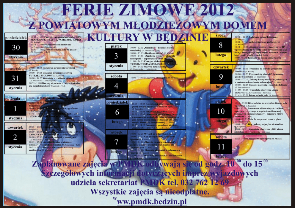FERIE ZIMOWE 2012 poniedzia³ek Z POWIATOWYM M£ODZIE¯OWYM DOMEM KULTURY W BÊDZINIE œroda 11:00 - 13:25 Czas gier niekomputerowych - GRY PLANSZOWE, SZACHY, WARCABY, LOTKI (G. Kubasik) 30 10:15 – 15:00 Pejza¿e mrozem malowane (A. Pruszowska – Miko³ajczak) stycznia wtorek 31 stycznia œroda 1 stycznia pi¹tek 10:00 – 13:05 „Sami tworzymy zimowe puzzle” (M. Wnentrzak – Toll) 10:00 – 11:35 Siatkówka (pracownia Siewierz) 3 stycznia sobota 2 stycznia 10:00 – 14:05 Malarstwo sztalugowe (M. Machoñ) (A. Pruszowska – Miko³ajczak) 10:55 –15:00 Bawimy siê w teatr – zajêcia teatralne dla najm³odszych (M. Wnentrzak – Toll) 10:00 – 11:35 Koszykówka (pracownia Siewierz) (Z. Kozak) 10:00 – 11:50 Angielski na weso³o (M. Saba³a – Podgórska) 10:00 – 14:05 Czarno – bia³e warsztaty graficzne (A. Pruszowska – Miko³ajczak 11:45 - 15:00 Czas gier niekomputerowych – GRY I ZABAWY SPORTOWE (CZELAD) (G. Kubasik) 4 poniedzia³ek 6 10:15 – 13:30 Wyjazd na lodowisko (M. Saba³a – Podgórska) 10:00 – 13:15 Czas gier niekomputerowych - GRY I ZABAWY SPORTOWE (CZELAD) (G. Kubasik) 10:00 – 13:15 Æwiczenia studyjne w monotypia (A. Pruszowska - Miko³ajczak) 10:45 – 15:00 „Zabytki Bêdzina w zimowej ods³onie” – fotografia i reporta¿ (M. Wnentrzak – Toll) 10:55 – 15:00 Fantazje w drewnie- warsztaty rzeŸbiarskie (K. Wi¹cek) 8 lutego wtorek 7 lutego 10:00 – 11:35 unihokej (pracownia Siewierz) (Z. Kozak) 10:50 – 15:00 „Zimowe inspiracje taneczne cz. II” – wprowadzenie do techniki tañca nowoczesnego jako formy interpretacji wybranych utworów muzyki klasycznej i wspó³czesnej (L. Bieñ) 10:00 – 14:05 Konkurs na maskê karnawa³ow¹ (E. Lewandowska) czwartek 9 lutego 10:00 – 11:35 æwiczenia na si³owni (pracownia Siewierz) (Z. Kozak) 10:00 – 11:35 Czy znacie tê piosenki? Œpiewamy gramy i tañczymy (J. Szumski) 10:00 – 11:35 „Zabawy kreatywne dla najm³odszych z zastosowaniem chusty animacyjnej” (L. Bieñ) 10:00 – 12:25 Gipsowe naczynia – wyrób i zdobienie (E. Lewandowska) 11:00 – 14:15 Warsztaty plastyczne „Zima akwarel¹” (U. Lewandowska – Zalewska) 11:45 – 15:00 Pokaz technik judo (B. Korban) stycznia lutego czwartek 10:00 – 13:15 „Omnibus” – konkurs wiedzy wszelakiej (M. Wnentrzak – Toll) 10:00 – 13:15 „RzeŸba w œniegu” (K. Wi¹cek) 10:50 – 14:55 - Zamkowe legendy – elementy scenografii – papieroplastyka (M. Mañka) 11:00 – 14:15 Czas gier niekomputerowych – TURNIEJ TENISA STO£OWEGO (G. Kubasik) 11:00 – 14:15 Martwa natura collage (A. Pruszowska – Miko³ajczak) (Z. Kozak) 10:00 – 14:05 Czas gier niekomputerowych FUTBALL STO£OWY (G. Kubasik) 10:00 – 14:55 Warsztaty wyrabiania bi¿uterii 10:00 – 14:05 Budujemy pojazd kosmiczny (G. Majzel) 10:00 – 14:05 Kalejdoskop muzyczny. S³uchamy i gramy utwory muzyczne z ró¿nych epok (J. Szumski) 10:00 – 11:35 Pokaz technik judo (B. Korban) 10:50 – 15:00 ,,Zimowe inspiracje taneczne cz. I” – wprowadzenie do techniki tañca nowoczesnego jako formy interpretacji wybranych utworów muzyki klasycznej i wspó³czesnej (L. Bieñ) 11:00 – 14:15 Decoupage- przedmiot u¿ytkowy „ornament roœlinny” (E. Lewandowska) 10:00 – 12:25 Wyjazd na lodowisko (B. Korban) 10:00 – 13:15 Gdy s³yszê muzykê, czujê rytm i œpiewam(K. Ko¿uch) 10:00 – 14:05 „Baw siê z nami z tancerzami”zabawy taneczno-ruchowe przy muzyce dla najm³odszych (L. Bieñ) 10:45 – 14:00 Elementy akrobatki w po³¹czeniu z muzyk¹ (G. Majzel) 12:30 – 14:55 Warsztaty ceramiczne - p³askorzeŸba ceramiczna (E. Lewandowska) pi¹tek 10 lutego 10:55 – 15:00 Gitara dobra na wszystko. Gramy solo i grupowo (J. Szumski) 9:00 – 15:00 „Stosowanie ró¿norodnych œrodków wyrazu artystycznego w aspekcie realizowanej kompozycji choreograficznej” – zajêcia w Filii w Siewierzu (L. Bieñ) 10:00 – 12:25 Ma³e formy przestrzenne – glina (E. Lewandowska) 10:00 – 12:25 Gry i zabawy w jêzyku niemieckim (B. Szajerska) 10:00 – 14:05 Warsztaty plastyczne „Witra¿owa miniatura (U. Lewandowska – Zalewska) sobota 10:00 – 14:05 Malarstwo sztalugowe (M. Machoñ) 11 lutego 00 Zaplanowane zajêcia w PMDK odbywaj¹ siê od godz. 10 do 15 Szczegó³owych informacji dotycz¹cych imprez wyjazdowych udziela sekretariat PMDK tel. 032 762 12 69 Wszystkie zajêcia s¹ nieodp³atne. W ww.pmdk.bedzin.pl 00