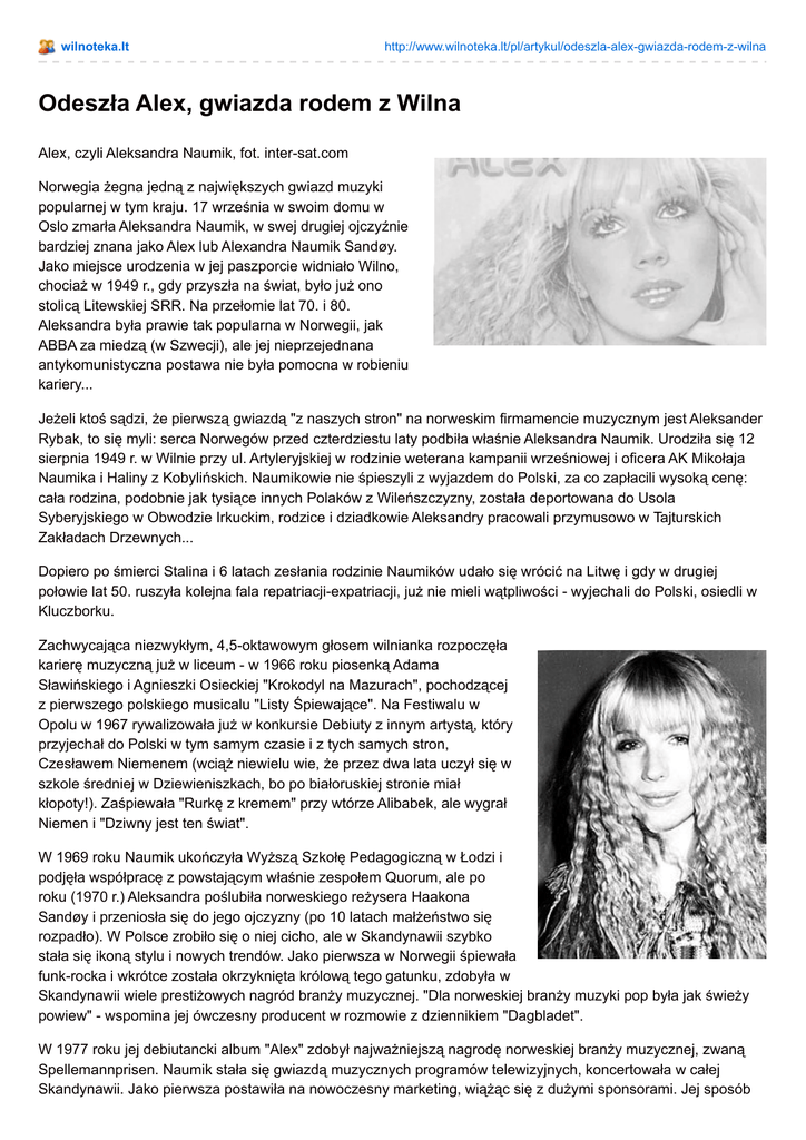 wilnoteka.lt http://www.wilnoteka.lt/pl/artykul/odeszla-alex-gwiazda-rodem-z-wilna Odeszła Alex, gwiazda rodem z Wilna Alex, czyli Aleksandra Naumik, fot. inter-sat.com Norwegia żegna jedną z największych gwiazd muzyki popularnej w tym kraju. 17 września w swoim domu w Oslo zmarła Aleksandra Naumik, w swej drugiej ojczyźnie bardziej znana jako Alex lub Alexandra Naumik Sandøy. Jako miejsce urodzenia w jej paszporcie widniało Wilno, chociaż w 1949 r., gdy przyszła na świat, było już ono stolicą Litewskiej SRR. Na przełomie lat 70. i 80. Aleksandra była prawie tak popularna w Norwegii, jak ABBA za miedzą (w Szwecji), ale jej nieprzejednana antykomunistyczna postawa nie była pomocna w robieniu kariery... Jeżeli ktoś sądzi, że pierwszą gwiazdą "z naszych stron" na norweskim firmamencie muzycznym jest Aleksander Rybak, to się myli: serca Norwegów przed czterdziestu laty podbiła właśnie Aleksandra Naumik. Urodziła się 12 sierpnia 1949 r. w Wilnie przy ul. Artyleryjskiej w rodzinie weterana kampanii wrześniowej i oficera AK Mikołaja Naumika i Haliny z Kobylińskich. Naumikowie nie śpieszyli z wyjazdem do Polski, za co zapłacili wysoką cenę: cała rodzina, podobnie jak tysiące innych Polaków z Wileńszczyzny, została deportowana do Usola Syberyjskiego w Obwodzie Irkuckim, rodzice i dziadkowie Aleksandry pracowali przymusowo w Tajturskich Zakładach Drzewnych... Dopiero po śmierci Stalina i 6 latach zesłania rodzinie Naumików udało się wrócić na Litwę i gdy w drugiej połowie lat 50. ruszyła kolejna fala repatriacji-expatriacji, już nie mieli wątpliwości - wyjechali do Polski, osiedli w Kluczborku. Zachwycająca niezwykłym, 4,5-oktawowym głosem wilnianka rozpoczęła karierę muzyczną już w liceum - w 1966 roku piosenką Adama Sławińskiego i Agnieszki Osieckiej "Krokodyl na Mazurach", pochodzącej z pierwszego polskiego musicalu "Listy Śpiewające". Na Festiwalu w Opolu w 1967 rywalizowała już w konkursie Debiuty z innym artystą, który przyjechał do Polski w tym samym czasie i z tych samych stron, Czesławem Niemenem (wciąż niewielu wie, że przez dwa lata uczył się w szkole średniej w Dziewieniszkach, bo po białoruskiej stronie miał kłopoty!). Zaśpiewała "Rurkę z kremem" przy wtórze Alibabek, ale wygrał Niemen i "Dziwny jest ten świat". W 1969 roku Naumik ukończyła Wyższą Szkołę Pedagogiczną w Łodzi i podjęła współpracę z powstającym właśnie zespołem Quorum, ale po roku (1970 r.) Aleksandra poślubiła norweskiego reżysera Haakona Sandøy i przeniosła się do jego ojczyzny (po 10 latach małżeństwo się rozpadło). W Polsce zrobiło się o niej cicho, ale w Skandynawii szybko stała się ikoną stylu i nowych trendów. Jako pierwsza w Norwegii śpiewała funk-rocka i wkrótce została okrzyknięta królową tego gatunku, zdobyła w Skandynawii wiele prestiżowych nagród branży muzycznej. "Dla norweskiej branży muzyki pop była jak świeży powiew" - wspomina jej ówczesny producent w rozmowie z dziennikiem "Dagbladet". W 1977 roku jej debiutancki album "Alex" zdobył najważniejszą nagrodę norweskiej branży muzycznej, zwaną Spellemannprisen. Naumik stała się gwiazdą muzycznych programów telewizyjnych, koncertowała w całej Skandynawii. Jako pierwsza postawiła na nowoczesny marketing, wiążąc się z dużymi sponsorami. Jej sposób uczesania do tej pory nazywany jest w Norwegii "fryzurą na Alex". Była też znana ze zdecydowanie antykomunistycznej postawy i zaangażowania w pomoc polskiej opozycji, co zdaniem znawców ówczesnego świata rozrywki i polityki przeszkodziło w zrobieniu większej kariery, także międzynarodowej. Poglądy polityczne polskiej artystki były w lewicującej Norwegii niepopularne, ze względu na swój antykomunizm była krytykowana i marginalizowana przez norweskie media. Mimo złotych płyt i międzynarodowego uznania, już w 1977 roku, podczas inauguracji koncertu rockowego ze szwedzkim gwiazdorem Cornelisem Vreeswijkiem, została wygwizdana przez młodzieżówkę socjalistyczną. Ku oburzeniu rzeszy wielbicieli pominięto ją m.in. w serialu państwowej telewizji NRK na temat historii rocka w Norwegii... W dniu wprowadzenia stanu wojennego w Polsce, kiedy to w stolicy Norwegii ludzie zebrali się na wiecu poparcia dla opozycji, artystka dała w Oslo niezwykły, spontaniczny koncert. W 1983 roku hitem stał się singiel piosenkarki "I love Warszawa". Dwa lata później "Alex" rozpoczęła współpracę z zespołem "Sex Pistols"i przeniosła się do USA. Przez lata Alex pracowała jako autorka piosenek i producent w Stanach Zjednoczonych, podróżowała między USA, Japonią i Norwegią. Skomponowana i wyprodukowana przez Alex płyta Faith Leany (Leana Greene) osiągnęła pierwsze miejsce na liście Billboardu w czerwcu 2005 roku i w styczniu 2007 roku. Dopiero w roku 2008 zaczęła wydawać składanki swoich nagrań, gdyż niektórych utworów skandynawskie archiwa nie chciały udostępnić nawet po 30. latach. Ostatnio Aleksandra Naumik przygotowywała z grupą historyków film dokumentalny na temat sybiraków oraz lewicującej dominacji w świecie europejskiego przemysłu rozrywkowego. Od wielu lat związana z muzykiem i kompozytorem Atle Bakkenem. Pozostawiła córkę Naomi. Przyczyny śmierci 64-letniej gwiazdy nie podano do wiadomości publicznej. Na podstawie: wp.pl, wikipedia.org