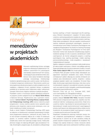 prezentacja profesjonalny rozwój prezentacja Profesjonalny rozwój menedżerów w projektach akademickich business coachingu w firmach i korporacjach oraz life coachingu, pracy z Klientami indywidualnymi i zespołami. W trakcie studiów uczestnicy wykorzystują praktyczne narzędzia do wdrażania kultury coachingowej w organizacjach i prowadzenia procesów coachingu. Dzięki kadrze prowadzących, która jest zespołem certyfikowanych coachów, dyrektorów personalnych, psychologów i trenerów rekomendowanych przez Polskie Towarzystwo Psychologiczne oraz współpracę Wiceprezydenta The Society for Coaching Psychology przy Brytyjskim Towarzystwie Psychologicznym (dr Anna SyrekKosowska) możliwe było zbudowanie kompleksowego programu kształcenia opartego nie tylko na poznaniu standardowych modeli coachingowych, ale również wzbogacenie programu o coaching psychologiczny (ang. coaching psychology), modele coachingu poznawczo-behawioralnego i studia przypadków z największych międzynarodowych korporacji. Zgodnie z najlepszymi światowymi praktykami każdy student prowa- A Wyzwania współczesnego biznesu wymagają dzi własny projekt coachingowy z klientem oraz podlega superwizji. programów edukacyjnych dedykowanych me- Superwizja dostępna jest również po zakończeniu studiów w ramach nedżerom i pracownikom firm, poszukujących Klubu Coacha csipb.pl & WSB, który skupia społeczność coachów coraz bardziej wszechstronnych form rozwoju, na Południu Polski, jest polem wymiany wiedzy i doświadczeń, pro- wykraczających poza standardowe oferty szko- pagowaniem najwyższych standardów pracy coacha. W ramach leniowe. Coraz więcej menedżerów dostrzega comiesięcznych spotkań odbywają się warsztaty tematyczne pro- przewagę interaktywnego wadzone przez doświadczonych coachów, ekspertów z zakresu kształcenia zaprojektowanego przez uczelnie wyższe, nad kilkudniowy- zarządzania kapitałem ludzkim oraz menedżerów. W ramach Klubu mi doraźnymi programami szkoleniowymi. Renomowane uczelnie wyż- działa również grupa superwizyjno-interwizyjna, która służy wymia- sze przygotowują rozbudowane programy studiów podyplomowych we nie doświadczeń związanych z prowadzeniem procesów coachingo- nowoczesnego, współpracy z najlepszymi firmami, praktykami biznesu, to połączenie wych oraz superwizji studium przypadku uczestnika-praktykującego przekłada się na najwyższy poziom zdobywanej wiedzy i praktycznych coacha przez grupę certyfikowanych coachów. rozwiązań, które od razu mogą być wdrożone w praktykę zawodową. Patronami Klubu byli już m.in. Extended DISC, GWP, Przykładem uczelni w innowacyjny sposób wdrażającej profesjonal- www.coachingvalley.com, Manager&woman&man. ne programy studiów podyplomowych jest Wyższa Szkoła Biznesu W bieżącym roku akademickim (III edycja APC) do partnerów w Dąbrowie Górniczej. Współtworzona wraz z partnerem meryto- projektu dołączył Extended DISC Polska. Narzędzie Extended rycznym Centrum Szkoleń i Psychologii Biznesu (csipb.pl) Akade- DISC pozwala na diagnozowanie organizacji, zespołów oraz indy- mia Profesjonalnego Coachingu (APC) stanowi znakomity projekt widualnych talentów i predyspozycji pracowników. Dzięki temu przygotowania i rozwoju coachów poprzez roczny specjalnie zapro- uczestnicy studiów mają dostęp do najnowocześniejszych mię- jektowany przez ekspertów csipb.pl proces edukacyjny, wraz z pa- dzynarodowych narzędzi psychometrycznych wspomagających kietem dodatkowych działań rozwojowych. procesy coachingowe oraz zdobywają potrzebną wiedzę oraz do- Studia w ramach Akademii Profesjonalnego Coachingu (APC) oparte świadczenie do prowadzenia działań coachingowych w oparciu są wyłącznie na interaktywnych warsztatach gwarantujących komplek- o narzędzia psychometryczne Extended DISC. sowe przygotowanie teoretyczne i praktyczne do pracy Coacha. Pra- Współcześni menedżerowie poszukują możliwości rozwoju rów- ca nad rozwojem kompetencji odbywa się w małych 15 osobowych nież umiejętności psychospołecznych niezbędnych w biznesie, grupach, co umożliwia każdemu studentowi praktyczne poznanie które pozwolą im wyróżnić się nie tylko zawodową wiedzą ale narzędzi pracy coacha oraz superwizję swojego rozwoju. Studia pody- przede wszystkim empatycznym podejściem do zarządzania. Psy- plomowe trwające rok obejmują 200 godzin zajęć prowadzonych me- chologia coraz częściej wkrada się w biznes i skutecznie ułatwia todą ActiveInsights przygotowującą do prowadzenia profesjonalnego pracę menedżera, gdyż rozwój i podnoszenie kwalifikacji z zakresu 94 www.oprogramowanie.nf.pl prezentacja profesjonalny rozwój miękkich kompetencji pozwala osobom na w rozwoju pracowników czy psychologii re- Akademia Trenerów Grupowych to kolej- stanowiskach kierowniczych podejmować krutacji personelu i sztuki negocjacji. ny kierunek studiów podyplomowych który trafne decyzje m.in. w kwestiach zarządza- Ludzie to niewątpliwie najważniejszy zasób pomaga rozwijać kompetencje zawodowe nia personelem. Odpowiedzią na ogromne każdej organizacji. Podstawowym warun- i podnosić kwalifikacje kadry zarządzającej. zapotrzebowanie umiejętności kiem efektywnego wykorzystania ich zdolno- Inwestowanie w potencjał ludzki w dużym psychospołecznych przez kadrę menedżer- ści jest skuteczne zarządzanie potencjałem stopniu wpływa na sukces przedsiębiorstwa. ską jest kierunek studiów podyplomowych pracowników. Decyzje personalne związane Szkolenia, warsztaty i treningi są ważnym Psychologia w biznesie oferowany przez z systemem wynagrodzeń, motywacyjnymi, narzędziem doskonalenia kompetencji za- Wyższą Szkołę Biznesu. Celem studiów jest planowaniem ścieżek kariery oraz wiele in- wodowych i interpersonalnych. Wszystkie przekazanie słuchaczom wiedzy psycholo- nych należą do kluczowych, a jednocześnie osoby, których częścią pracy jest organizacja giczne
