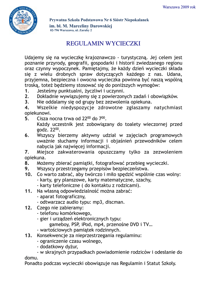 Warszawa 2009 rok Prywatna Szkoła Podstawowa Nr 6 Sióstr Niepokalanek im. bł. M. Marceliny Darowskiej 02-796 Warszawa, ul. Zaruby 2 REGULAMIN WYCIECZKI Udajemy się na wycieczkę krajoznawczo - turystyczną. Jej celem jest poznanie przyrody, geografii, gospodarki i historii zwiedzanego regionu oraz czynny wypoczynek. Pamiętajmy, że każdy dzień wycieczki składa się z wielu drobnych spraw dotyczących każdego z nas. Udana, przyjemna, bezpieczna i owocna wycieczka powinna być naszą wspólną troską, toteż będziemy stosować się do poniższych wymogów: 1. Jesteśmy punktualni, życzliwi i uczynni. 2. Dokładnie wywiązujemy się z powierzonych zadań i obowiązków. 3. Nie oddalamy się od grupy bez zezwolenia opiekuna. 4. Wszelkie niedyspozycje zdrowotne zgłaszamy natychmiast opiekunowi. 5. Cisza nocna trwa od 2200 do 700. Każdy uczestnik jest zobowiązany do toalety wieczornej przed godz. 2200. 6. Wszyscy bierzemy aktywny udział w zajęciach programowych uważnie słuchamy informacji i objaśnień przewodników celem nabycia jak najwięcej informacji. 7. Miejsce zakwaterowania opuszczamy tylko za zezwoleniem opiekuna. 8. Możemy zbierać pamiątki, fotografować przebieg wycieczki. 9. Wszyscy przestrzegamy przepisów bezpieczeństwa. 10. Co warto zabrać, aby twórczo i miło spędzić wspólnie czas wolny: - karty, gry planszowe, karty matematyczne, szachy, - karty telefoniczne ( do kontaktu z rodzicami). 11. Na własną odpowiedzialność można zabrać: - aparat fotograficzny, - odtwarzacz audio typu: mp3, discman. 12. Czego nie zabieramy: - telefonu komórkowego, - gier i urządzeń elektronicznych typu: gameboy, PSP, iPod, mp4, przenośne DVD i TV… - wartościowych pamiątek rodzinnych. 13. Konsekwencje za nieprzestrzegania regulaminu: - ograniczenie czasu wolnego, - dodatkowy dyżur, - w skrajnych przypadkach powiadomienie rodziców i odesłanie do domu. Ponadto podczas wycieczki obowiązuje nas Regulamin i Statut Szkoły.