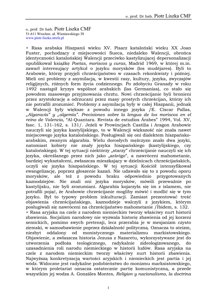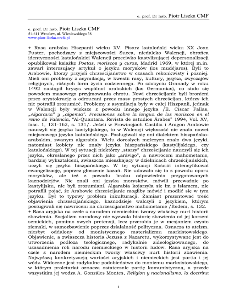 o. prof. Dr hab. Piotr Liszka CMF o. prof. Dr hab. Piotr Liszka CMF 51-611 Wrocław, ul. Wieniawskiego 38 www.piotr-liszka.strefa.pl + Rasa arabska Hiszpanii wieku XV. Pisarz kataloński wieku XX Joan Fuster, pochodzący z miejscowości Sueca, niedaleko Walencji, obrońca identyczności katalońskiej Walencji przeciwko kastylizującej depersonalizacji opublikował książkę Poetas, moriscos y curas, Madrid 1969, w której m.in. zawarł interesujący artykuł o języku morysków (los mudéjares). Byli to Arabowie, którzy przyjęli chrześcijaństwo w czasach rekonkwisty i później. Mieli oni problemy z asymilacją, w kwestii rasy, kultury, języka, zwyczajów religijnych, różnych form życia codziennego. Po zdobyciu Granady w roku 1492 nastąpił kryzys wspólnot arabskich (las Germanías), co stało się powodem masowego przyjmowania chrztu. Nowi chrześcijanie byli bronieni przez arystokrację a odrzucani przez masy prostych chrześcijan, którzy ich nie potrafili zrozumieć. Problemy z asymilacją były w całej Hiszpanii, jednak w Walencji były większe z powodu innego języka /E. Císcar Pallas, „Algaravía” y „algemía”. Precisiones sobre la lengua de los moriscos en el reino de Valencia, “Al-Quantara. Revista de estudios Árabes” 1994, Vol. XV, fasc. 1, 131-162, s. 131/. Jeżeli w Prowincjach Castilia i Aragon Arabowie nauczyli się języka kastylijskiego, to w Walencji większość nie znała nawet miejscowego języka katalońskiego. Posługiwali się oni dialektem hiszpańskoarabskim, zwanym algarabía. Wielu dorosłych mężczyzn znało dwa języki, natomiast kobiety nie znały języka hiszpańskiego (kastylijskiego, czy katalońskiego). W tej sytuacji niektórzy „starzy” chrześcijanie nauczyli się ich języka, określanego przez nich jako „arávigo”, a nawróceni mahometanie, bardziej wykształceni, zwłaszcza mieszkający w dzielnicach chrześcijańskich, uczyli się języka hiszpańskiego. W tej sytuacji Kościół intensyfikował ewangelizację, poprzez głoszenie kazań. Nie udawało się to z powodu oporu morysków, ale też z powodu braku odpowiednio przygotowanych kaznodziejów. Nie znali oni języka morysków, mówili przeważnie po kastylijsku, nie byli zrozumiani. Algarabía kojarzyła się im z islamem, nie potrafili pojąć, że Arabowie chrześcijanie mogliby mówić i modlić się w tym języku. Był to typowy problem inkulturacji. Zamiast prezentować treść objawienia chrześcijańskiego, kaznodzieje walczyli z językiem, którym posługiwali się nawróceni na chrześcijaństwo mahometanie /Ibidem, s. 132. + Rasa aryjska na czele z narodem niemieckim tworzy właściwy nurt historii zbawienia. Socjalizm narodowy nie wyzwala historię zbawienia od jej korzeni semickich, pomimo swych pretensji, lecz przerabia je w mesjanizm czysto ziemski, w samozbawienie poprzez działalność polityczną. Oznacza to ateizm, niezbyt oddalony od monistycznego materializmu markistowskiego. Objawienie, a zwłaszcza historia Jezusa z Nazaretu, wykorzystywane jest do utworzenia podłoża teologicznego, radykalnie zideologizowanego, do uzasadnienia roli narodu niemieckiego w historii ludów. Rasa aryjska na czele z narodem niemieckim tworzy właściwy nurt historii zbawienia. Najwyższą konkretyzacją wartości aryjskich i niemieckich jest partia i jej wódz. Widoczne jest radykalne podobieństwo do monizmu marksistowskiego, w którym proletariat oznacza ostatecznie partię komunistyczną, a przede wszystkim jej wodza A. Gonzáles Montes, Religion y nacionalismo, la doctrina 1 o. prof. Dr hab. Piotr Liszka CMF luterana de los dos reinos como teología civil, Universidad Pontificia de Salamanca, Bibliotheca Salmantinensis, Estudios 51, Salamanca 1982, s. 48. Luterańska teologia dialektyczna lat trzydziestych XX wieku była teologią polityczną, „teologią kryzysu”, pozostając formalnie teologią Słowa, teologia orędzia chrześcijańskiego, skoncentrowana na zbawieniu. Był to swoisty powrót do źródeł protestantyzmu, swoiste poszukiwanie utraconej identyczności, zerwanie z teologią liberalną. Ten nowy nurt, który pojawił się w latach dwudziestych, rozwinął się a latach trzydziestych, miał być nurtem neoortodoksji, naprawiającym odchylenia powstałe już w wieku XVI. Teologowie dialektycy chcieli uratować Reformę od wszelkich odchyleń, a zwłaszcza od skażeń liberalizmu. Chcieli przyjmować nowoczesność w świetle wiary. Doprowadzili do mesjanizacji rasy aryjskiej, co niewiele różni się od idei mesjanizacji klasy społecznej (marksizm) czy ludu (judaizm). Wspólna jest zasada samozbawienia oraz demonizacja historii, co jest niedopuszczalne w judaizmie i w chrześcijaństwie Tamże, s. 49. + Rasa aryjska. Rasową wyższość ariów głosił August Juliusz Langbehn, pochodzenia duńskiego, powołując się na autorytet takich „gotów”, jak Artur de Gobineau i H. S. Chamberlain. Oświetlało go światło austriackiego neotemplariusza Lanza von Liebenfels, a wreszcie idee Alfreda Rosenberga. Mesjanizm germański, który głosił Erlöser nie zrodził się w wysublimowanym umyśle jakiegoś aryjczyka. Był on owocem upojenia się metafizyką niemieckich słów, posiadających swoistą zmysłowość oraz bardziej eterycznych, niemieckich konceptów. H9 144 + Rasa biała Człowiek z Cro-Magnon z paleolitu młodszego, rasy białej, kultury oryniackiej, perigordzkiej, jerzmanowickiej. „Homo sapiens sapiens – „człowiek mądry” lub „rozumny” (nazwa systematyzacyjna nieprecyzyjna, bo „rozumny” mógł być już australopitek) występuje od schyłku plejstocenu w Afryce, Europie, Azji. Jego prakolebką mogły być okolice Jeziora Wiktorii, największego w Afryce i ogromnie ubogaconego biologicznie. Objętość mózgoczaszki 1200-1700 cm3, bez wałów nad oczodołami, żuchwa z bródką, od razu o silnym zróżnicowaniu rasowym, rozwój psychiki, życia zbiorowego, wyższej kultury i religii, posługujący się mową s
