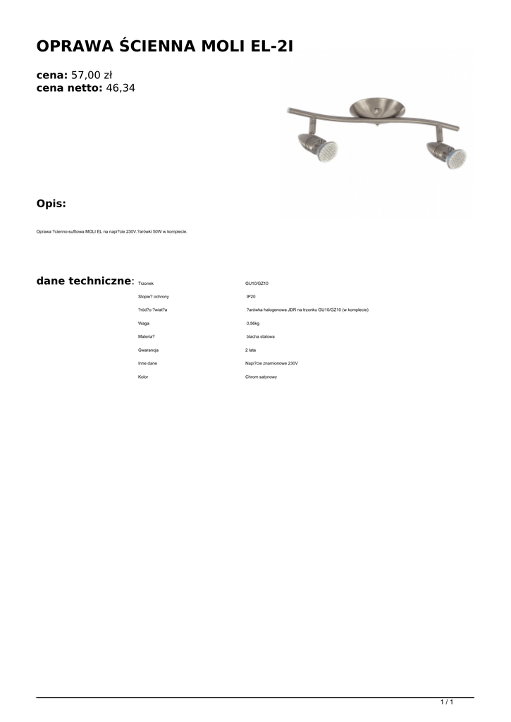 OPRAWA ŚCIENNA MOLI EL-2I cena: 57,00 zł cena netto: 46,34 Opis: Oprawa ?cienno-sufitowa MOLI EL na napi?cie 230V.?arówki 50W w komplecie. dane techniczne: Trzonek GU10/GZ10 Stopie? ochrony IP20 ?ród?o ?wiat?a ?arówka halogenowa JDR na trzonku GU10/GZ10 (w komplecie) Waga 0,56kg Materia? blacha stalowa Gwarancja 2 lata Inne dane Napi?cie znamionowe 230V Kolor Chrom satynowy 1/1