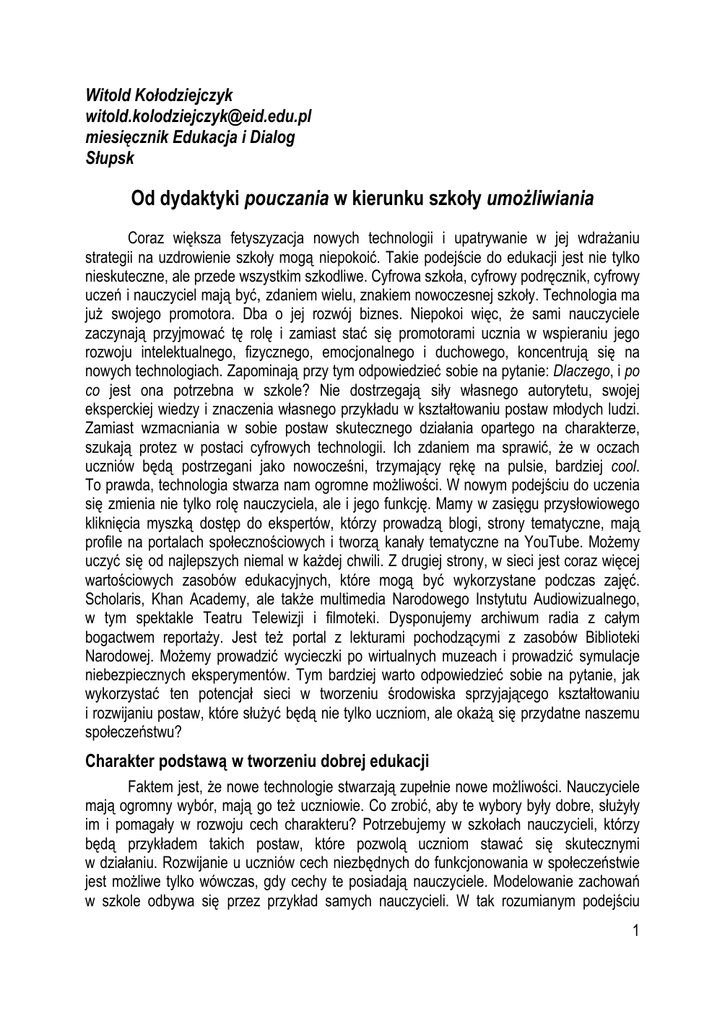 Witold Kołodziejczyk [email protected] miesięcznik Edukacja i Dialog Słupsk Od dydaktyki pouczania w kierunku szkoły umożliwiania Coraz większa fetyszyzacja nowych technologii i upatrywanie w jej wdrażaniu strategii na uzdrowienie szkoły mogą niepokoić. Takie podejście do edukacji jest nie tylko nieskuteczne, ale przede wszystkim szkodliwe. Cyfrowa szkoła, cyfrowy podręcznik, cyfrowy uczeń i nauczyciel mają być, zdaniem wielu, znakiem nowoczesnej szkoły. Technologia ma już swojego promotora. Dba o jej rozwój biznes. Niepokoi więc, że sami nauczyciele zaczynają przyjmować tę rolę i zamiast stać się promotorami ucznia w wspieraniu jego rozwoju intelektualnego, fizycznego, emocjonalnego i duchowego, koncentrują się na nowych technologiach. Zapominają przy tym odpowiedzieć sobie na pytanie: Dlaczego, i po co jest ona potrzebna w szkole? Nie dostrzegają siły własnego autorytetu, swojej eksperckiej wiedzy i znaczenia własnego przykładu w kształtowaniu postaw młodych ludzi. Zamiast wzmacniania w sobie postaw skutecznego działania opartego na charakterze, szukają protez w postaci cyfrowych technologii. Ich zdaniem ma sprawić, że w oczach uczniów będą postrzegani jako nowocześni, trzymający rękę na pulsie, bardziej cool. To prawda, technologia stwarza nam ogromne możliwości. W nowym podejściu do uczenia się zmienia nie tylko rolę nauczyciela, ale i jego funkcję. Mamy w zasięgu przysłowiowego kliknięcia myszką dostęp do ekspertów, którzy prowadzą blogi, strony tematyczne, mają profile na portalach społecznościowych i tworzą kanały tematyczne na YouTube. Możemy uczyć się od najlepszych niemal w każdej chwili. Z drugiej strony, w sieci jest coraz więcej wartościowych zasobów edukacyjnych, które mogą być wykorzystane podczas zajęć. Scholaris, Khan Academy, ale także multimedia Narodowego Instytutu Audiowizualnego, w tym spektakle Teatru Telewizji i filmoteki. Dysponujemy archiwum radia z całym bogactwem reportaży. Jest też portal z lekturami pochodzącymi z zasobów Biblioteki Narodowej. Możemy prowadzić wycieczki po wirtualnych muzeach i prowadzić symulacje niebezpiecznych eksperymentów. Tym bardziej warto odpowiedzieć sobie na pytanie, jak wykorzystać ten potencjał sieci w tworzeniu środowiska sprzyjającego kształtowaniu i rozwijaniu postaw, które służyć będą nie tylko uczniom, ale okażą się przydatne naszemu społeczeństwu? Charakter podstawą w tworzeniu dobrej edukacji Faktem jest, że nowe technologie stwarzają zupełnie nowe możliwości. Nauczyciele mają ogromny wybór, mają go też uczniowie. Co zrobić, aby te wybory były dobre, służyły im i pomagały w rozwoju cech charakteru? Potrzebujemy w szkołach nauczycieli, którzy będą przykładem takich postaw, które pozwolą uczniom stawać się skutecznymi w działaniu. Rozwijanie u uczniów cech niezbędnych do funkcjonowania w społeczeństwie jest możliwe tylko wówczas, gdy cechy te posiadają nauczyciele. Modelowanie zachowań w szkole odbywa się przez przykład samych nauczycieli. W tak rozumianym podejściu 1 nauczyciel nie jest już tylko pasem transmisyjnym w przekazywaniu informacji, ale może skoncentrować się, przede wszystkim, na wspieraniu ucznia w rozwoju jego charakteru, umiejętności i postaw. Uczeń przestaje być tylko biernym odbiorcą wykonującym polecenia, ale przejmuje odpowiedzialność za uczenie się i tworzenie wartościowych projektów. W nowym paradygmacie edukacji nauczyciel nie planuje już za ucznia i nie mówi, co i kiedy ma zrobić, a jedynie stwarza sytuacje, w których uczeń samodzielnie planuje, organizuje i realizuje określone cele. Uczy się je określać, odkrywając w sobie to, co jest jego największym atutem, co stanowi o jego sile – tym, co pozwala codziennie podejmować wysiłek na rzecz własnego rozwoju. Do tego potrzeba jednak określonej postawy i świadomości. Uczniowie, chcąc odnieść sukces, muszą mieć wiedzę o tym, czego pragną, jakimi ludźmi chcą być, co chcą zrobić dla innych. I tu pojawia się nowe zadanie dla nauczyciela. Koncentruje się na pomocy uczniom w uświadamianiu tego, że w życiu liczą się, przede wszystkim, realizacja własnych marzeń, bezwzględne przestrzeganie uniwersalnego kodeksu moralnego. A oprócz troski o intelektualny i fizyczny wymiar naszego funkcjonowania, ważna jest również równowaga między wszystkimi obszarami naszego funkcjonowania, w tym często zaniedbywanym w szkole, obszarem duchowym i emocjonalnym. To nic innego, jak odkrywanie własnego potencjału, docieranie do swojej siły. Zrozumienie tego jest początkiem budowania nowego paradygmatu edukacji, który umożliwia uczniom definiowanie własnych talentów i rozwój ich pod okiem nauczycieli. Silne tendencje do koncentracji na testach sprawiły, że w wielu szkołach zapomniano o aksjologicznym podejściu do zarządzania. Dziś możemy mówić o powrocie refleksji nad rzeczami naprawdę najważniejszymi. Badania przywoływane przez Petersa i Watermana w książce „W poszukiwaniu doskonałości w biznesie” dowodziły, że organizacje, które odwołują się do wyższych wartości, mają większą moc przetrwania. W obliczu wiedzy, dotyczącej kapitału społecznego, warto raz jeszcze, tym razem bardziej realistycznie, powrócić do uznania takiego podejścia, za ważny element funkcjonowania każdej społeczności. Może w tym pomóc postawa samych dyrektorów i nauczycieli, których charakteryzować powinny, nie tylko spójność wewnętrzna, samoświadomość, ale przede wszystkim odwaga i wiedza, że rozbieżność między deklarowanymi a rzeczywistymi wartościami daje skutek odwrotny, niszczy zespół i nawet naraża na śmieszność. Szkoły kierujące się jedynie modą i oczekujące w kilka tygodni spektakularnych efektów, na pewno przeżyją rozczarowanie. Dlaczego? Bo brakuje miejsca na dyskusję, refleksję i chęć zdefiniowania zachowań aranżuj