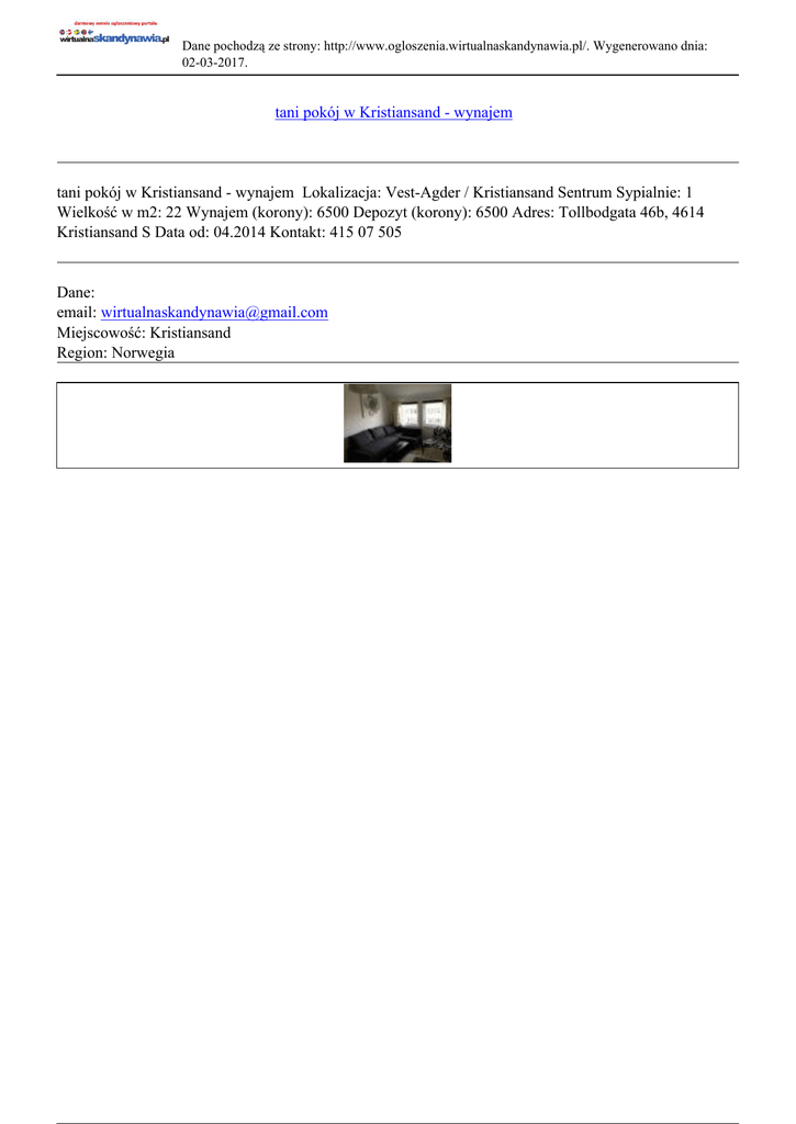 Dane pochodzą ze strony: http://www.ogloszenia.wirtualnaskandynawia.pl/. Wygenerowano dnia: 02-03-2017. tani pokój w Kristiansand - wynajem tani pokój w Kristiansand - wynajem Lokalizacja: Vest-Agder / Kristiansand Sentrum Sypialnie: 1 Wielkość w m2: 22 Wynajem (korony): 6500 Depozyt (korony): 6500 Adres: Tollbodgata 46b, 4614 Kristiansand S Data od: 04.2014 Kontakt: 415 07 505 Dane: email: [email protected] Miejscowość: Kristiansand Region: Norwegia
