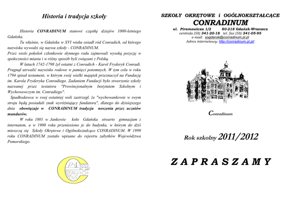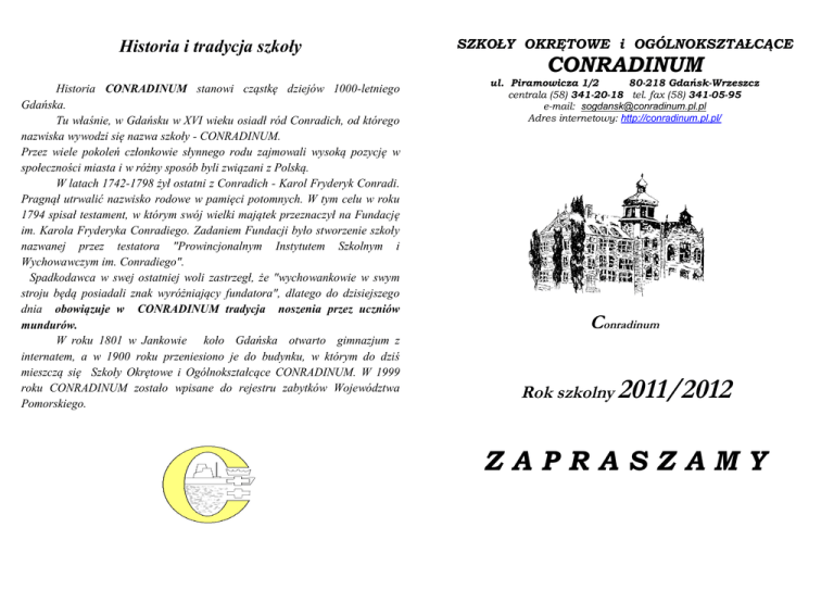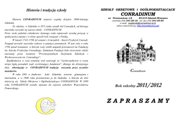 Historia i tradycja szkoły SZKOŁY OKRĘTOWE i OGÓLNOKSZTAŁCĄCE CONRADINUM Historia CONRADINUM stanowi cząstkę dziejów 1000-letniego Gdańska. Tu właśnie, w Gdańsku w XVI wieku osiadł ród Conradich, od którego nazwiska wywodzi się nazwa szkoły - CONRADINUM. Przez wiele pokoleń członkowie słynnego rodu zajmowali wysoką pozycję w społeczności miasta i w różny sposób byli związani z Polską. W latach 1742-1798 żył ostatni z Conradich - Karol Fryderyk Conradi. Pragnął utrwalić nazwisko rodowe w pamięci potomnych. W tym celu w roku 1794 spisał testament, w którym swój wielki majątek przeznaczył na Fundację im. Karola Fryderyka Conradiego. Zadaniem Fundacji było stworzenie szkoły nazwanej przez testatora "Prowincjonalnym Instytutem Szkolnym i Wychowawczym im. Conradiego". Spadkodawca w swej ostatniej woli zastrzegł, że "wychowankowie w swym stroju będą posiadali znak wyróżniający fundatora", dlatego do dzisiejszego dnia obowiązuje w CONRADINUM tradycja noszenia przez uczniów mundurów. W roku 1801 w Jankowie koło Gdańska otwarto gimnazjum z internatem, a w 1900 roku przeniesiono je do budynku, w którym do dziś mieszczą się Szkoły Okrętowe i Ogólnokształcące CONRADINUM. W 1999 roku CONRADINUM zostało wpisane do rejestru zabytków Województwa Pomorskiego. ul. Piramowicza 1/2 80-218 Gdańsk-Wrzeszcz centrala (58) 341-20-18 tel. fax (58) 341-05-95 e-mail: [email protected] Adres internetowy: http://conradinum.pl.pl/ Conradinum Rok szkolny 2011/2012 ZAPRASZAMY XVIII LICEUM PROFILOWANE profil przedmioty, z których oceny końcowe przelicza się na punkty Szanowni Rodzice i Drodzy Uczniowie! Prosimy o zapoznanie się z naszą ofertą i jej życzliwe rozpatrzenie. W niniejszej propozycji pragniemy zwrócić uwagę na: zarządzanie informacją * język polski, język obcy, geografia, informatyka ekonomiczno-administracyjny ** XVIII LICEUM OGÓLNOKSZTAŁCĄCE klasa z przedmiotami w zakresie rozszerzonym język polski, język angielski, historia przedmioty, z których oceny końcowe przelicza się na punkty język polski, język obcy, historia, geografia ( w tej klasie będzie realizowany program matematyki z e-podręcznika) informatyka, matematyka, fizyka język polski, język obcy, matematyka, fizyka biologia, chemia, język angielski język polski, język obcy, biologia, chemia TECHNIKUM Nr 18 klasa w zawodzie przedmioty, z których oceny końcowe przelicza się na punkty Nasze Atuty - ponad 200-letnia historia CONRADINUM, - duży dorobek szkoły w kształceniu technicznym i ogólnokształcącym, - współpraca z PG, skąd pochodzi część kadry, - matematyka realizowana w technikum w zakresie rozszerzonym, - właściwie wykształconą kadrę pedagogiczną, - najlepsze wyniki w nauce w technikum nagradzane przez FORUM OKRĘTOWE wycieczką na Queen Mary, - przyjazna atmosfera, - nowoczesne wyposażenie, - dobra lokalizacja szkoły ze względu na dojazd (tramwaj, autobus, SKM), - zajęcia pozalekcyjne pozwalające rozwijać umiejętności i talenty uczniów, - CONRADINUM jest organizatorem ogólnopolskiego konkursu „Barwy morza”, - uczestnictwo w cyklicznej wystawie BALT-MILITARY-EXPO, - dbałość o zdrowie uczniów (na miejscu pracuje lekarz medycyny ogólnej i pielęgniarka dyplomowana), - możliwość wpływania przez Uczniów i Rodziców na jakość pracy szkoły, Nasze Osiągnięcia technik mechatronik *** język polski, język obcy, matematyka, informatyka technik budownictwa okrętowego*** technik mechanik *** * przedmioty zawodowe: - wyszukiwanie, selekcjonowanie i gromadzenie informacji, - upowszechnianie informacji, - przetwarzanie informacji, **przedmioty zawodowe: - funkcjonowanie firmy w warunkach gospodarki rynkowej, - elementy rachunkowości, - praca biurowa i technika komputerowa, - prawo i postępowanie administracyjne, *** matematyka realizowana w zakresie rozszerzonym Wysokie wyniki kształcenia potwierdzone danymi z Okręgowej Komisji Egzaminacyjnej: - XVIII Liceum Ogólnokształcące w pierwszej dziesiątce gdańskich liceów, - Technikum Nr 18 zajmuje V miejsce wśród szkół technicznych naszego województwa, Wyniki egzaminu maturalnego w roku szkolnym 2009/2010: -Technikum Nr 18:matematyka–I miejsce,język angielski–II miejsce,język polski–VII miejsce, - XVIII LO: matematyka –VIII miejsce,język angielski-IX miejsce,język polski-XI miejsce, - uczniowie LO są laureatami konkursu „Wygraj indeks” na PG i UG oraz finalistami olimpiad, np. XXV Olimpiady Wiedzy Ekologicznej, - posiadamy certyfikaty jakości edukacji w ramach programu PCJE oraz tytuł „Szkoła z Tradycją”, - Rada Miasta Gdańska przyznała szkole Medal Św. Wojciecha za wybitne zasługi dla miasta Gdańska oraz kształcenie na najwyższym poziomie kadr dla gospodarki morskiej, Jeżeli wybierzecie CONRADINUM, zrobimy wszystko, aby nie zawieść Waszego zaufania. Z poważaniem Dyrekcja i Samorząd Uczniowski