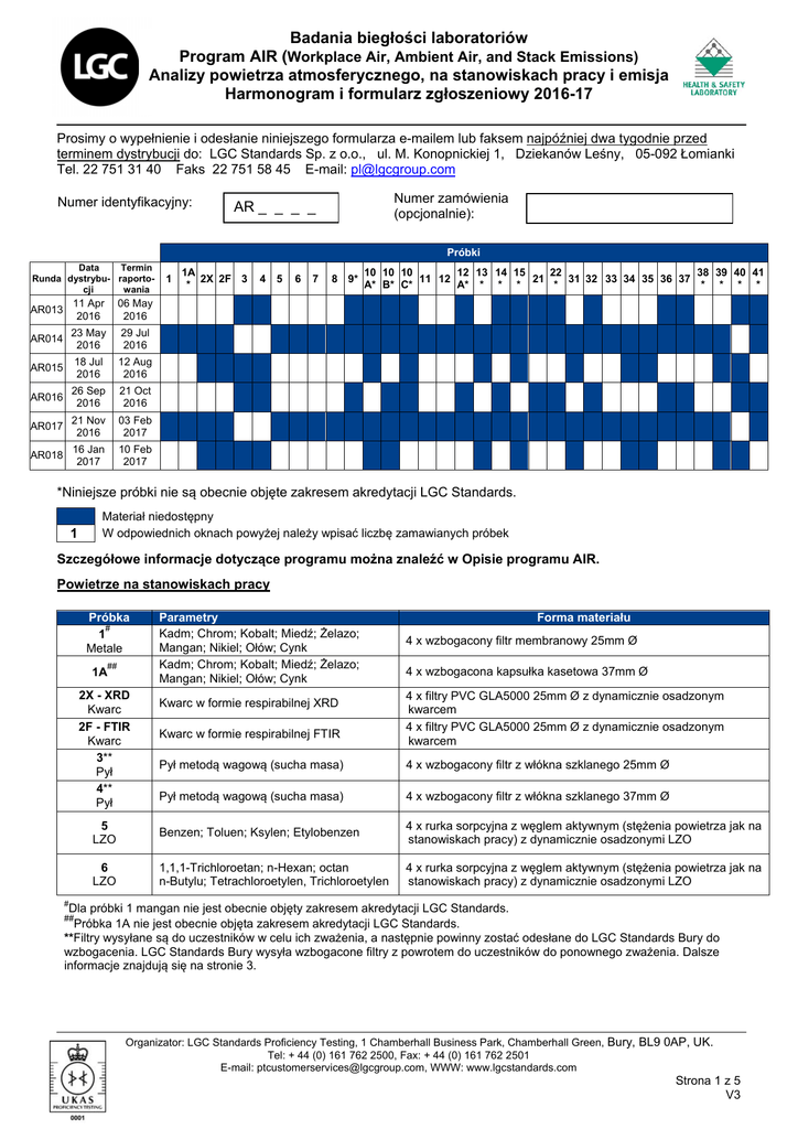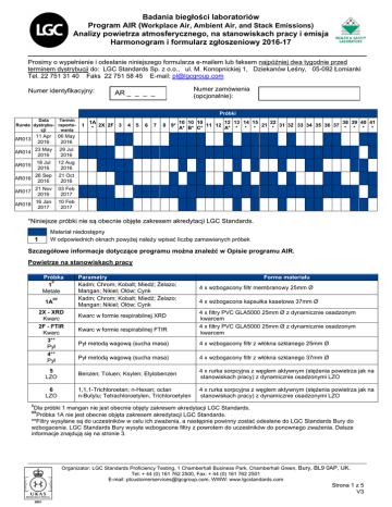 Badania biegłości laboratoriów Program AIR (Workplace Air, Ambient Air, and Stack Emissions) Analizy powietrza atmosferycznego, na stanowiskach pracy i emisja Harmonogram i formularz zgłoszeniowy 2016-17 Prosimy o wypełnienie i odesłanie niniejszego formularza e-mailem lub faksem najpóźniej dwa tygodnie przed terminem dystrybucji do: LGC Standards Sp. z o.o., ul. M. Konopnickiej 1, Dziekanów Leśny, 05-092 Łomianki Tel. 22 751 31 40 Faks 22 751 58 45 E-mail: [email protected] Numer identyfikacyjny: Numer zamówienia (opcjonalnie): AR _ _ _ _ Próbki Data Termin Runda dystrybu- raportocji wania AR013 11 Apr 2016 06 May 2016 AR014 23 May 2016 29 Jul 2016 AR015 18 Jul 2016 12 Aug 2016 AR016 26 Sep 2016 21 Oct 2016 AR017 21 Nov 2016 03 Feb 2017 AR018 16 Jan 2017 10 Feb 2017 1 1A 2X 2F 3 * 4 5 6 7 8 9* 10 10 10 12 13 14 15 22 38 39 40 41 11 12 21 31 32 33 34 35 36 37 A* B* C* A* * * * * * * * * *Niniejsze próbki nie są obecnie objęte zakresem akredytacji LGC Standards. 1 Materiał niedostępny W odpowiednich oknach powyżej należy wpisać liczbę zamawianych próbek Szczegółowe informacje dotyczące programu można znaleźć w Opisie programu AIR. Powietrze na stanowiskach pracy Próbka # 1 Metale ## 1A 2X - XRD Kwarc 2F - FTIR Kwarc 3** Pył 4** Pył Parametry Kadm; Chrom; Kobalt; Miedź; Żelazo; Mangan; Nikiel; Ołów; Cynk Kadm; Chrom; Kobalt; Miedź; Żelazo; Mangan; Nikiel; Ołów; Cynk Kwarc w formie respirabilnej XRD Kwarc w formie respirabilnej FTIR Forma materiału 4 x wzbogacony filtr membranowy 25mm Ø 4 x wzbogacona kapsułka kasetowa 37mm Ø 4 x filtry PVC GLA5000 25mm Ø z dynamicznie osadzonym kwarcem 4 x filtry PVC GLA5000 25mm Ø z dynamicznie osadzonym kwarcem Pył metodą wagową (sucha masa) 4 x wzbogacony filtr z włókna szklanego 25mm Ø Pył metodą wagową (sucha masa) 4 x wzbogacony filtr z włókna szklanego 37mm Ø 5 LZO Benzen; Toluen; Ksylen; Etylobenzen 4 x rurka sorpcyjna z węglem aktywnym (stężenia powietrza jak na stanowiskach pracy) z dynamicznie osadzonymi LZO 6 LZO 1,1,1-Trichloroetan; n-Hexan; octan n-Butylu; Tetrachloroetylen, Trichloroetylen 4 x rurka sorpcyjna z węglem aktywnym (stężenia powietrza jak na stanowiskach pracy) z dynamicznie osadzonymi LZO # Dla próbki 1 mangan nie jest obecnie objęty zakresem akredytacji LGC Standards. Próbka 1A nie jest obecnie objęta zakresem akredytacji LGC Standards. **Filtry wysyłane są do uczestników w celu ich zważenia, a następnie powinny zostać odesłane do LGC Standards Bury do wzbogacenia. LGC Standards Bury wysyła wzbogacone filtry z powrotem do uczestników do ponownego zważenia. Dalsze informacje znajdują się na stronie 3. ## Organizator: LGC Standards Proficiency Testing, 1 Chamberhall Business Park, Chamberhall Green, Bury, BL9 0AP, UK. Tel: + 44 (0) 161 762 2500, Fax: + 44 (0) 161 762 2501 E-mail: [email protected], WWW: www.lgcstandards.com Strona 1 z 5 V3 Badania biegłości laboratoriów Program AIR (Workplace Air, Ambient Air, and Stack Emissions) Analizy powietrza atmosferycznego, na stanowiskach pracy i emisja Harmonogram i formularz zgłoszeniowy 2016-17 Powietrze na stanowiskach pracy (kontynuacja) Próbka 7 LZO 8 Aldehydy Parametry Forma materiału Benzen; Toluen; Ksylen; Etylobenzen 4 x rurka Tenax do desorpcji termicznej (stężenia powietrza jak na stanowiskach pracy) z dynamicznie osadzonymi LZO Formaldehyd, Acetaldehyd 4 x wzbogacony filtr z włókna szklanego 25mm Ø ## 9 Cr (VI) 10A*** Metale 10B*** Ołów Chrom (VI) 4 x wzbogacony filtr Millipore PVDF oczyszczony NaOH 25mm Ø Chrom, Kobalt, Miedź, Żelazo, Mangan, Nikiel, Cynk 1 x próbka pyłu spawalniczego Ołów 1 x próbka pyłu zawierająca ołów 10C*** Metale Kadm, Chrom, Kobalt, Miedź, Żelazo, Mangan, Nikiel, Ołów, Cynk 1 x próbka pyłu zawierająca rudy metali / metale rafinowane ## Laktoza (jako substancja zastępcza dla 15 4 x wzbogacony filtr kwarcowy z włókna szklanego 25mm Ø zanieczyszczeń) Laktoza ## Próbki 9 i 15 nie są obecnie objęte zakresem akredytacji LGC Standards. ***Dla próbki 10A, 10B i10C jeden lub więcej powyższych metali będzie dostępnych w każdej rundzie. Próbki te także nie są obecnie objęte zakresem akredytacji LGC Standards. Powietrze atmosferyczne Próbka Parametry Forma materiału 11 NO2 Dwutlenek azotu (jako azotyny) 4 x rurka Palmes’a do dyfuzji z dynamicznie osadzonym NO2 12 LZO Benzen; Toluen; Ksylen; Etylobenzen 4 x rurka Tenax do desorpcji termicznej (stężenia powietrza atmosferycznego) z dynamicznie osadzonymi LZO Benzen; Toluen; Ksylen; Etylobenzen 4 x rurka Carbopack do desorpcji termicznej (stężenia powietrza atmosferycznego) z dynamicznie osadzonymi LZO Kadm; Nikiel; Ołów; Arsen 4 x wzbogacony filtr kwarcowy z włókna szklanego 47mm Ø ## 12A LZO ## 13 Metale ## 14 Chlorki, Azotany, Siarczany 4 x wzbogacony filtr kwarcowy z włókna szklanego 47mm Ø Aniony na filtrze ## Próbki 12A, 13 i 14 nie są obecnie objęte zakresem akredytacji LGC Standards. Powietrze w pomieszczeniach Próbka Parametry Forma materiału 21 LZO Do 13 składników obejmujących Benzen; (Badanie n-Hexan; Toluen; octan Butylu; MIBK; 4 x rurka Tenax do desorpcji termicznej (stężenia powietrza emisji lotnych Cykloheksanon; p-Ksylen; a-Pinen; Fenol; jak w pomieszczeniach) z dynamicznie osadzonymi LZO związków 124-TMB; Limonen; 4-PCH; Dodekan organicznych) ## Oznaczanie jakościowe LZO 22 w tym alkohol, związki alifatyczne, 2 x rurka Tenax do desorpcji termicznej (stężenia powietrza LZO aromatyczne, halowęglowodorowe, jak w pomieszczeniach) z dynamicznie osadzonymi LZO (Oznaczanie terpenowe, estry jakościowe) ## Próbka 22 nie jest obecnie objęta zakresem akredytacji LGC Standards. Organizator: LGC Standards Proficiency Testing, 1 Chamberhall Business Park, Chamberhall Green, Bury, BL9 0AP, UK. Tel: + 44 (0) 161 762 2500, Fax: + 44 (0) 161 762 2501 E-mail: [email protected], WWW: www.lgcstandards.com Strona 2 z 5 V3 Badania biegłości laboratoriów 