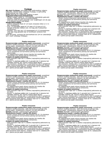 Bij start fruitpap: aanvullen met melkvoeding volgens behoefte. Neemt baby volledige fruitpap, is aanvulling melkvoeding niet meer nodig. Fruit: goed rijp en voldoende variëren in soort. Ongezoet kindermeel of kinderkoek: - Gluten mogen vanaf (4 -) 6 maanden geleidelijk gebruikt worden, ongeacht borst-of kunstvoeding. - Gebruik meel of koek geschikt voor zuigelingen om de pap in te dikken (hoeft niet altijd). Recept halve fruitpap: - enkele eetlepels meel of 1/2 koek (meestal zitten er 2 in één verpakking) - fruit: 1/2 geraspte appel of 1/2 peer of 1/2 kiwi of 1/2 banaan of stukje meloen enz. Je mag ook fruitsoorten combineren. - fruitsap: vers sap van 1/2 sinaasappel of 1/2 pompelmoes (het sap mag gezeefd zijn of eventueel verdund met water). Gaat dit goed, verhoog de hoeveelheid tot 3/4 en uiteindelijk tot 1 (een volledige fruitpap). Fruitpap Papka owocowa Rozpoczynając podawanie papki owocowej: uzupełniać mlekiem według potrzeby. Jeśli niemowlę przyjmuje całą porcję papki, uzupełnianie mlekiem nie jest potrzebne. Owoce: dojrzałe i zróżnicowane gatunkowo Niesłodzone kaszki i ciastka dla dzieci: - Gluten można stopniowo wprowadzać od (4-) 6 miesiąca życia niezależnie od karmienia piersią lub karmienia sztucznego. - Do zagęszczania papki stosuj mączkę lub ciastka dla niemowląt (nie zawsze jest to konieczne). Przepis na papkę owocową: - kilka łyżeczek mąki lub ½ ciastka (najczęściej pakowane są po dwa) - owoce: ½ startego jabłka lub ½ gruszki lub ½ banana lub kawałek melona, itd. Owoce można także łączyć. - sok owocowy: świeży sok z ½ pomarańczy lub ½ grejpfruta (sok można przecedzić lub ewentualnie rozcieńczyć wodą). Jeśli karmienie idzie dobrze, zwiększ ilość do ¾ i ostatecznie do 1 (pełna porcja papki owocowej). Papka owocowa Rozpoczynając podawanie papki owocowej: uzupełniać mlekiem według potrzeby. Jeśli niemowlę przyjmuje całą porcję papki, uzupełnianie mlekiem nie jest potrzebne. Owoce: dojrzałe i zróżnicowane gatunkowo Niesłodzone kaszki i ciastka dla dzieci: - Gluten można stopniowo wprowadzać od (4-) 6 miesiąca życia niezależnie od karmienia piersią lub karmienia sztucznego. - Do zagęszczania papki stosuj mączkę lub ciastka dla niemowląt (nie zawsze jest to konieczne). Przepis na papkę owocową: - kilka łyżeczek mąki lub ½ ciastka (najczęściej pakowane są po dwa) - owoce: ½ startego jabłka lub ½ gruszki lub ½ banana lub kawałek melona, itd. Owoce można także łączyć. - sok owocowy: świeży sok z ½ pomarańczy lub ½ grejpfruta (sok można przecedzić lub ewentualnie rozcieńczyć wodą). Jeśli karmienie idzie dobrze, zwiększ ilość do ¾ i ostatecznie do 1 (pełna porcja papki owocowej). Papka owocowa Rozpoczynając podawanie papki owocowej: uzupełniać mlekiem według potrzeby. Jeśli niemowlę przyjmuje całą porcję papki, uzupełnianie mlekiem nie jest potrzebne. Owoce: dojrzałe i zróżnicowane gatunkowo Niesłodzone kaszki i ciastka dla dzieci: - Gluten można stopniowo wprowadzać od (4-) 6 miesiąca życia niezależnie od karmienia piersią lub karmienia sztucznego. - Do zagęszczania papki stosuj mączkę lub ciastka dla niemowląt (nie zawsze jest to konieczne). Przepis na papkę owocową: - kilka łyżeczek mąki lub ½ ciastka (najczęściej pakowane są po dwa) - owoce: ½ startego jabłka lub ½ gruszki lub ½ banana lub kawałek melona, itd. Owoce można także łączyć. - sok owocowy: świeży sok z ½ pomarańczy lub ½ grejpfruta (sok można przecedzić lub ewentualnie rozcieńczyć wodą). Jeśli karmienie idzie dobrze, zwiększ ilość do ¾ i ostatecznie do 1 (pełna porcja papki owocowej). Papka owocowa Rozpoczynając podawanie papki owocowej: uzupełniać mlekiem według potrzeby. Jeśli niemowlę przyjmuje całą porcję papki, uzupełnianie mlekiem nie jest potrzebne. Owoce: dojrzałe i zróżnicowane gatunkowo Niesłodzone kaszki i ciastka dla dzieci: - Gluten można stopniowo wprowadzać od (4-) 6 miesiąca życia niezależnie od karmienia piersią lub karmienia sztucznego. - Do zagęszczania papki stosuj mączkę lub ciastka dla niemowląt (nie zawsze jest to konieczne). Przepis na papkę owocową: - kilka łyżeczek mąki lub ½ ciastka (najczęściej pakowane są po dwa) - owoce: ½ startego jabłka lub ½ gruszki lub ½ banana lub kawałek melona, itd. Owoce można także łączyć. - sok owocowy: świeży sok z ½ pomarańczy lub ½ grejpfruta (sok można przecedzić lub ewentualnie rozcieńczyć wodą). Jeśli karmienie idzie dobrze, zwiększ ilość do ¾ i ostatecznie do 1 (pełna porcja papki owocowej). Papka owocowa Rozpoczynając podawanie papki owocowej: uzupełniać mlekiem według potrzeby. Jeśli niemowlę przyjmuje całą porcję papki, uzupełnianie mlekiem nie jest potrzebne. Owoce: dojrzałe i zróżnicowane gatunkowo Niesłodzone kaszki i ciastka dla dzieci: - Gluten można stopniowo wprowadzać od (4-) 6 miesiąca życia niezależnie od karmienia piersią lub karmienia sztucznego. - Do zagęszczania papki stosuj mączkę lub ciastka dla niemowląt (nie zawsze jest to konieczne). Przepis na papkę owocową: - kilka łyżeczek mąki lub ½ ciastka (najczęściej pakowane są po dwa) - owoce: ½ startego jabłka lub ½ gruszki lub ½ banana lub kawałek melona, itd. Owoce można także łączyć. - sok owocowy: świeży sok z ½ pomarańczy lub ½ grejpfruta (sok można przecedzić lub ewentualnie rozcieńczyć wodą). Jeśli karmienie idzie dobrze, zwiększ ilość do ¾ i ostatecznie do 1 (pełna porcja papki owocowej). Papka owocowa Rozpoczynając podawanie papki owocowej: uzupełniać mlekiem według potrzeby. Jeśli niemowlę przyjmuje całą porcję papki, uzupełnianie mlekiem nie jest potrzebne. Owoce: dojrzałe i zróżnicowane gatunkowo Niesłodzone kaszki i ciastka dla dzieci: - Gluten można stopniowo wprowadzać od (4-) 6 miesiąca życia niezależnie od karmienia piersią lub karmienia sztucznego. - Do zagęszc