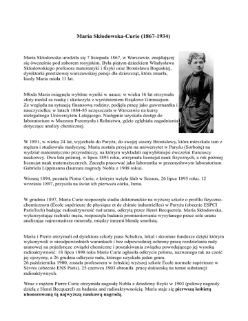 Maria Skłodowska-Curie (1867-1934) Maria Skłodowska urodziła się 7 listopada 1867, w Warszawie, znajdującej się ówcześnie pod zaborem rosyjskim. Była piątym dzieckiem Władysława Skłodowskiego profesora matematyki i fizyki oraz Bronisława Boguskiej, dyrektorki prestiżowej warszawskiej pensji dla dziewcząt, która zmarła, kiedy Maria miała 11 lat. Młoda Maria osiągnęła wybitne wyniki w nauce; w wieku 16 lat otrzymała złoty medal za naukę i ukończyła z wyróżnieniem Rządowe Gimnazjum. Ze względu na sytuację finansową rodziny, podjęła pracę jako guwernantka i nauczycielka; w latach 1884-85 uczęszczała w Warszawie na kursy nielegalnego Uniwersytetu Latającego. Następnie uzyskała dostęp do laboratorium w Muzeum Przemysłu i Rolnictwa, gdzie zgłębiała zagadnienia dotyczące analizy chemicznej. W 1891, w wieku 24 lat, wyjechała do Paryża, do swojej siostry Bronisławy, która mieszkała tam z mężem i studiowała medycynę. Maria została przyjęta na uniwersytet w Paryżu (Sorbonę) na wydział matematyczno przyrodniczy, na którym wykładali najwybitniejsi ówcześni francuscy naukowcy. Dwa lata później, w lipcu 1893 roku, otrzymała licencjat nauk fizycznych, a rok później licencjat nauk matematycznych. Zaczęła pracować jako laborantka w przemysłowym laboratorium Gabriela Lippmanna (laureata nagrody Nobla z 1908 roku). Wiosną 1894, poznała Piotra Curie, z którym wzięła ślub w Sceaux, 26 lipca 1895 roku. 12 września 1897, przyszła na świat ich pierwsza córka, Irena. W grudniu 1897, Maria Curie rozpoczęła studia doktoranckie na wyższej szkole o profilu fizycznochemicznym (École supérieure de physique et de chimie industrielles) w Paryżu (obecnie ESPCI ParisTech) badając radioaktywność rud uranu, odkrytą przez Henri Becquerela. Maria Skłodowska, wykorzystując techniki męża, rozpoczęła badania promieniowania wysyłanego przez sole uranu analizując najrozmaitsze minerały, między innymi blendę smolistą. Maria i Pierre otrzymali od dyrektora szkoły pana Schultza, lokal i skromne fundusze dzięki którym wykonywali w nieodpowiednich warunkach i bez odpowiedniej ochrony pracę rozdzielania rudy uranowej na pojedyncze związki chemiczne i poszukiwania związku powodującego jej wysoką radioaktywność: 18 lipca 1898 roku Marie Curie ogłosiła odkrycie polonu, nazwanego tak na cześć jej ojczyzny, a 26 grudnia odkrycie radu, którego uzyskała jeden gram. 26 października 1900, została profesorem w żeńskiej wyższej szkole École normale supérieure w Sèvres (obecnie ENS Paris). 25 czerwca 1903 obroniła pracę doktorską na temat substancji radioaktywnych. Wraz z mężem Pierre Curie otrzymała nagrodę Nobla z dziedziny fizyki w 1903 (połowę nagrody dzielą z Henri Becquerel) za badania and radioaktywnością. Maria staje się pierwszą kobietą uhonorowaną tą najwyższą naukową nagrodą. Kopia przyznania nagrody Nobla w 1911 roku dla Marii Skłodowskiej-Curie W 1904 roku rodzi się druga córka państwa Curie, Ewa. 19 kwietnia 1906 Piotr ginie w wypadku. W listopadzie przejmuje katedrę fizyki po zmarłym mężu na Sorbonie, stając się pierwszą kobietą wykładającą tym uniwersytecie. W 1909 zostaje profesorem tytularnym fizyki. Maria Curie powróciła do swoich badań nad radioaktywnością i w 1910 roku otrzymała metaliczny rad. 10 grudnia 1911, odebrała drugą nagrodę Nobla, tym razem z chemii, za pracę nad własnościami chemicznymi i fizycznymi polonu i radu oraz za prace dotyczące metod wyodrębniania, oczyszczania i pomiaru aktywności pierwiastków promieniotwórczych. Do dziś jest jedyną osobą, która posiada dwie nagrody Nobla w dwóch różnych dziedzinach naukowych. W 1909 rozpoczęła starania o utworzenie Instytut Radowego, funkcjonującego jako organizacja pożytku publicznego, który miałby być współfinansowany przez Uniwersytet w Paryżu i Instytut Pasteur. Instytut Radowy, obecnie Instytut Curie, gromadzi 3000 badaczy, naukowców lekarzy do walki z rakiem. Oparty na tej samej zasadzie Instytut Radowy został utworzony w 1924 roku w Warszawie, a jego pierwszym dyrektorem została Bronisława, siostra Marii. Maria skłodowskaCurie odwiedziła Instytut w 1932 roku jako honorowa przewodnicząca i ofiarowała nowej placówce gram radu, będący jej własnością. Był on podstawą rozpoczęcia działalności Instytutu. Po wojnie uczona nadal szefowała Instytutowi Radowemu w Paryżu i jednocześnie jeździła po świecie, gdzie pomagała poprzez swoją fundację zakładać medyczne instytuty leczenia chorób nowotworowych. W 1914, w roku ukończenia budowy Instytutu Radowego w Paryżu, 1 sierpnia Francja wypowiedziała wojnę Niemcom. Maria dostrzegła możliwość wykorzystania promieni rentgenowskich do leczenia rannych, wykonując badania bezpośrednio na froncie a nie w szpitalu. Mając do dyspozycji samochód wyposażony w aparaturę rentgenowską i kierowcę-mechanika, wraz z córką, wówczas siedemnastoletnią Ireną, jako asystentką, wyruszyła na front. Maria została szefem wojskowej komórki medycznej, która zajmowała się organizowaniem polowych stacji rentgenograficznych. Do1918 roku stacje w sumie obsłużyły ponad trzy miliony przypadków urazów wśród francuskich żołnierzy. W okresie międzywojnia, Maria Curie kontynuowała badania naukowe. W uznaniu za jej osiągnięcia, jako jedyna kobieta uczestniczyła w Konferencjach Solvayowskich – dorocznych spotkaniach najwybitniejszych uczonych organizowanych w Europie. Uczestnicy I-go kongresu Solvayowskiego w 1911 (tłustym drukiem wyróżniono nazwiska laureatów nagrody Nobla)\; Siedzą (od lewej do prawej) : Walther Nernst, Marcel Brillouin, Ernest Solvay, Hendrik Lorentz, Emil Warburg, Jean Baptiste Perrin, Wilhelm Wien, Maria Curie i Henri Poincaré. Stoją (od lewej do prawej) : Robert Goldschmidt, Max Planck, Heinrich Rubens, Arnold Sommerfeld, Frederick Lindemann, Maurice de Broglie, Martin Knu