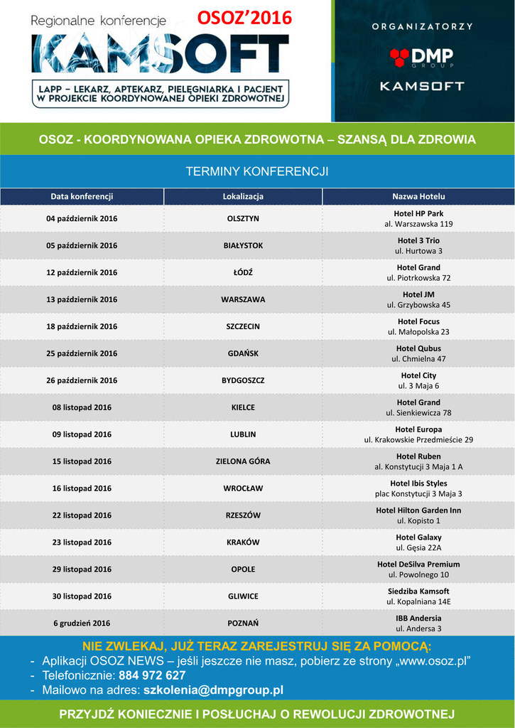 OSOZ’2016 OSOZ - KOORDYNOWANA OPIEKA ZDROWOTNA – SZANSĄ DLA ZDROWIA TERMINY KONFERENCJI Data konferencji Lokalizacja Nazwa Hotelu 04 październik 2016 OLSZTYN Hotel HP Park al. Warszawska 119 05 październik 2016 BIAŁYSTOK Hotel 3 Trio ul. Hurtowa 3 12 październik 2016 ŁÓDŹ Hotel Grand ul. Piotrkowska 72 13 październik 2016 WARSZAWA Hotel JM ul. Grzybowska 45 18 październik 2016 SZCZECIN Hotel Focus ul. Małopolska 23 25 październik 2016 GDAŃSK Hotel Qubus ul. Chmielna 47 26 październik 2016 BYDGOSZCZ Hotel City ul. 3 Maja 6 08 listopad 2016 KIELCE Hotel Grand ul. Sienkiewicza 78 09 listopad 2016 LUBLIN Hotel Europa ul. Krakowskie Przedmieście 29 15 listopad 2016 ZIELONA GÓRA Hotel Ruben al. Konstytucji 3 Maja 1 A 16 listopad 2016 WROCŁAW Hotel Ibis Styles plac Konstytucji 3 Maja 3 22 listopad 2016 RZESZÓW Hotel Hilton Garden Inn ul. Kopisto 1 23 listopad 2016 KRAKÓW Hotel Galaxy ul. Gęsia 22A 29 listopad 2016 OPOLE Hotel DeSilva Premium ul. Powolnego 10 30 listopad 2016 GLIWICE Siedziba Kamsoft ul. Kopalniana 14E 6 grudzień 2016 POZNAŃ IBB Andersia ul. Andersa 3 NIE ZWLEKAJ, JUŻ TERAZ ZAREJESTRUJ SIĘ ZA POMOCĄ: - Aplikacji OSOZ NEWS – jeśli jeszcze nie masz, pobierz ze strony „www.osoz.pl” - Telefonicznie: 884 972 627 - Mailowo na adres: [email protected] PRZYJDŹ KONIECZNIE I POSŁUCHAJ O REWOLUCJI ZDROWOTNEJ OSOZ’2016 FARMACJA ( 9:00 – 12:40) 08:00 – 09:00 Rejestracja gości / Poranna kawa 09:01 – 09:05 Przywitanie Gości 09:06 – 09:25 Koordynowana Opieka Zdrowotna i Opieka Farmaceutyczna w aptece – moda, czy konieczność 09:26 – 10:00 Zarządzanie polityką asortymentową w aptekach i sieciach aptek 10:01 – 10:20 Interaktywne zamawianie towarów w hurtowniach 10:21 – 11:00 Elektroniczna faktura w aptekach i sieciach aptek 11:01 – 11:15 Przerwa kawowa 11:16 – 11:35 Serwisy farmaceutyczne dla pacjenta – Nowy BLOZ, Leki 75+, serwis KtoMaLek, Interakcje 11:36 – 11:55 Obsługa techniczna i serwisowa aptek i sieci aptek - call center, dyżury dobowe 11:56 – 12:20 Wsparcie biznesowe aptek – dotacje unijne, optymalizacja sprzedaży, kursy i szkolenia 12:21 – 12:40 Przerwa lunchowa – Rejestracja uczestników medycznych MEDYCYNA ( 12:41 – 16:20) 12:41 – 12:45 Przywitanie Gości / Poranna kawa 12:46 – 13:05 Koordynowana Opieka Zdrowotna – konieczność, czy nieuchronność 13:06 – 13:25 Przygotowanie systemów informatycznych do zmian w NFZ 13:26 – 13:45 Przychodnia w opiece koordynowanej na platformie BLUE HEALTH 13:46 – 14:05 Rozwiązania mobilne i chmurowe dla szpitali i ambulatoriów (obchód mobilny) 14:06 – 14:25 Rozwiązania mobilne i chmurowe dla przychodni (OSOZ, SERUM, wizyta mobilna) 14:26 – 14:40 Przerwa kawowa 14:41 – 15:00 Rozwiązania mobilne i chmurowe dla pielęgniarek i położnych, Recepty pielęgniarskie 15:01 – 15:20 Serwisy medyczne dla pacjenta – e-Rezerwacja, e-Wyniki, VisiMed 15:21 – 15:40 Bazy medyczne w praktyce lekarza – Nowy BLOZ, Leki 75+, serwis KtoMaLek, Interakcje 15:41 – 16:00 Obsługa techniczna i serwisowa podmiotów medycznych - call center, dyżury, rozliczenia NFZ 16:01 – 16:20 Wsparcie biznesowe placówek medycznych – dotacje unijne, kursy i szkolenia 16:21 Zakończenie, Ankieta – zaproszenie na Międzynarodowy Kongres OSOZ’2017 w Katowicach