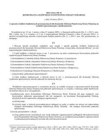 DECYZJA NR 19 KOMENDANTA GŁÓWNEGO PAŃSTWOWEJ STRAŻY POŻARNEJ z dnia 10 marca 2016 r. w sprawie środków budżetowych przeznaczonych dla Komendy Głównej Państwowej Straży Pożarnej na wydatki reprezentacyjne i okolicznościowe Na podstawie art. 53 ust. 1 ustawy z dnia 27 sierpnia 2009 r. o finansach publicznych (Dz. U. z 2013 r. poz. 885, z późn. zm.1)), w związku z § 3 ust. 4 rozporządzenia Ministra Finansów z dnia 15 stycznia 2014 r. w sprawie szczegółowego sposobu wykonywania budżetu państwa (Dz. U. z 2016 r. poz. 69), postanawiam, co następuje: § 1. 1. Decyzja określa przedmiot wydatków oraz zasady i sposób podziału środków budżetowych przeznaczonych dla Komendy Głównej Państwowej Straży Pożarnej, zwanej dalej „Komendą Główną”, na cele reprezentacyjne i okolicznościowe. 2. Część środków, o których mowa w ust. 1, przeznacza się niżej wymienionym kierownikom jednostek organizacyjnych Państwowej Straży Pożarnej: 1) Komendantowi Centralnej Szkoły Państwowej Straży Pożarnej w Częstochowie, 2) Komendantowi Szkoły Aspirantów Państwowej Straży Pożarnej w Krakowie, 3) Komendantowi Szkoły Aspirantów Państwowej Straży Pożarnej w Poznaniu, 4) Komendantowi Szkoły Podoficerskiej Państwowej Straży Pożarnej w Bydgoszczy, 5) Dyrektorowi Centralnego Muzeum Pożarnictwa w Mysłowicach – zwanych dalej „jednostkami uprawnionymi”. 2. Limit środków budżetowych, o których mowa w ust. 1, przeznaczonych dla Komendy Głównej i jednostek uprawnionych, określa załącznik do niniejszej decyzji. § 2. Wydatkami reprezentacyjnymi w rozumieniu decyzji, są wydatki związane z reprezentowaniem Komendy Głównej Państwowej Straży Pożarnej lub jednostek uprawnionych, w związku z realizacją zadań służbowych, do których zalicza się w szczególności: 1) podejmowanie przez Komendanta Głównego Państwowej Straży Pożarnej lub jego zastępców oraz kierowników jednostek uprawnionych lub ich zastępców, na terytorium Rzeczypospolitej Polskiej, przybyłych na ich zaproszenie, delegacji zagranicznych: a) niższej rangi, b) wyższej rangi, w których przewodniczącym delegacji są osoby w randze nie niższej niż odpowiednio Zastępca Komendanta Głównego Państwowej Straży Pożarnej lub zastępca kierownika jednostki uprawnionej; 2) koszty poczęstunków z okazji: a) świąt państwowych, kościelnych oraz świąt jednostek organizacyjnych podległych lub nadzorowanych przez Komendanta Głównego Państwowej Straży Pożarnej, za wyjątkiem poczęstunków organizowanych w jednostkach prowadzących żywienie dla osób skoszarowanych, 1) Zmiany wymienionej ustawy zostały ogłoszone w Dz.U. z 2013 r. poz. 938 i 1646, z 2014 r. poz. 379, 911, 1146, 1626 i 1877, z 2015 r. poz. 238, 532, 1045, 1117, 1130, 1189, 1190, 1269, 1358, 1513, 1830, 1854, 1890 i 2150 oraz z 2016 r. poz. 195. b) oficjalnych wizyt przedstawicieli organów administracji publicznej i hierarchii kościelnej oraz narad i odpraw służbowych kadry kierowniczej Państwowej Straży Pożarnej; 3) zakup artykułów spożywczych na realizację zadań służbowych przez Komendanta Głównego Państwowej Straży Pożarnej, Zastępców Komendanta Głównego Państwowej Straży Pożarnej, Dyrektorów i zastępców biur Komendy Głównej Państwowej Straży Pożarnej oraz Pełnomocnika ds. ochrony informacji niejawnych i jednostek uprawnionych; 4) zakup drobnych upominków i koszty usług dokonywanych na podstawie indywidualnych decyzji Komendanta Głównego Państwowej Straży Pożarnej lub kierownika jednostki uprawnionej, w granicy posiadanych na ten cel środków budżetowych, których jednorazowa wartość nie powoduje obowiązku podatkowego, zgodnie z ustawą z dnia 26 lipca 1991 r. o podatku dochodowym od osób fizycznych (Dz. U. z 2012 r. poz. 361, z późn. zm.2)) określoną ustawowo wartością nieodpłatnego świadczenia, otrzymanego od świadczeniodawcy, w związku z jego promocją lub reklamą. § 3. 1. Wydatki, o których mowa w § 2 pkt 1 lit. a, obliczane są wg następujących zasad: 1) środki przeznaczone na spotkanie powitalne lub pożegnalne: KS = Ls x Z x 5 gdzie: KS – szacunkowe koszty spotkania powitalno/pożegnalnego; Ls – liczba osób biorących udział w spotkaniu (obliczana w następujący sposób: Ls = liczba członków delegacji zagranicznej + po jednej osobie towarzyszącej dla osoby z delegacji zagranicznej + opiekun delegacji + tłumacz); Z – norma wyżywienia określona w § 1 ust.1 pkt 1 Decyzji Nr 2/08 Dyrektora Departamentu Bezpieczeństwa Publicznego MSWiA i Dyrektora Departamentu Budżetu MSWiA z dnia 21 sierpnia 2008 r. w sprawie określenia wartości pieniężnych norm wyżywienia oraz sposobu ich stosowania dla strażaków Państwowej Straży Pożarnej, policjantów, funkcjonariuszy Straży Granicznej i funkcjonariuszy Biura Ochrony Rządu zwanej dalej „Decyzją Nr 2/08”; 2) środki przeznaczone na wyżywienie: KW = Ld x Z x 5 x D gdzie: KW – szacunkowe koszty przeznaczone na wyżywienie; Ld - liczba osób biorących udział w spotkaniu (obliczana w następujący sposób: Ld = liczba członków delegacji zagranicznej + opiekun delegacji + tłumacz), Z – norma wyżywienia określona w § 1 ust.1 pkt 1 Decyzji Nr 2/08, D – liczba dni, w których delegacja zagraniczna przebywa na terytorium Rzeczypospolitej Polskiej; 3) pozostałe świadczenia, w szczególności opłaty za usługi turystyczne, zakwaterowanie, przejazdy, upominki, tłumaczenia oraz inne uzasadnione wydatki zatwierdzone przez Komendanta Głównego Państwowej Straży Pożarnej lub kierownika jednostki uprawnionej do wysokości poniesionych kosztów. 2. Wydatki, o których mowa w § 2 pkt 1 lit. b, obliczane są według następujących zasad: 1) środki przeznaczone na spotkanie powitalne lub pożegnalne: KS = Ls x Z x 5 x 2 2) Zmiany wymienionej ustawy zostały ogłoszone w Dz. U. z 2012 r. poz. 362, poz. 596, poz. 769, poz. 1278, 1342, 1448, 1529, 1540,