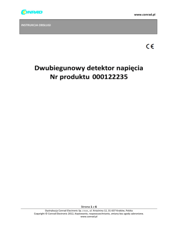 www.conrad.pl INSTRUKCJA OBSŁUGI Dwubiegunowy detektor napięcia Nr produktu 000122235 Strona 1 z 6 Dystrybucja Conrad Electronic Sp. z o.o., ul. Kniaźnina 12, 31-637 Kraków, Polska Copyright © Conrad Electronic 2012, Kopiowanie, rozpowszechnianie, zmiany bez zgody zabronione. www.conrad.pl www.conrad.pl WSTĘP Szanowni klienci, kupując produkt firmy Voltcraft® dokonaliście Państwo doskonałego wyboru, za który pragniemy Wam podziękować. Nabyliście Państwo produkt ponadprzeciętnej jakości, marki znanej w dziedzinie pomiarów, ładowania i technologii sieciowych z zapewniania swoim klientom szerokiej wiedzy oraz ciągle rozwijające się gamy produktów. Dzięki produktom Voltcraft®, możecie Państwo rozwiązywać najtrudniejsze zadania jako ambitny hobbista lub użytkownik profesjonalny, Voltcraft® oferuje niezawodną technologię po doskonale dobranej cenie do jakości. Jesteśmy przekonani że pierwszy zakupiony przez Państwa produkt Voltcraft nie będzie ostatnim produktem naszej firmy. Mamy nadzieję, że nowy produkt Voltcraft® będzie dobrze Państwu służył Przeznaczenie do użycia Dwubiegunowy detektor napięcia służy do wskazywania napięcia stałego 12 do 690V i napięcia zmiennego 12 do 400V. Napięcia określane są w 9 zakresach. Biegunowość zmierzonego napięcia jest wyświetlana. Detektory napięcia zachowują zgodność z normą dla dwubiegunowych detektorów napięcia (EN 61243-3) oraz z klasą ochrony IP64 (ochrona przed kroplami wody i pyłem) i mogą być używane na zewnątrz budynków oraz w warunkach wilgotnych (także w czasie deszczu). W celu kompensacji napięć fantomowych można dokonać pomiaru niskiej impedancji. W tym przypadku obwód pomiarowy obciążono <200 kiloomów. Model VC-54 posiada także dźwiękowy i graficzny tester ciągłości, wbudowaną lampkę pomiarową oraz funkcję detektora fazowego jednobiegunowego. Funkcje dodatkowe wymagają dwóch mikro baterii typu AAA. Wskaźnik obrotowy kierunku pola służy ponadto dla prądowych sieci trójfazowych. Detektory napięcia mogą być używane dla systemów napięciowych klasy 3 (KAT III = domowe układy elektryczne). W trakcie procedury pomiarowej, detektor napięcia można trzymać wyłącznie za rączki. Pole ekranu nie może być zasłonięte a styki metalowe i punkty pomiarowe nie mogą być dotykane. Opis poszczególnych części (patrz składana okładka) 1 Końcówka testowa L1 (-) 2 Przycisk L1 3 Rączka L1 z wyraźnym zakończeniem 4 Kabel połączeniowy 5 Zasobnik baterii (tylko VC-54) 6 Rączka L2 z wyraźnym zakończeniem 7 Przycisk do oświetlenia punktu pomiarowego (tylko VC-54) 8 Przycisk L2 9 Wyświetlacz pola 10 Oświetlenie punktu pomiarowego (tylko VC-54) 11 Końcówka testowa L2 (+) Wyświetlacz pola dla VC-54 A Diody do pomiaru napięcia Strona 2 z 6 Dystrybucja Conrad Electronic Sp. z o.o., ul. Kniaźnina 12, 31-637 Kraków, Polska Copyright © Conrad Electronic 2012, Kopiowanie, rozpowszechnianie, zmiany bez zgody zabronione. www.conrad.pl www.conrad.pl B Wyświetlacz fazy dla testu napięcia jednobiegunowego C Ekran niskiej impedancji 200 kiloomów D Ekran kierunku pola obrotowego (L/R) E Ekran testu ciągłości F Ekran biegunowości dla 12 V i większych Wyświetlacz pola dla VC-52 G Diody do pomiaru napięcia H Ekran niskiej impedancji 200 kiloomów I Ekran biegunowości dla 12 V i większych Objaśnienie symboli Detektor napięcia wyświetla następujące symbole: Napięcie stałe i zmienne Napięcie zmienne (AC) Napięcie stałe biegun dodatni (DC) Napięcie stałe biegun ujemny (DC) Wyświetlacz fazy od 100 do 400 V ~ 50/60 Hz przy użyciu jako tester fazy jednobiegunowy Symbol testu ciągłości Obrotowy wyświetlacz pola zgodnie z ruchem wskazówek zegara Obrotowy wyświetlacz pola przeciwnie do ruchu wskazówek zegara Urządzenie do prac wykonywanych przy występującym napięciu Wkładanie i wymiana baterii (tylko VC54) Detektor napięcia głównie działa jako dwubiegunowy detektor napięcia bez zasilania z baterii. Aby móc wykorzystywać funkcje dodatkowe takie jak oświetlenie punktu pomiarowego, test obrotowy pola, test ciągłości lub tester fazy jednobiegunowej, wymagane są dwie mikrobaterie typu AAA (dołączone do dostawy). Postępuj następująco, aby włożyć lub wymienić baterie: • Odkręć śrubę na pokrywce zasobnika baterii (5) odpowiednim śrubokrętem i wyjmij ją. • Włóż dwie mikrobaterie (AAA) do zasobnika baterii. Przestrzegaj oznakowań biegunów znajdujących się w zasobniku baterii. W miarę możliwości używaj baterii alkalicznych zapewniających dłuższą żywotność. • Następnie ostrożnie zamknij pokrywę zasobnika baterii i przykręć śrubę. Baterie należy wymienić kiedy żółty wskaźnik (E) przestanie się zaświecać po zetknięciu się dwóch końcówek testowych (1 i 11) i nie będzie generowany żaden sygnał dźwiękowy. Puste baterie nie mają wpływu na dokładność wyświetlacza napięcia. Aby nie dopuścić do uszkodzenia detektora wskutek cieknących baterii, wyjmij baterie z urządzenia, jeśli przez dłuższy czas nie będzie ono używane. Z tego samego względu zalecamy natychmiastowe wyjęcie zużytych baterii. Oświetlenie punktu pomiarowego Model VC54 posiada zasilaną z baterii funkcję podświetlenia punktu pomiarowego. Przyciśnij przycisk (7) aby włączyć oświetlenie. Dopóki przycisk pozostaje wciśnięty, oświetlenie pozostaje włączone. Po Strona 3 z 6 Dystrybucja Conrad Electronic Sp. z o.o., ul. Kniaźnina 12, 31-637 Kraków, Polska Copyright © Conrad Electronic 2012, Kopiowanie, rozpowszechnianie, zmiany bez zgody zabronione. www.conrad.pl www.conrad.pl zwolnieniu przycisku, światło zgaśnie. Przycisk oświetlenia zbudowany jest w ten sposób, że może pozostawać wciśnięty w trakcie wykonywania pomiaru niskiej impedancji. Przeprowadzanie pomiaru Dwubiegunowy detektor napięcia składa się z dwóch końcówek testowych (1 + 11), kabla połączenio