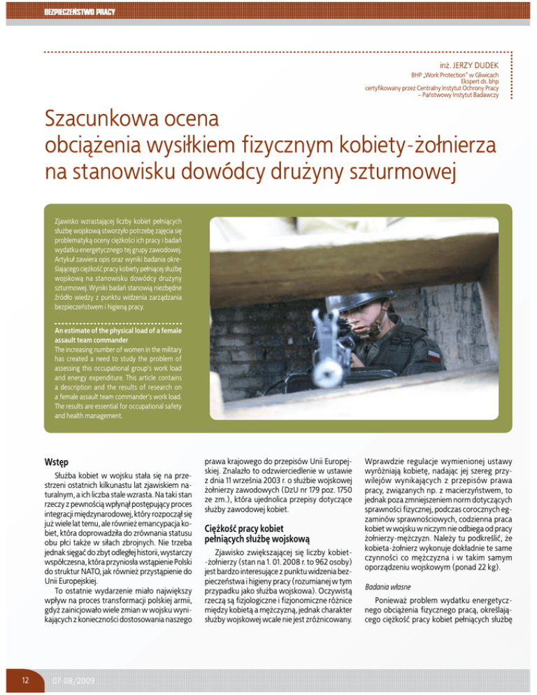 in¿. JERZY DUDEK BHP „Work Protection” w Gliwicach Ekspert ds. bhp certyfikowany przez Centralny Instytut Ochrony Pracy – Pañstwowy Instytut Badawczy Szacunkowa ocena obci¹¿enia wysi³kiem fizycznym kobiety-¿o³nierza na stanowisku dowódcy dru¿yny szturmowej Zjawisko wzrastaj¹cej liczby kobiet pe³ni¹cych s³u¿bê wojskow¹ stworzy³o potrzebê zajêcia siê problematyk¹ oceny ciê¿kości ich pracy i badañ wydatku energetycznego tej grupy zawodowej. Artyku³ zawiera opis oraz wyniki badania określaj¹cego ciê¿kośæ pracy kobiety pe³ni¹cej s³u¿bê wojskow¹ na stanowisku dowódcy dru¿yny szturmowej. Wyniki badañ stanowi¹ niezbêdne źród³o wiedzy z punktu widzenia zarz¹dzania bezpieczeñstwem i higien¹ pracy. An estimate of the physical load of a female assault team commander The increasing number of women in the military has created a need to study the problem of assessing this occupational group’s work load and energy expenditure. This article contains a description and the results of research on a female assault team commander’s work load. The results are essential for occupational safety and health management. Wstêp S³u¿ba kobiet w wojsku sta³a siê na przestrzeni ostatnich kilkunastu lat zjawiskiem naturalnym, a ich liczba stale wzrasta. Na taki stan rzeczy z pewności¹ wp³yn¹³ postêpuj¹cy proces integracji miêdzynarodowej, który rozpocz¹³ siê ju¿ wiele lat temu, ale równie¿ emancypacja kobiet, która doprowadzi³a do zrównania statusu obu p³ci tak¿e w si³ach zbrojnych. Nie trzeba jednak siêgaæ do zbyt odleg³ej historii, wystarczy wspó³czesna, która przynios³a wst¹pienie Polski do struktur NATO, jak równie¿ przyst¹pienie do Unii Europejskiej. To ostatnie wydarzenie mia³o najwiêkszy wp³yw na proces transformacji polskiej armii, gdy¿ zainicjowa³o wiele zmian w wojsku wynikaj¹cych z konieczności dostosowania naszego 12 07-08/2009 prawa krajowego do przepisów Unii Europejskiej. Znalaz³o to odzwierciedlenie w ustawie z dnia 11 września 2003 r. o s³u¿bie wojskowej ¿o³nierzy zawodowych (DzU nr 179 poz. 1750 ze zm.), która ujednolica przepisy dotycz¹ce s³u¿by zawodowej kobiet. Ciê¿kośæ pracy kobiet pe³ni¹cych s³u¿bê wojskow¹ Zjawisko zwiêkszaj¹cej siê liczby kobiet-¿o³nierzy (stan na 1. 01. 2008 r. to 962 osoby) jest bardzo interesuj¹ce z punktu widzenia bezpieczeñstwa i higieny pracy (rozumianej w tym przypadku jako s³u¿ba wojskowa). Oczywist¹ rzecz¹ s¹ fizjologiczne i fizjonomiczne ró¿nice miêdzy kobiet¹ a mê¿czyzn¹, jednak charakter s³u¿by wojskowej wcale nie jest zró¿nicowany. Wprawdzie regulacje wymienionej ustawy wyró¿niaj¹ kobietê, nadaj¹c jej szereg przywilejów wynikaj¹cych z przepisów prawa pracy, zwi¹zanych np. z macierzyñstwem, to jednak poza zmniejszeniem norm dotycz¹cych sprawności fizycznej, podczas corocznych egzaminów sprawnościowych, codzienna praca kobiet w wojsku w niczym nie odbiega od pracy ¿o³nierzy-mê¿czyzn. Nale¿y tu podkreśliæ, ¿e kobieta-¿o³nierz wykonuje dok³adnie te same czynności co mê¿czyzna i w takim samym oporz¹dzeniu wojskowym (ponad 22 kg). Badania w³asne Poniewa¿ problem wydatku energetycznego obci¹¿enia fizycznego prac¹, określaj¹cego ciê¿kośæ pracy kobiet pe³ni¹cych s³u¿bê wojskow¹ jest interesuj¹cy, autor postanowi³ przeprowadziæ w³asn¹, szacunkow¹ ocenê ilości kalorii spalanych przez kobiety podczas tej pracy. Ocena zosta³a przeprowadzona w odniesieniu do kobiety-¿o³nierza, na stanowisku dowódcy dru¿yny szturmowej, w celu określenia ciê¿kości wykonywanej pracy, co jest punktem wyjścia, np. do podejmowania pewnych decyzji dotycz¹cych zarz¹dzania bhp. Bior¹c pod uwagê specyfikê bran¿y, by³oby niemo¿liwe przeprowadzenie badania wielkości wydatku energetycznego metod¹ pomiaru wentylacji p³uc, zatem przeprowadzono j¹ metod¹ szacunkow¹ (chronometra¿owo-tabelaryczn¹). Metoda ta polega g³ównie na opracowaniu chronometra¿u s³u¿by wojskowej, który uwzglêdnia: rodzaj i czas wykonywanych czynności podczas dnia roboczego, obci¹¿enie osoby badanej podczas wykonywania tych czynności oraz pozycjê przy pracy. Narzêdziami wykorzystanymi w tej pracy badawczej by³y tablice: „Wartości wydatku energetycznego przy ró¿nych czynnościach” – niemieckich badaczy Spitzera i Hettingera [1, 2], „Uproszczona metoda szacowania wydatku energetycznego podczas pracy” Lehmanna [1, 3] oraz listy kontrolne do chronometra¿u czasu pracy (opracowanie w³asne). W niektórych sytuacjach brak w wymienionych tablicach odpowiednich czynności i przypisanych im wartości wydatku energetycznego Tabela 1 MIESIÊCZNY PLAN ZAJÊÆ DRU¯YNY SZTURMOWEJ Lp. Rodzaj zajêæ Liczba godzin w miesi¹cu Miejsce zajêæ Uwagi 1. Musztra 8 teren jednostki, plac apelowy 2. Zajêcia z wychowania fizycznego 16 hala sportowa, stadion sportowy gimnastyka, æwiczenia si³owe i sprawnościowe, atletyka terenowa 3. Zajêcia strzeleckie 28 rejon strzelnicy garnizonowej 21 h – nauka i 7 h strzelania 4. Zajêcia taktyczne 28 garnizonowy ośrodek szkolenia – 5. Budowa i eksploatacja urz¹dzeñ oraz sprzêtu 8 teren jednostki – 6. Terenoznawstwo 7 garnizonowy ośrodek szkolenia – 7. Zajêcia sanitarne – pierwsza pomoc na polu walki 8 teren jednostki, garnizonowy ośrodek szkolenia – 8. Zajêcia teoretyczne 30 teren jednostki – 9. Zajêcia inne zwi¹zane ze s³u¿b¹ 43 teren jednostki – – wymaga³ w³asnego oszacowania wydatku przybli¿onego do wartości w tablicach, odpowiadaj¹cego czynności wykonywanej przez osobê badan¹. Z uwagi na ró¿norodnośæ zadañ ¿o³nierza do badañ przyjêto cykl miesiêczny, a nastêpnie po podliczeniu wartości koñcowych uśredniono wydatek energetyczny (w kcal na zmianê robocz¹), poniewa¿ w zale¿ności od rodzaju zajêæ wystêpuj¹ znaczne ró¿nice tego wydatku w poszczególnych dniach. Przyjêty cykl badawczy (miesiêczny) odbywa³ siê 